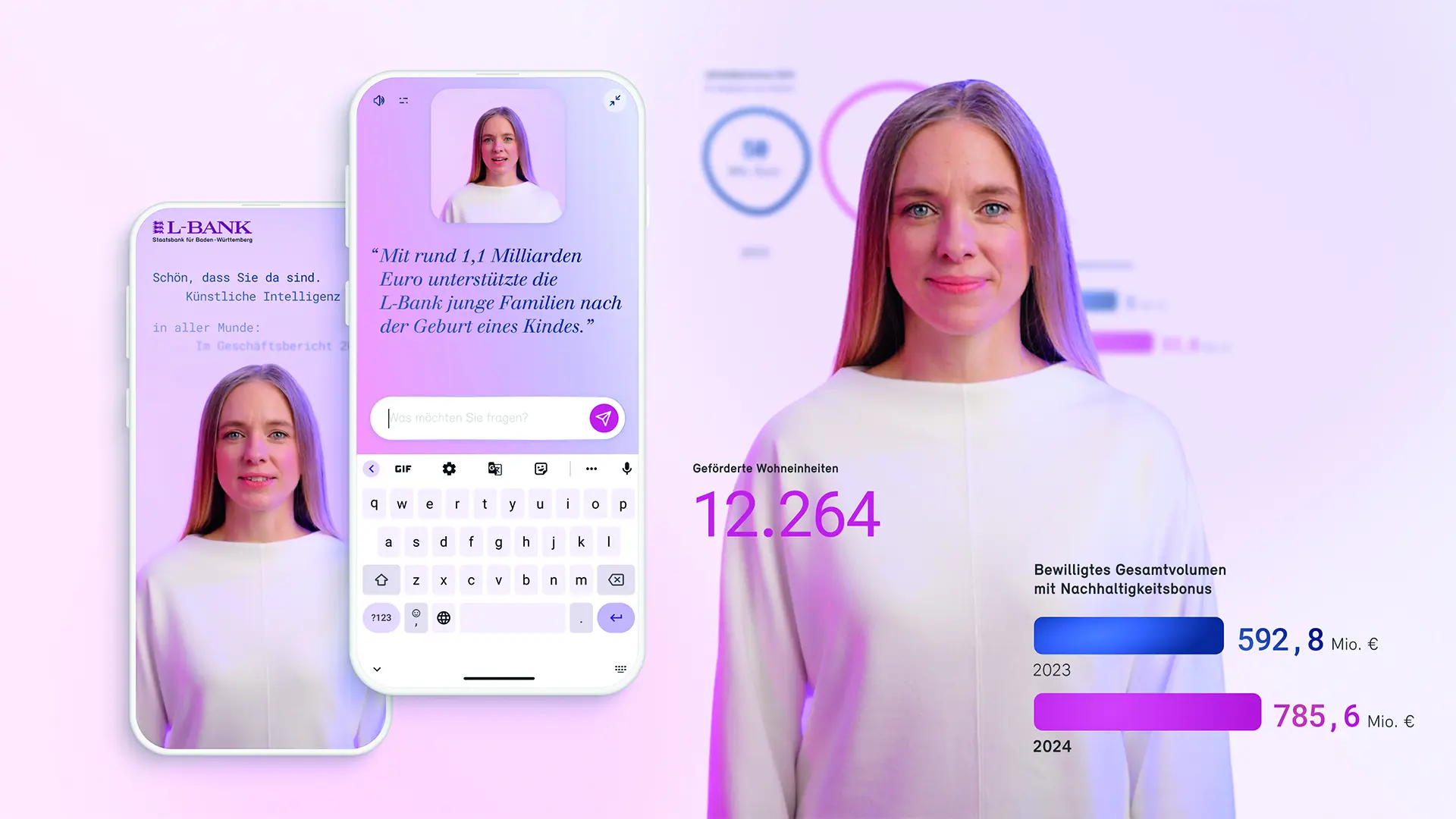 Lack of online service? With the L-Bank Annual Report 2024, we have moved past that. Together with Jung von Matt NECKAR, we developed LEA, an AI avatar that interactively guides through the content and redefines brand and user experience. LEA responds both verbally and in writing, refers to text passages and presents graphics. Thanks to real-time avatar streaming and a custom-trained large language model for this purpose, she acts quickly and intelligently, while also being approachable and accessible. Her appearance is based on the look of L-Bank employees – which makes her particularly human-like or as we say: humAIn.