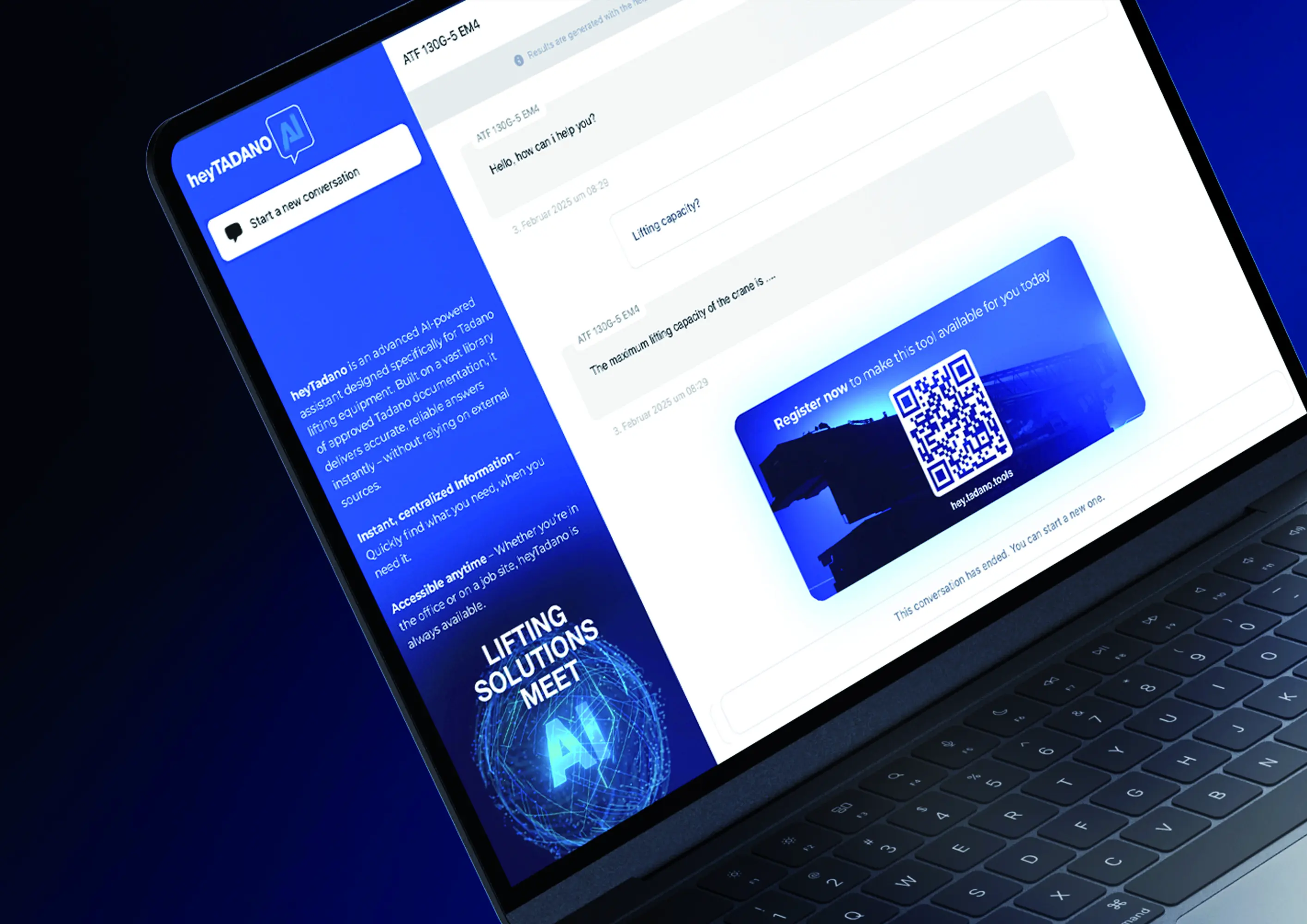 heyTADANO is an advanced AI-powered assistant developed by GDC Media & Design, including the heyTADANO brand specifically for Tadano lifting devices. Based on an extensive library of approved Tadano documents, it instantly provides accurate, reliable answers in over 50 languages without relying on external sources. Instantly available, centralized information. Whatever and whenever it is needed!