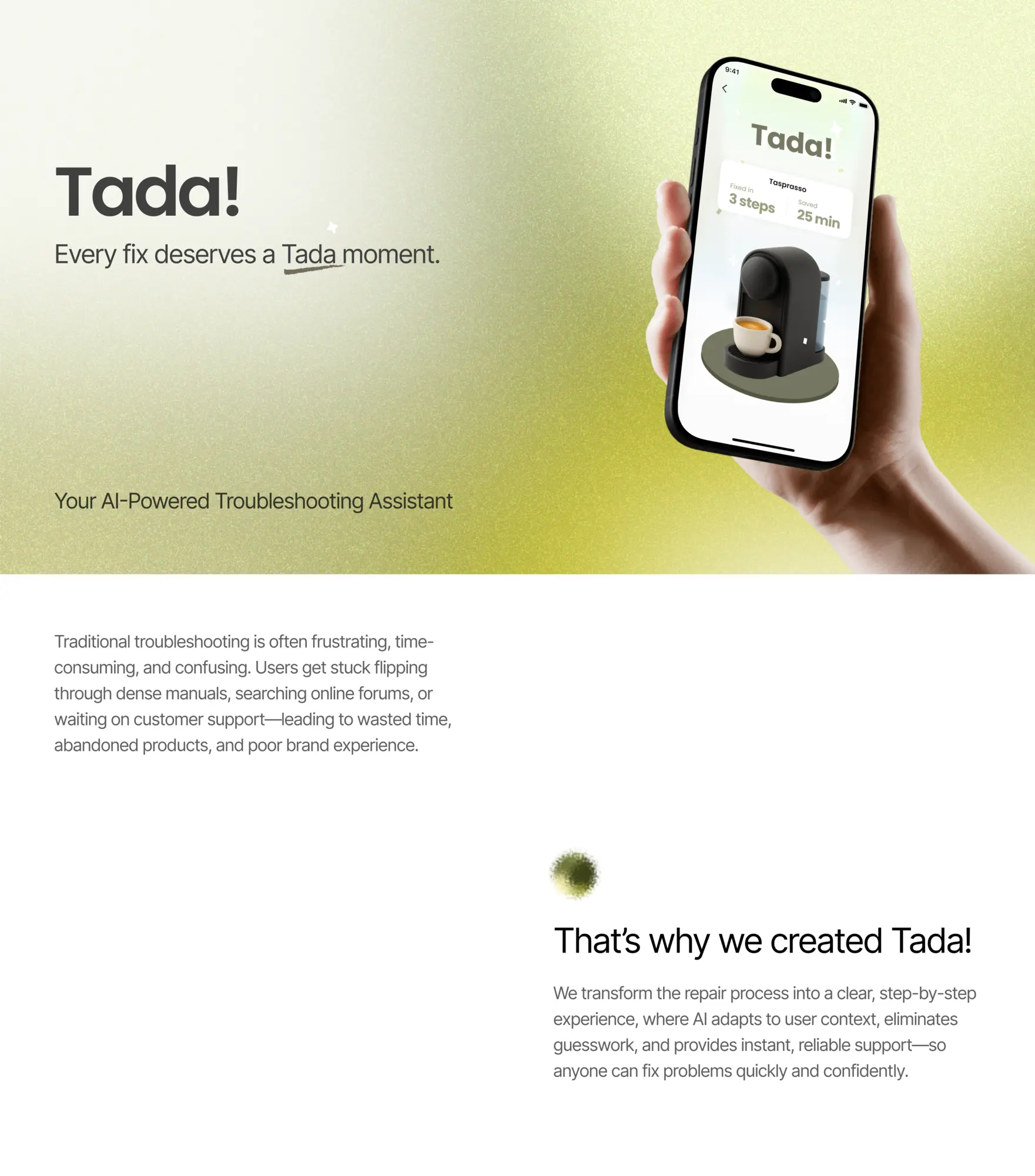 Tada! is an AI-powered troubleshooting assistant that makes repairs seamless and empowering. Instead of scattered manuals and confusing forums, users receive clear, adaptive guidance tailored to their needs. Multimodal inputs—voice, text, or image—remove guesswork, while step-by-step resources and live agent support ensure no one gets lost along the way. From root cause analysis to replacement or repair, every journey ends with a celebratory “Tada!” moment. By turning frustration into clarity, Tada reduces abandonment and restores confidence in every fix.