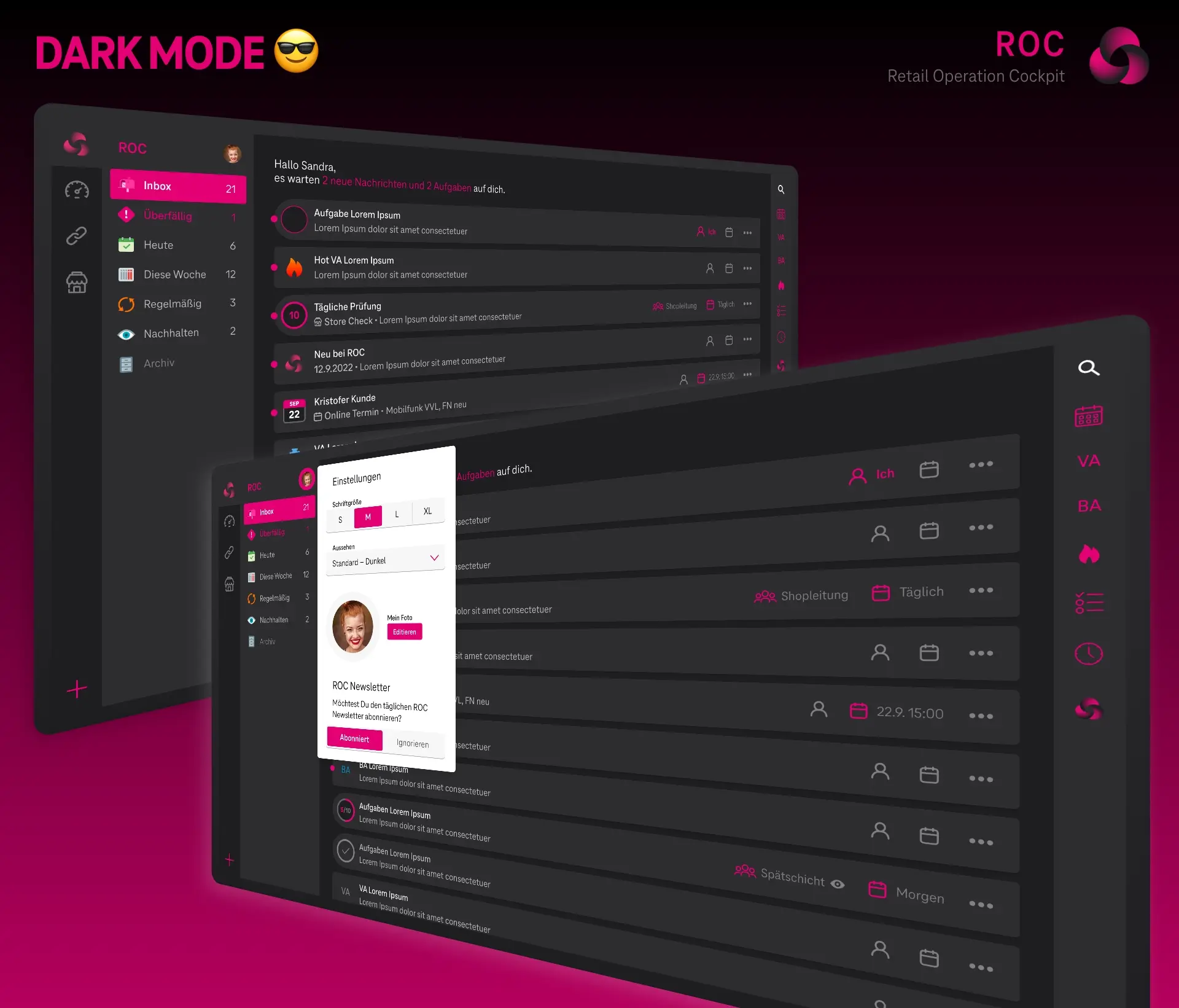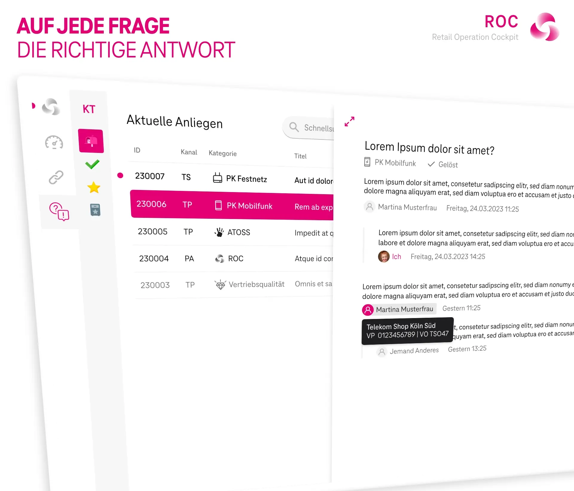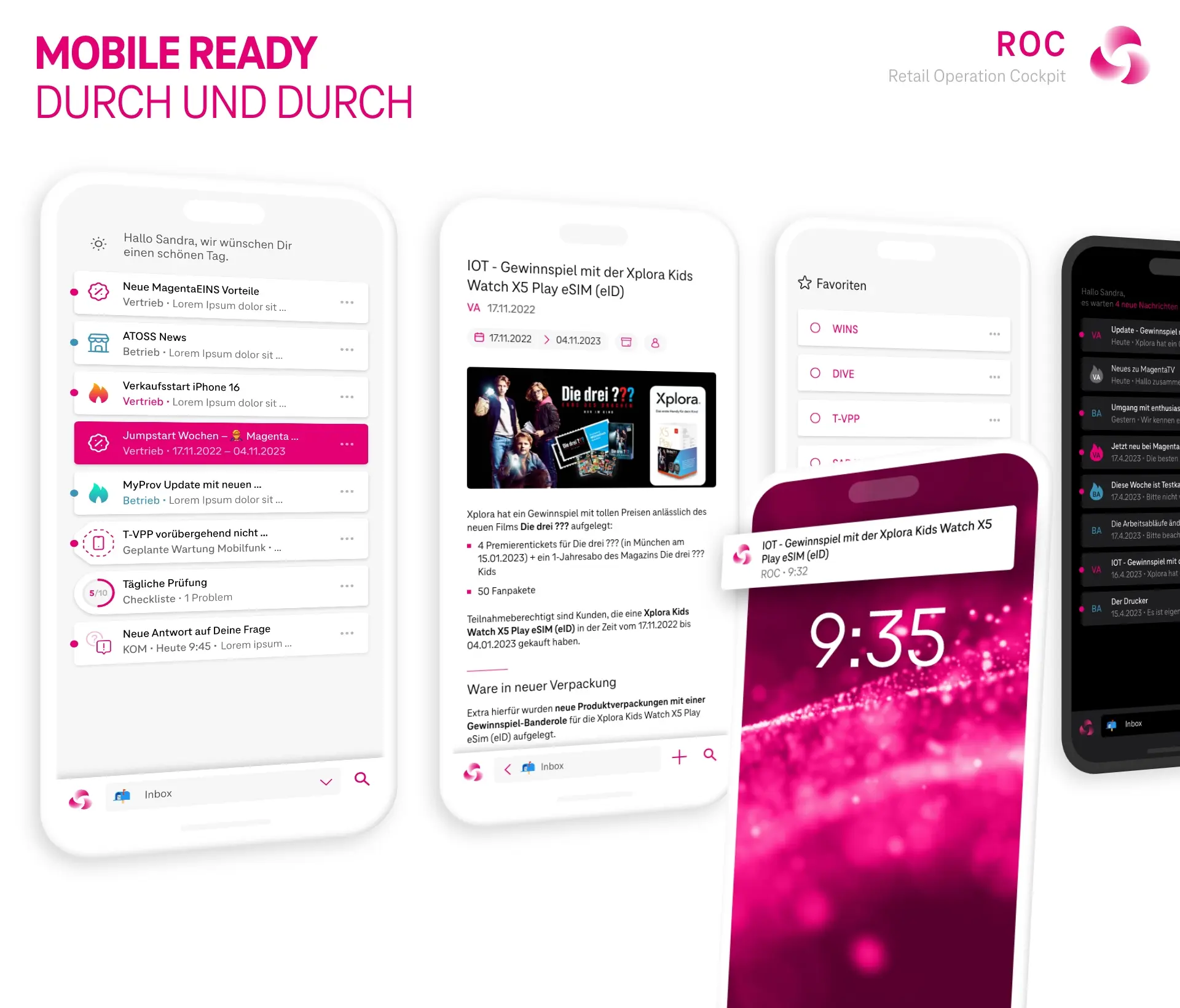 ROC – Retail Operation Cockpit is Telekom’s central platform for efficient retail operations. It lets Retail teams manage shop processes in one browser-based tool with news inbox, Q&A (KOM), key links, and Power BI reports—accessible via web or mobile (iOS/Android). Designed & developed by Wahnsinn Design GmbH based on its ION software, ROC streamlines communication across shops, partners, and sales teams. Securely hosted on Telekom’s AWS and continuously enhanced, it ensures reliable, future-proof retail support.