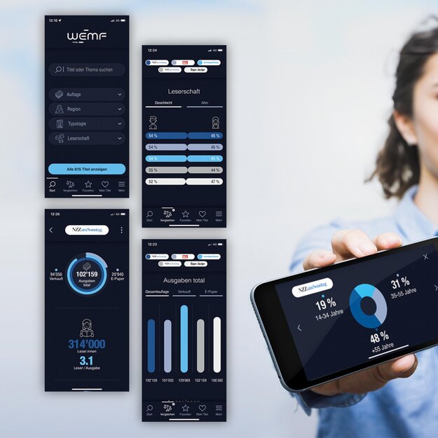 The mobile app combines innovative visualization techniques with a clear and intuitive user experience, allowing professionals in the publishing and media industry to quickly grasp complex data. The »WEMF Facts & Figures App« stands out with its functional design that emphasizes dynamic and interactive data presentation.