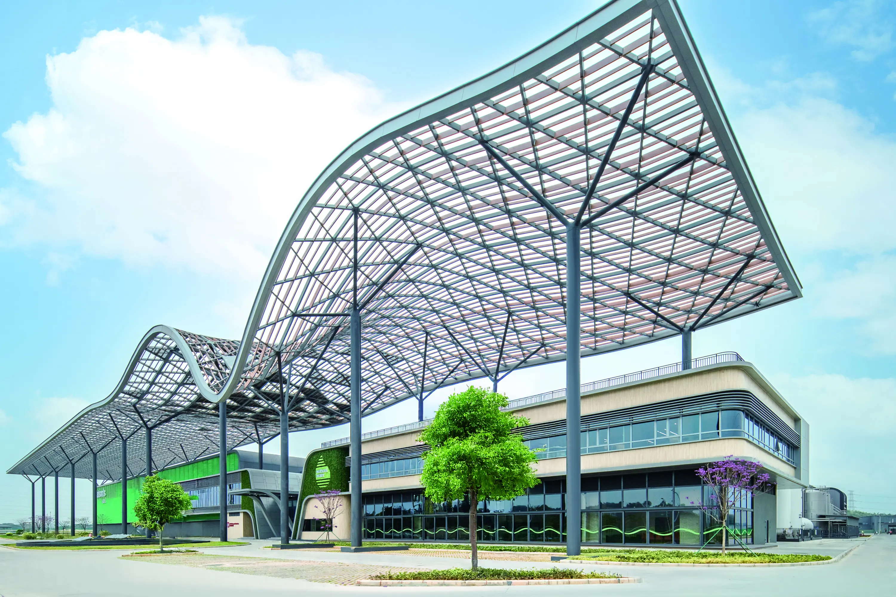 AS Watson smart factory reflects climate-responsive design, adapting to the subtropical monsoon climate. Its double-layered aluminum grille canopy (11.5° tilt) optimizes summer shading & winter lighting. The rainwater harvesting system has an annual capacity of 77,136 m3 and meets 100% of the non-potable water demand. It combines low-impact development and sponge city features, with photovoltaics cutting CO2 emissions by 89.3 tons/yr. An intelligent energy system ensures sustainable operation.