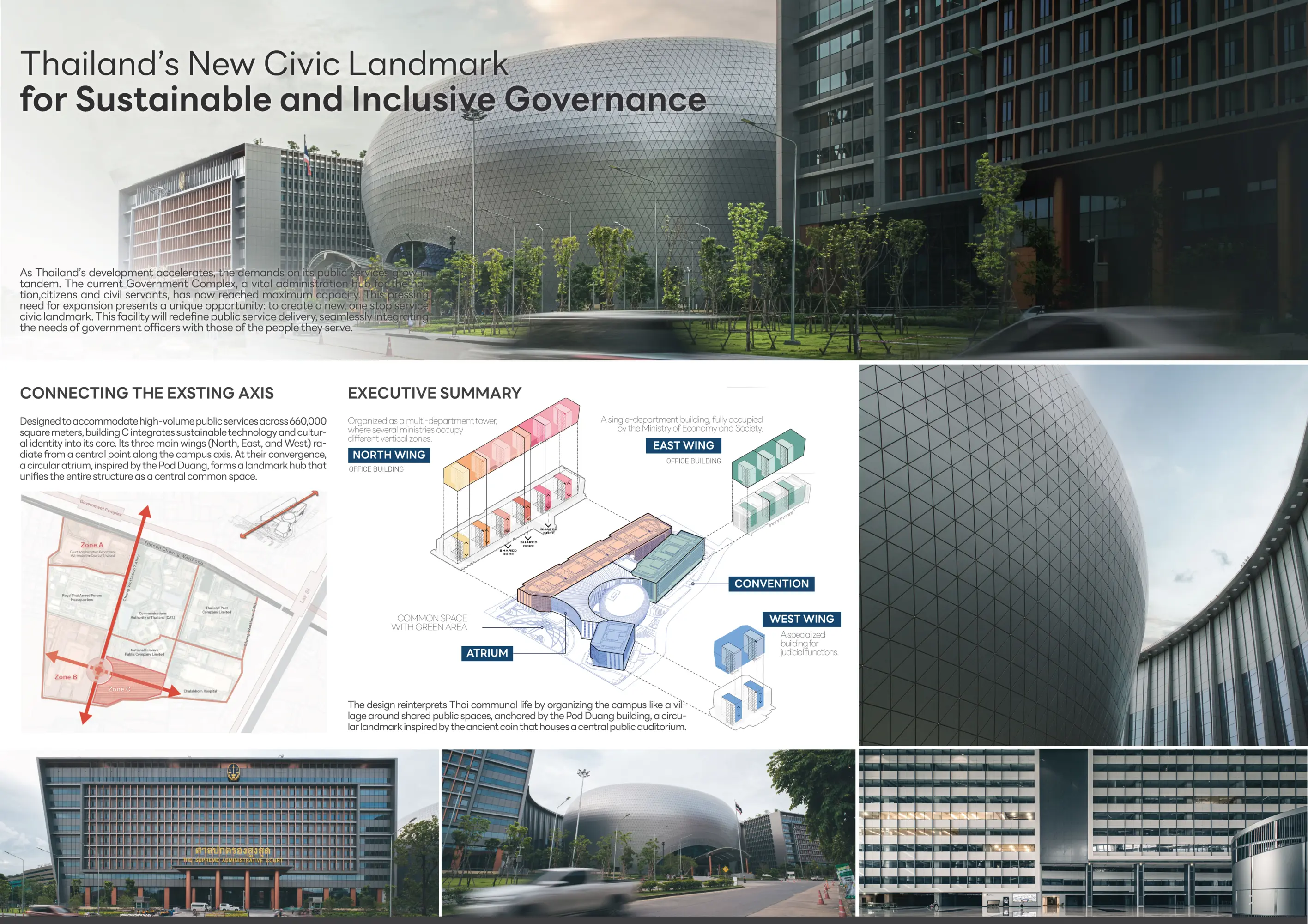 Thailand’s new Government Complex Building C is a sustainable civic landmark. Its design, inspired by reimagines traditional Thai communal life for a modern context, zoning the campus like a village centred on shared public spaces to foster connection. The traditional Pod Duang coin, features a central atrium uniting three wings. It reimagines offices as vertical villages for efficient agencies. It utilizes passive cooling, solar power, and local materials. Nearly half the site is green space, promoting biodiversity and cooling. The universally accessible design fosters community and embodies a vision of progressive, inclusive governance.
