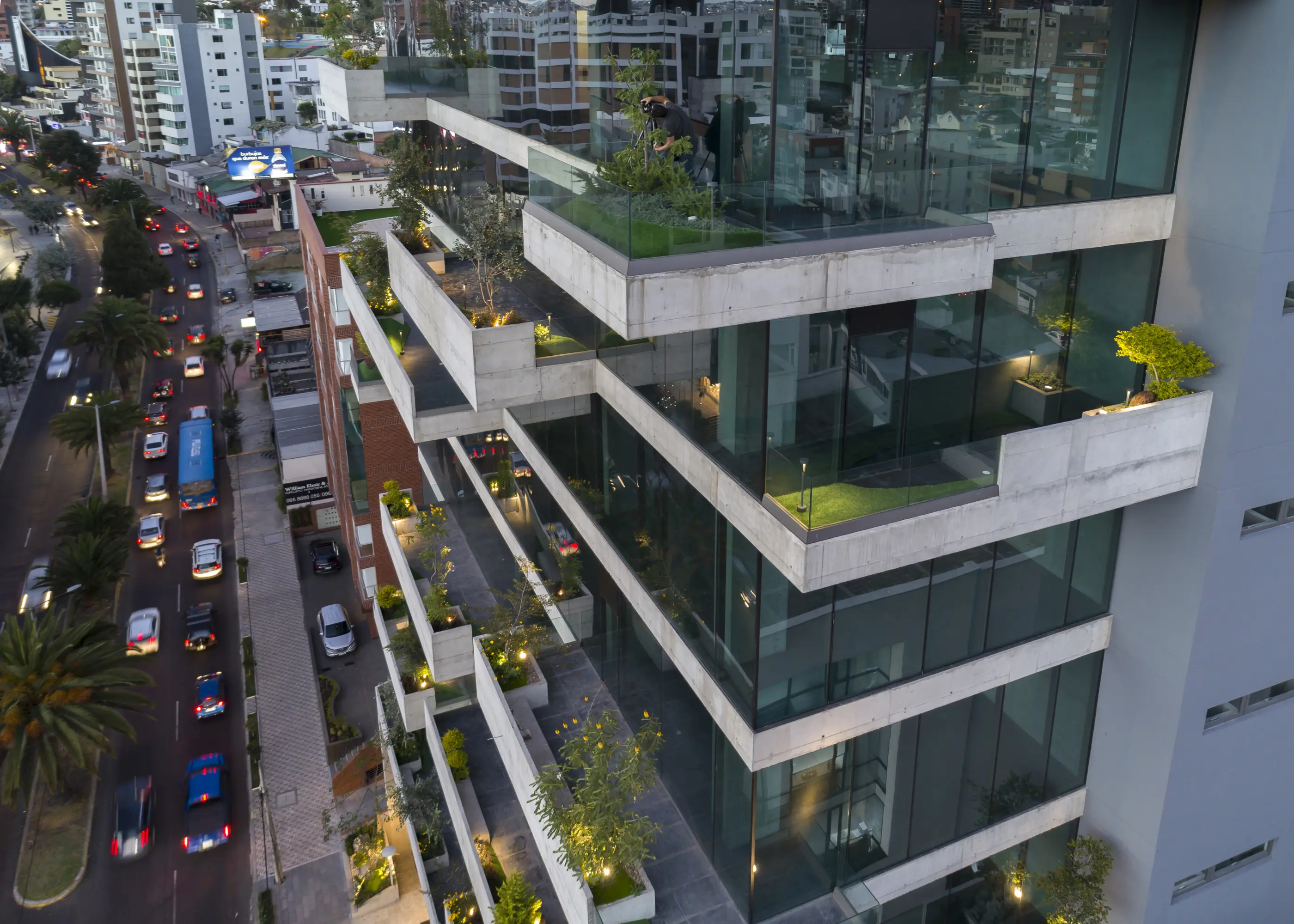 Located in Quito, CORPORATIVO 194 redefines the “horizontal office” with a bold concrete structure and asymmetrical garden terraces that blur the line between inside and outside. Layered horizontally and vertically, the terraces root the building in the Andean topography, offering shade, biodiversity, and daily connection with nature. While achieving LEED Platinum through passive and active strategies, the project goes beyond metrics—challenging the sealed-box typology with a porous, biophilic, and fundamentally human architecture. It proposes a workplace that breathes, lives, and evolves with its environment.
