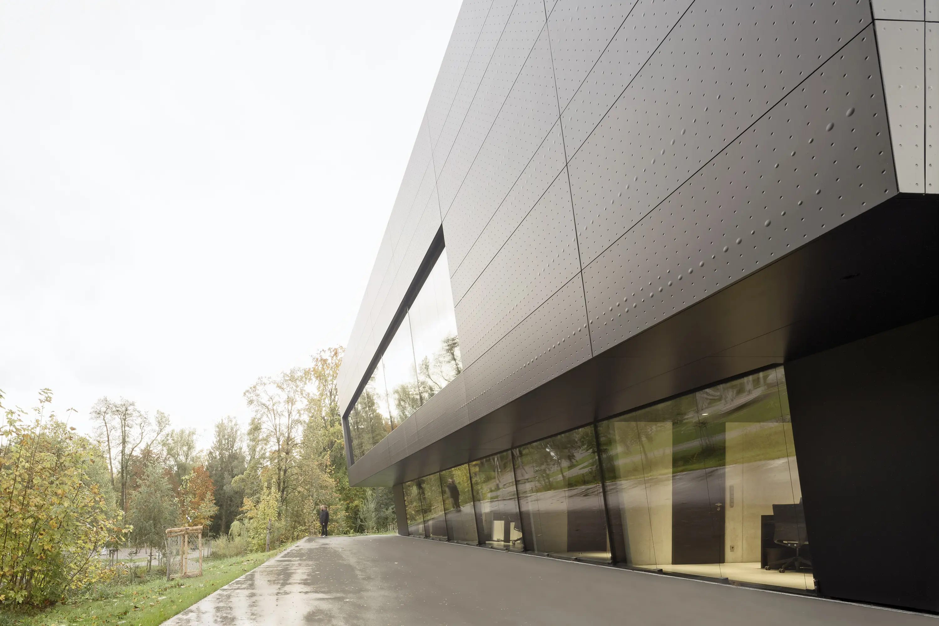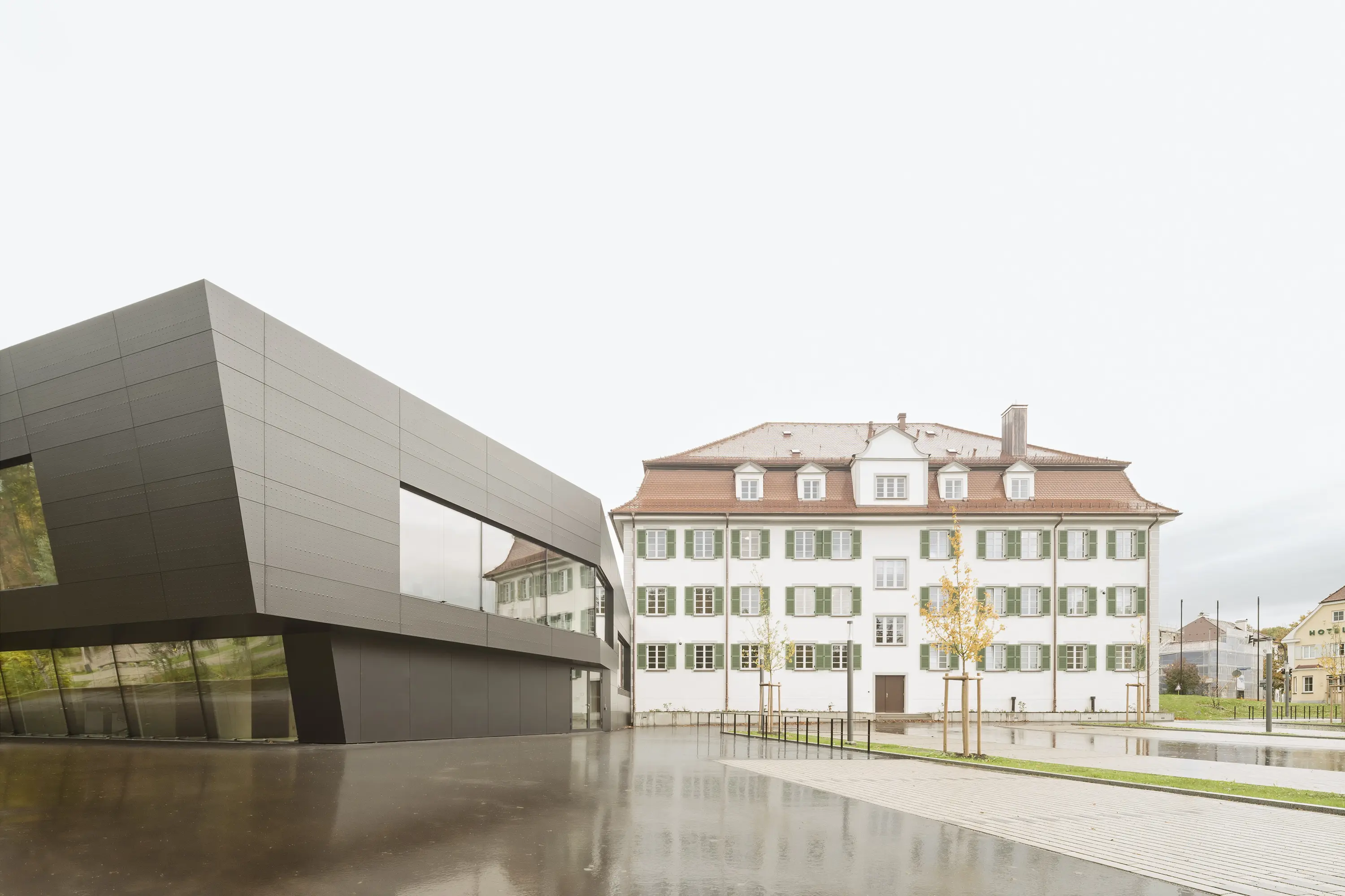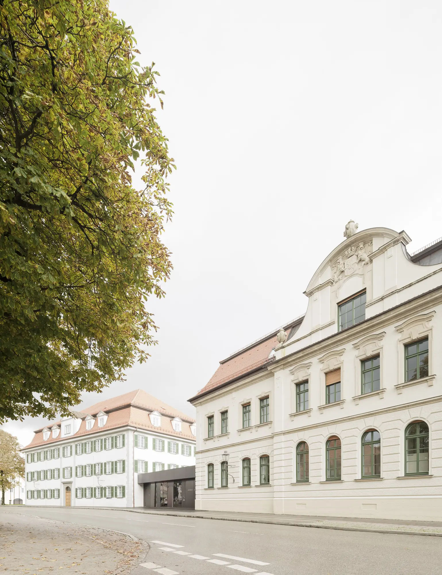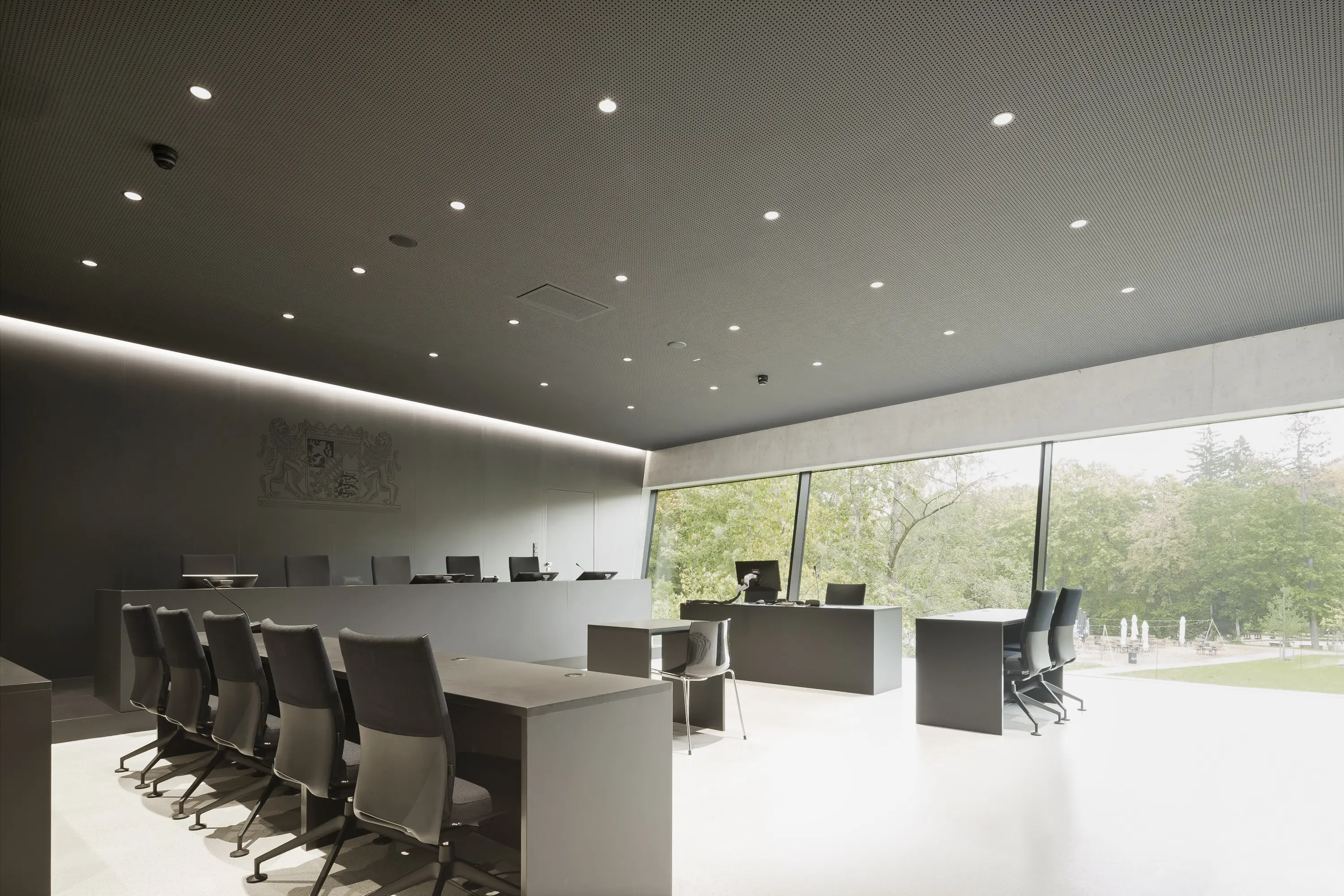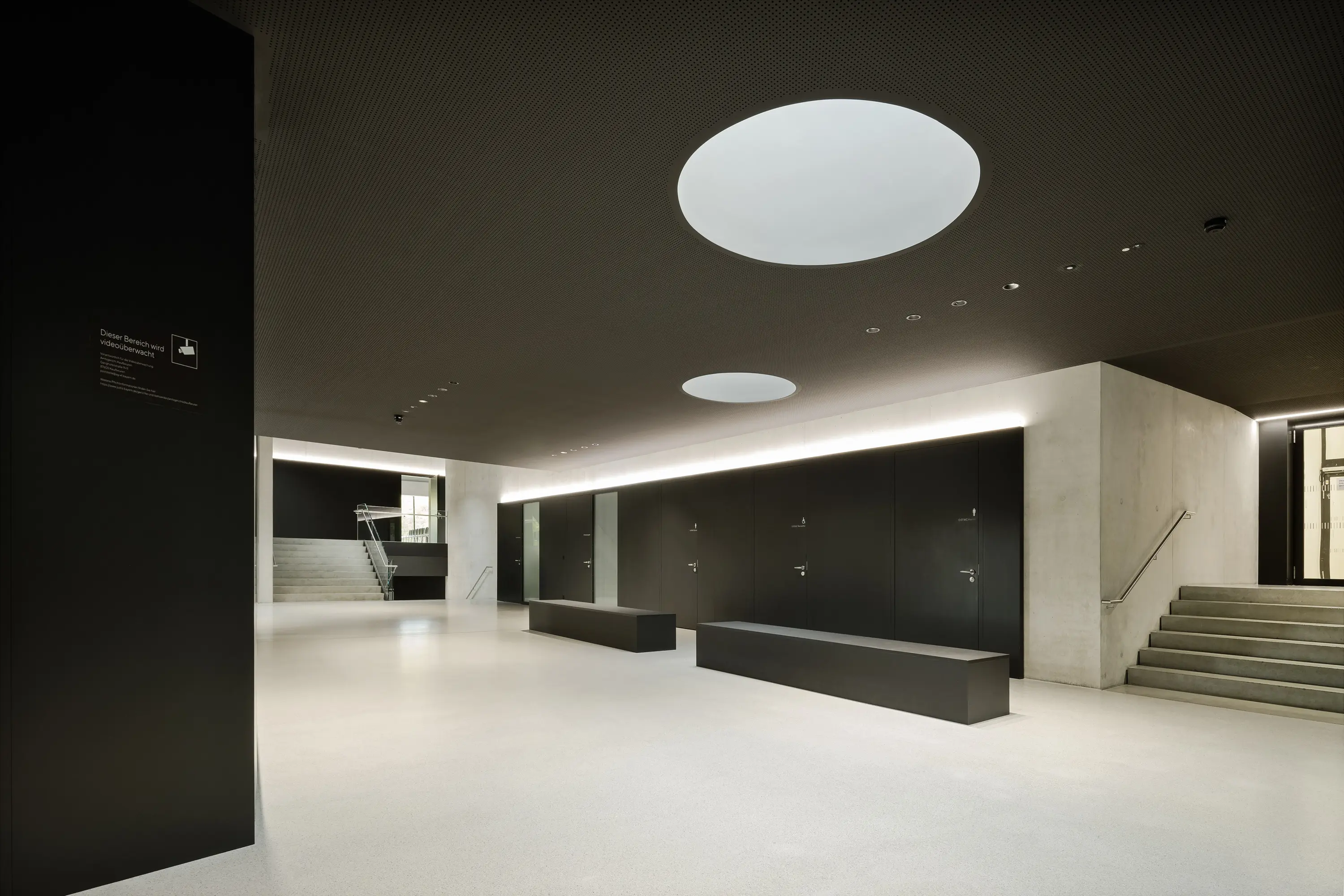 The extension integrates sensitively into the ensemble of listed buildings from 1805 and 1890. Through recessed positioning and measured heights, the historic solitaires remain legible, while the new building establishes a clear, identity-giving address. Responding to the topography with a split-level typology, it opens polygonally to the Jordan Park. The foyer frames the historic façades, while five courtrooms are arranged as “courts in the green”, with generous glazing connecting interior and landscape.