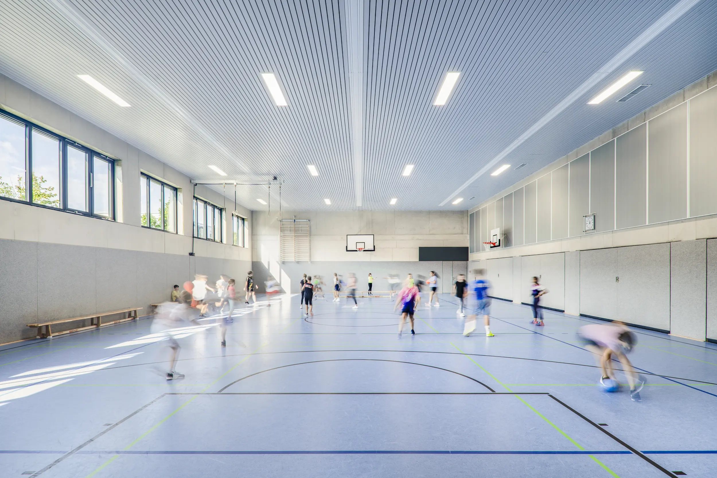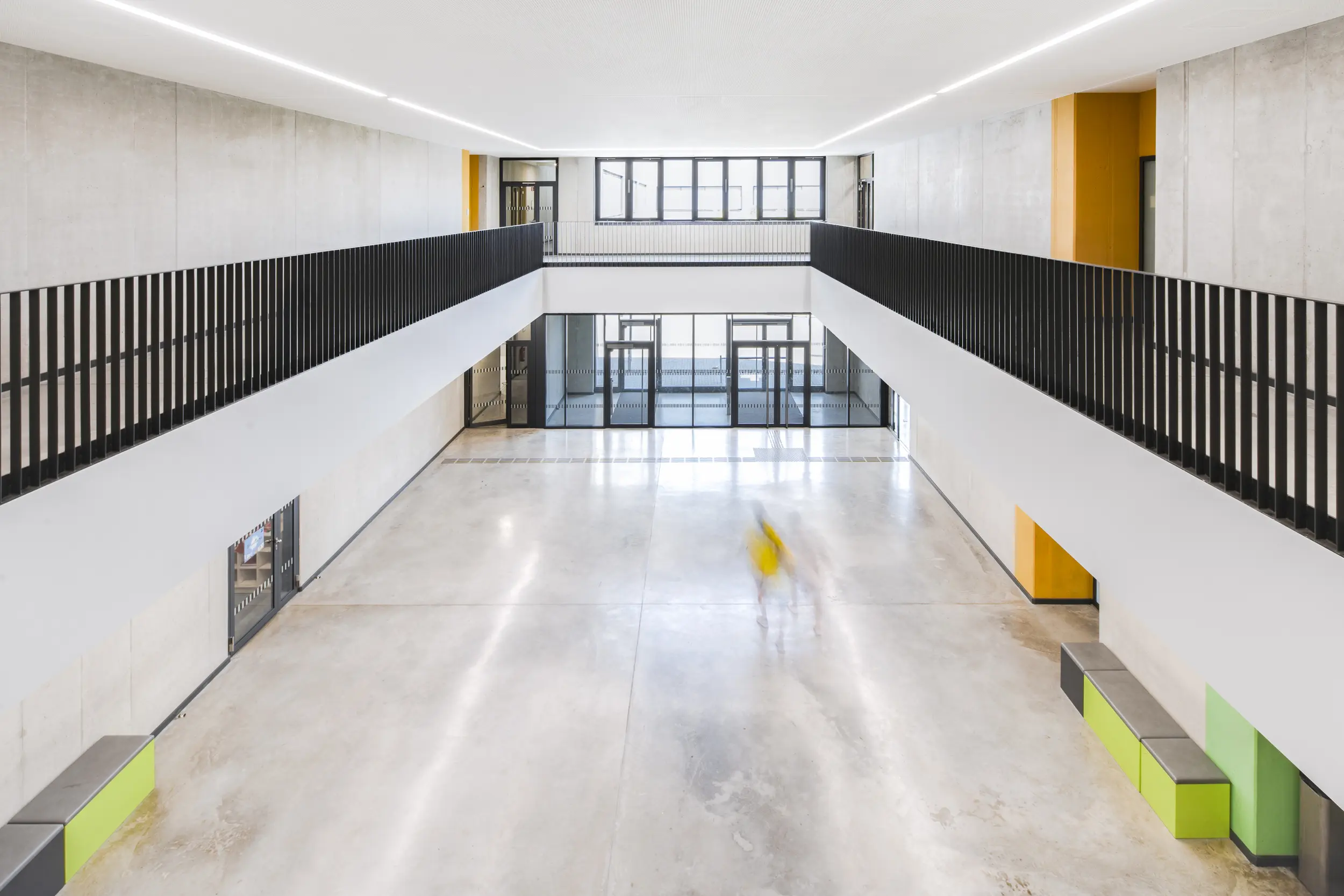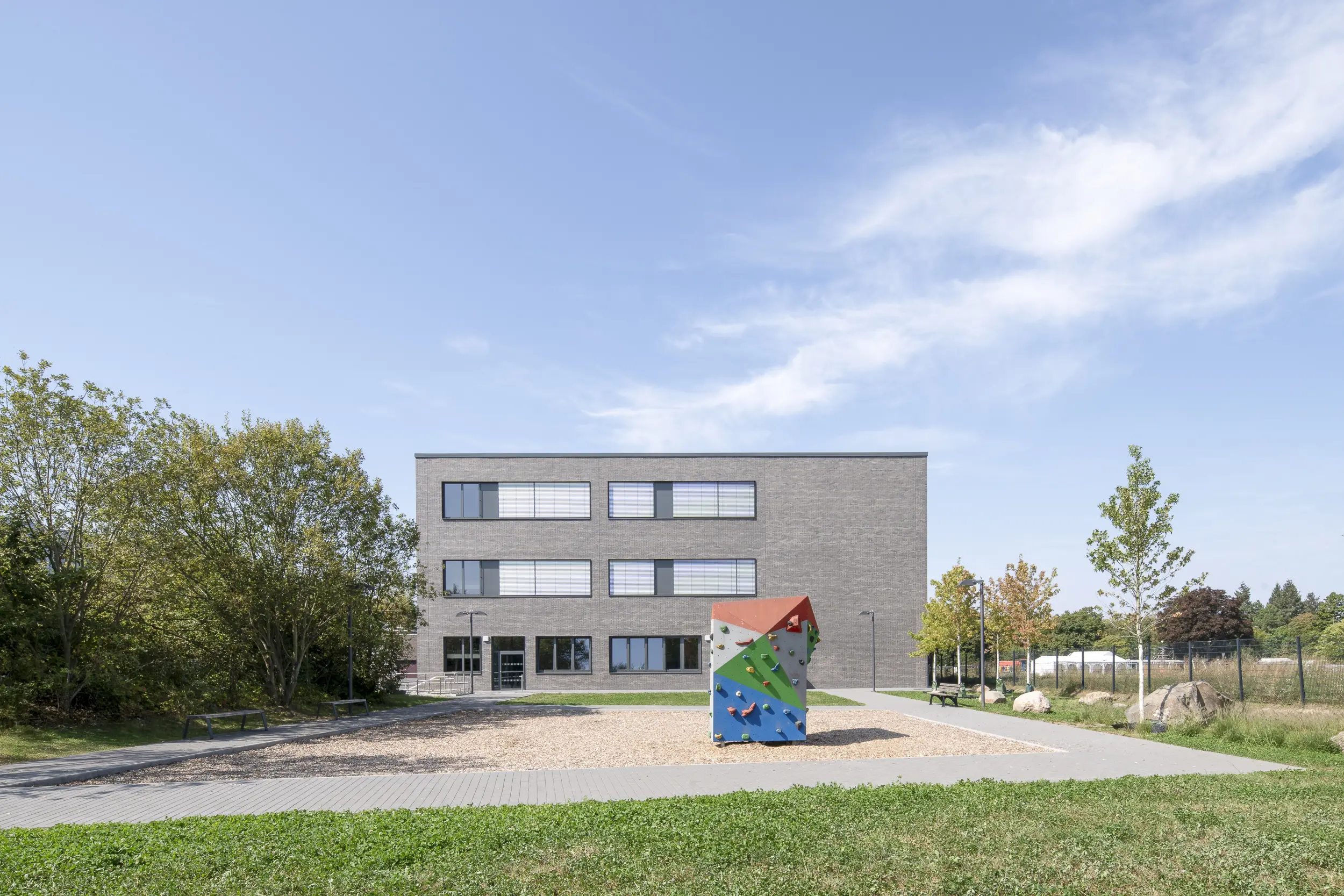 The new school building should appear to belong to the main building: Materiality, closed inner courtyards that open outwards and internal building lines are taken from the existing building. The new building can be accessed directly from Sürther Strasse and via the large foyer of the main building, under the library bridge. Arrivals are guided via a large forecourt with a central meeting point into a foyer with a generous airspace.