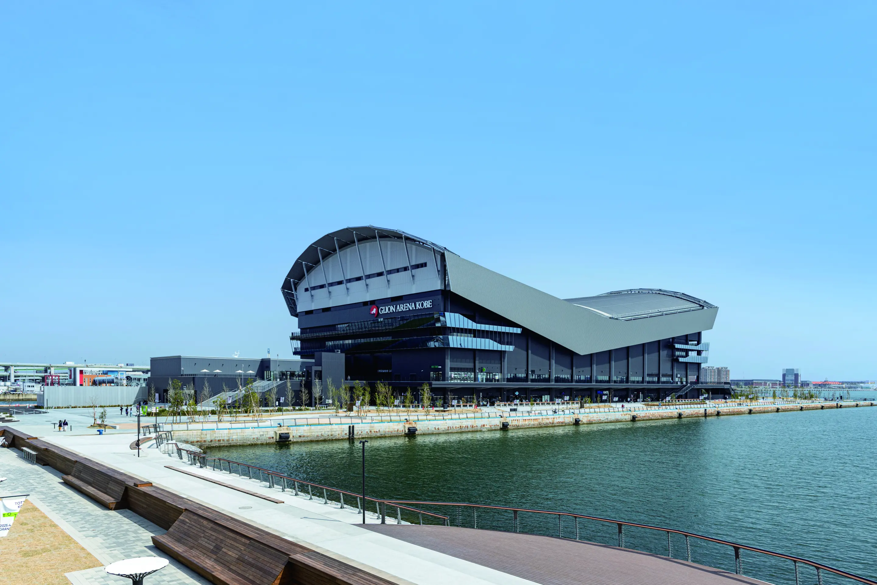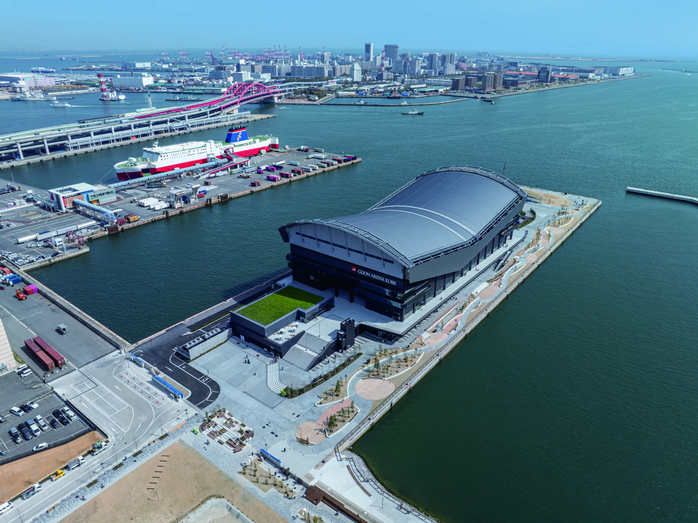 The new private arena in Kobe, located on a pier surrounded by the sea, will be a landmark for the city's waterfront. It will host sports and live entertainment events, becoming a hub of activity that connects with neighbouring areas. The arena's V-shaped roof opens to the sea and mountains, reflecting Kobe's topography. The arena has been designed to reduce the total air volume to meet low-energy standards (ZEB Ready), making it the first of its kind in Japan as a 10,000-seater facility.