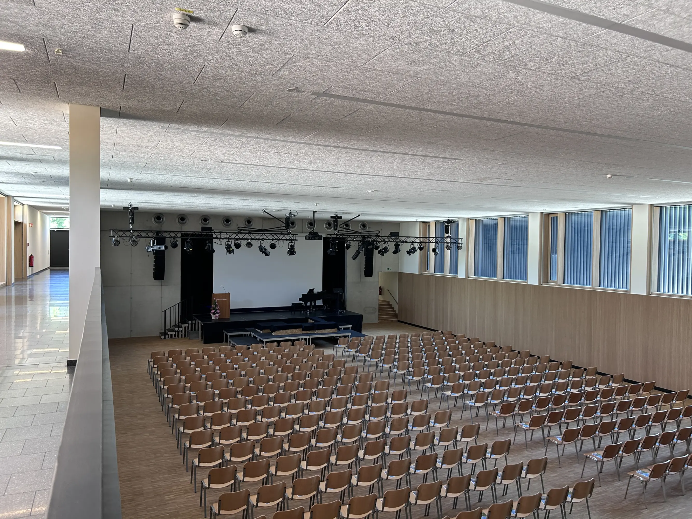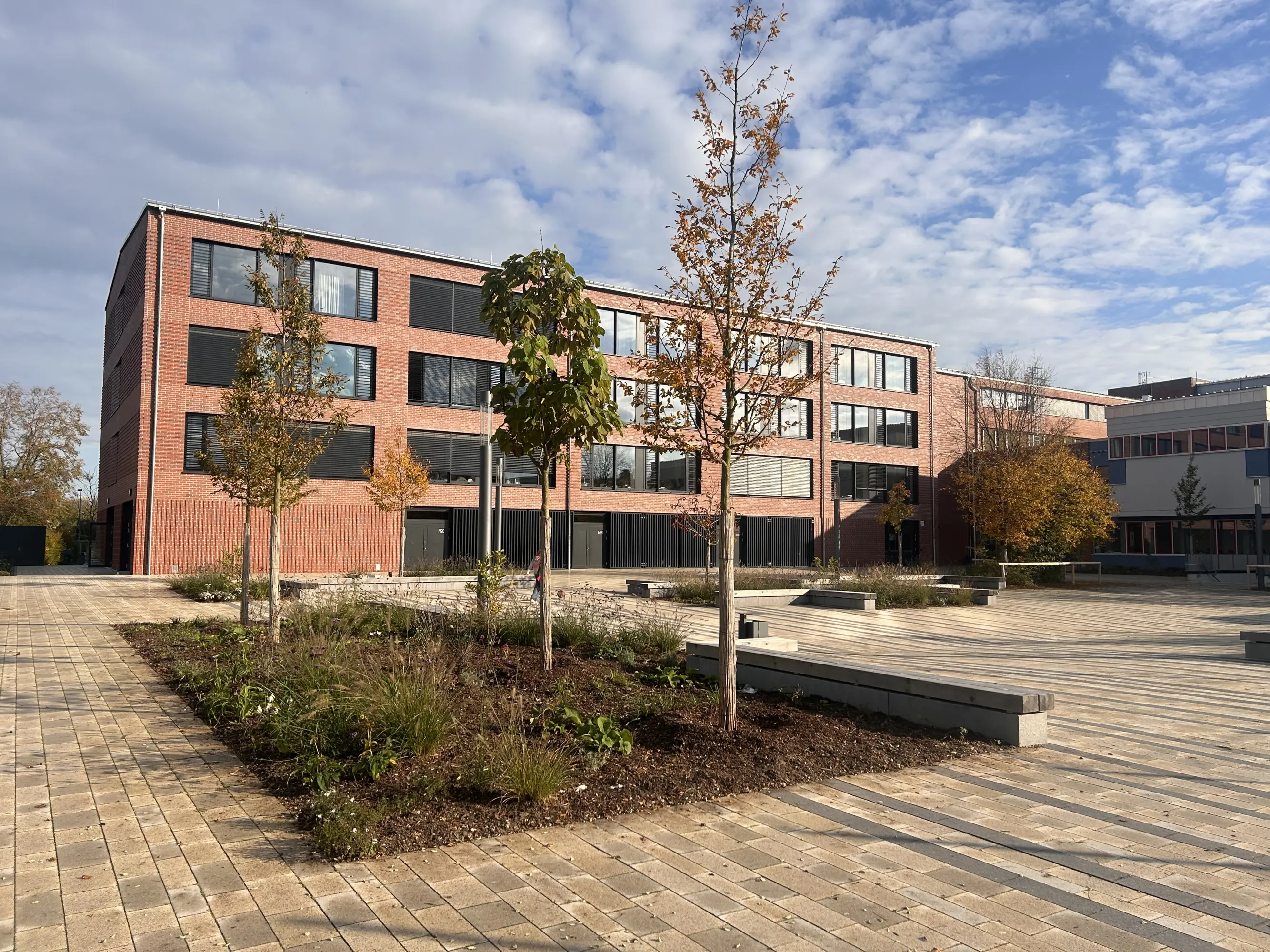 The Humboldt-Gymnasium in Vaterstetten, originally built in 1972, was extended by an additional building that includes classrooms, specialist rooms, areas for modern teaching methods, and a multifunctional single sports hall. The hall can be used for both events and sports lessons and has separate access for extracurricular and evening use. The construction consists of reinforced concrete, a three-storey wall-like beam above the hall, a gently sloping timber roof with stainless steel cladding, and a ventilated clinker brick façade referencing the existing building.