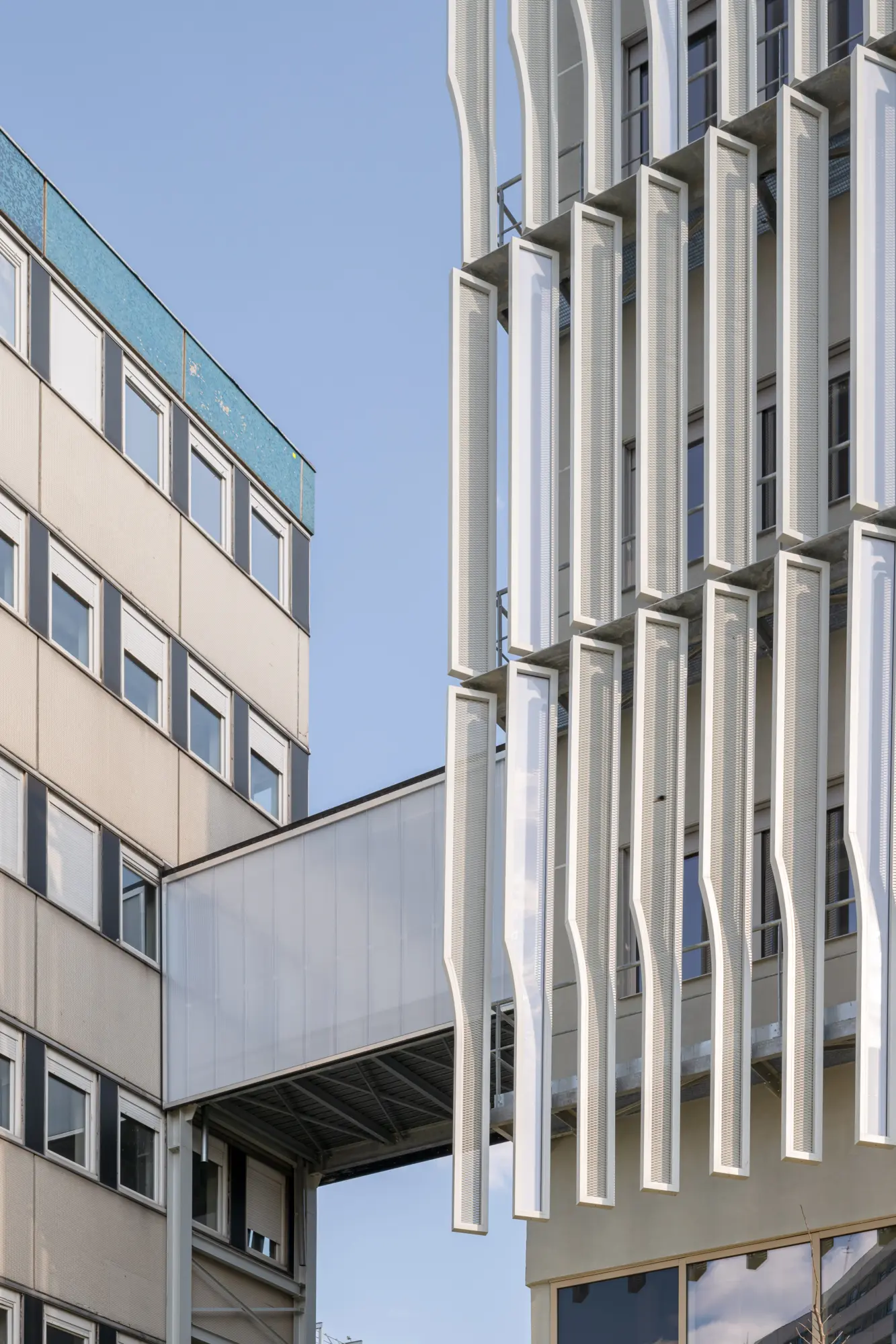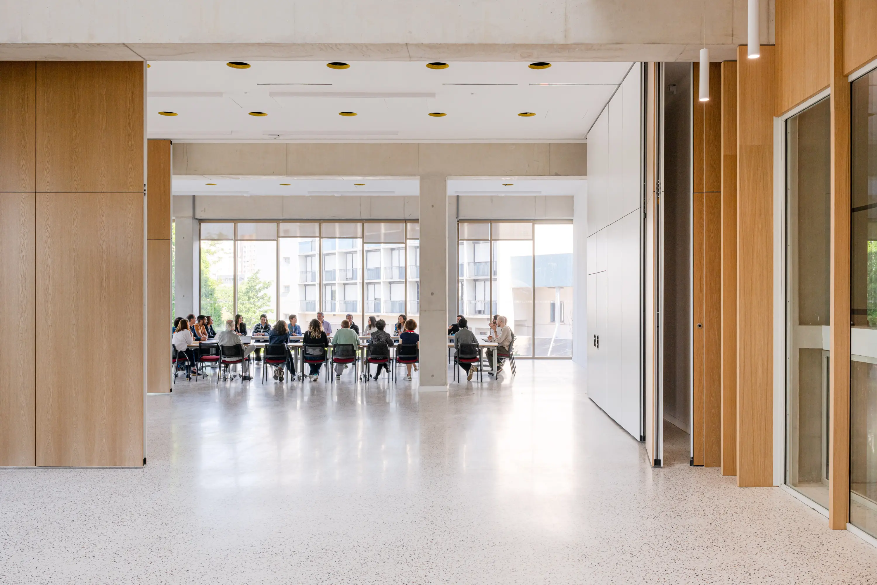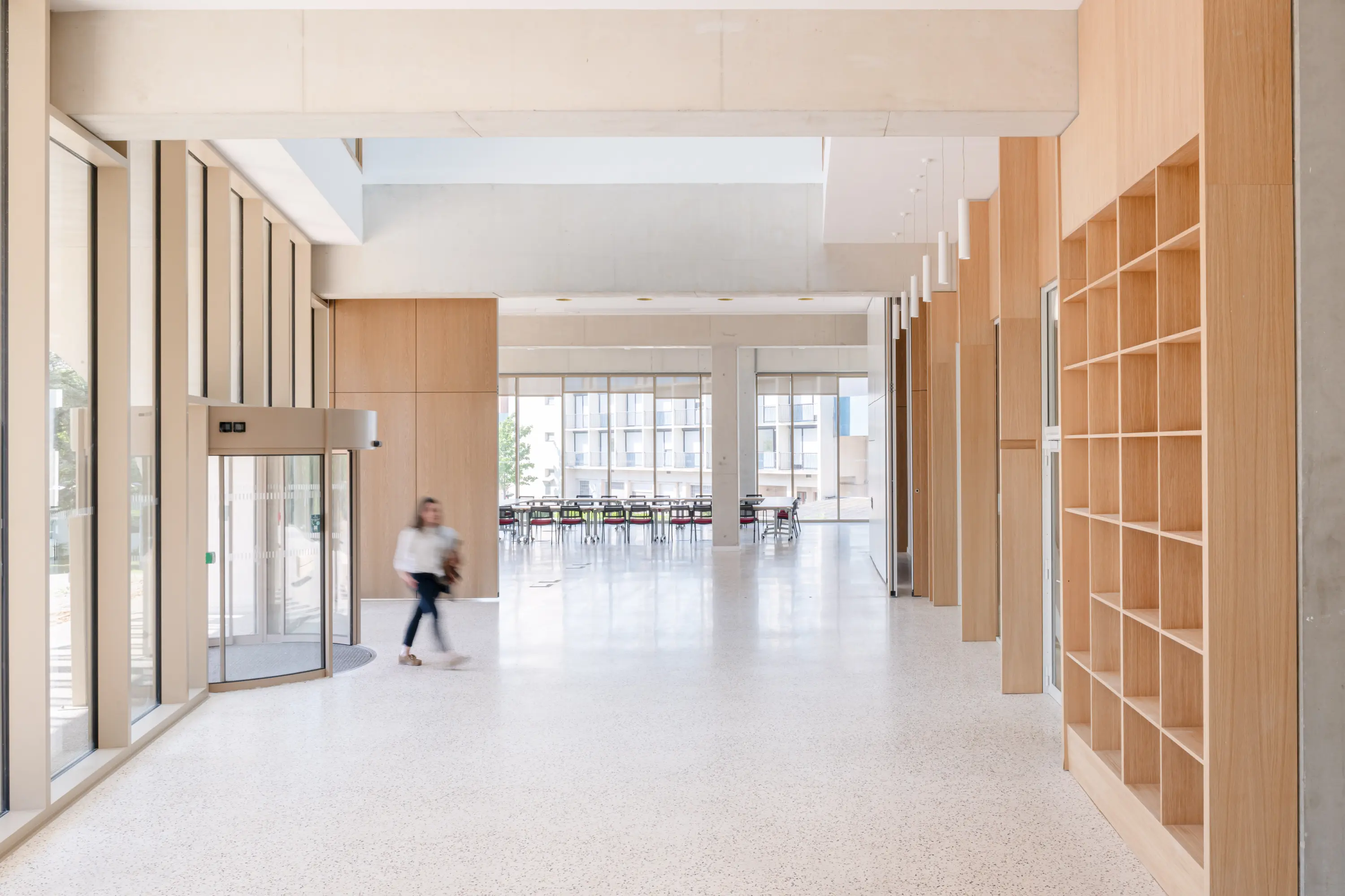 The Bâtiment de Recherche Biomédicale at Université Paris-Est Créteil is a 5,765 m² facility by Nickl & Partner France, linking academic innovation & clinical practice. Its trapezoidal form breaks from linear campus blocks while bridges connect to Health Sciences & Henri-Mondor Hospital. A glazed axis & atrium organize labs & offices, fostering daylight, wayfinding & exchange among 170 researchers. Public glazing, organic columns, L1–L3 labs, PolluRisk hall, seminar spaces & a herb garden support transparency. Hosting six research fields, the BRB unites science, teaching & public service in resilient, flexible architecture.