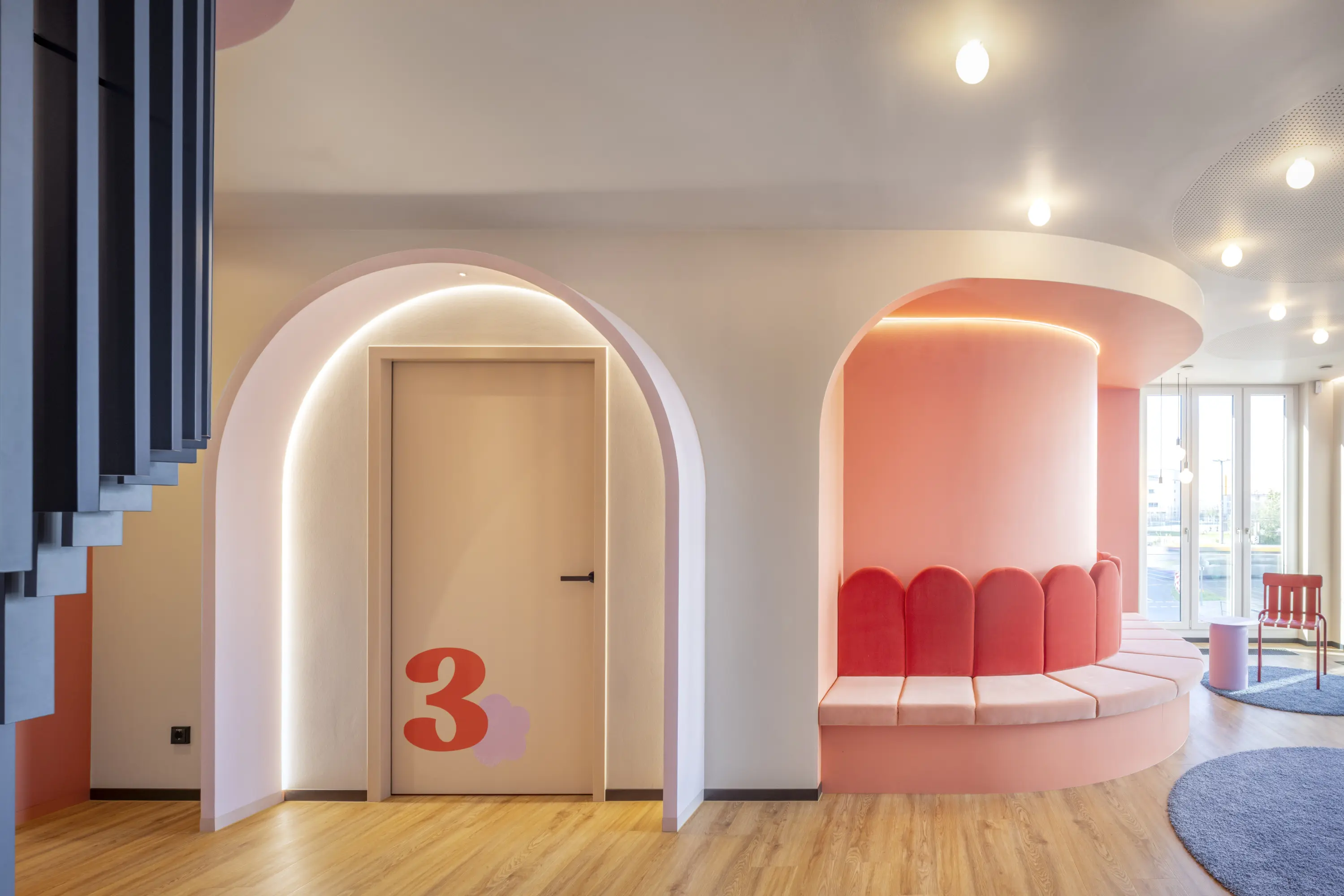 On 875 m², the project combines a dental practice for adults with a child-friendly area for young patients. A clear division into adult treatment, pediatric dentistry, and functional zones allows for a differentiated response to varying needs. The design creates a welcoming atmosphere with a high quality of stay. Organic forms, homely materials, and carefully framed visual connections define the spatial experience.