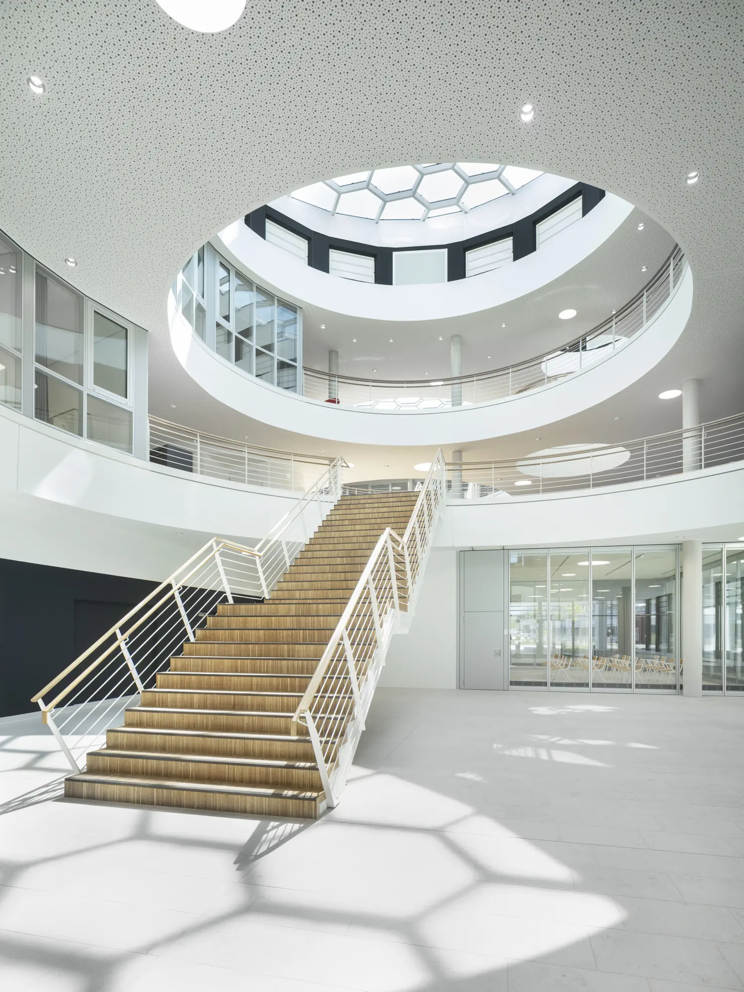 The new building of the Max Planck Institute in Hamburg is a highly specialized research building for ultrafast processes in matter. The building on the Bahrenfeld campus offers state-of-the-art laser laboratories, chemistry laboratories and workshops. An open “knowledge landscape” with cell and communication zones promotes interdisciplinary exchange. A central atrium connects the levels up to the cafeteria on the upper floor. The terraced, green roof landscape serves as a recreational space and public path - a strong sign of sustainability. The result is a place for cutting-edge research with technical precision and architectural clarity.