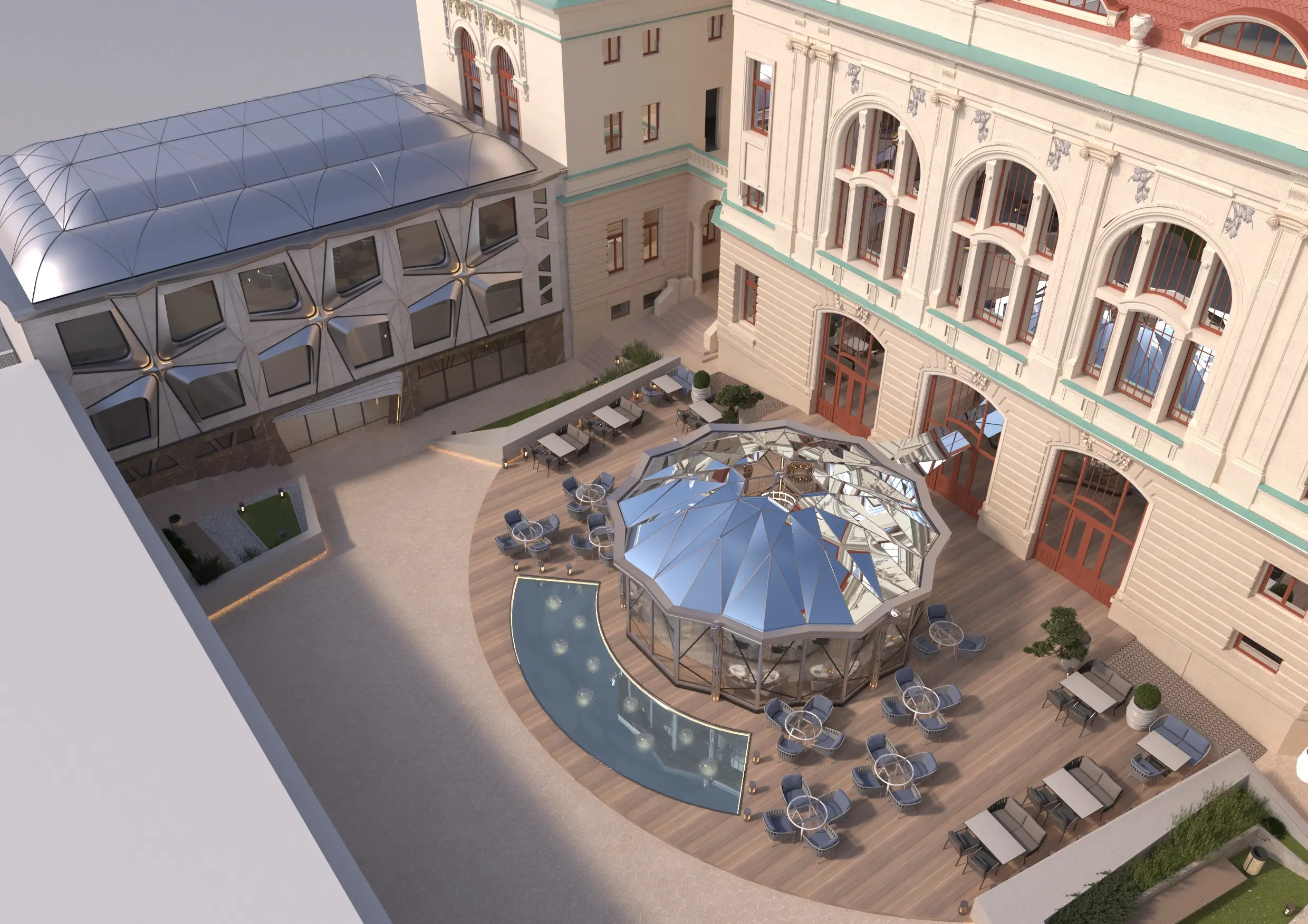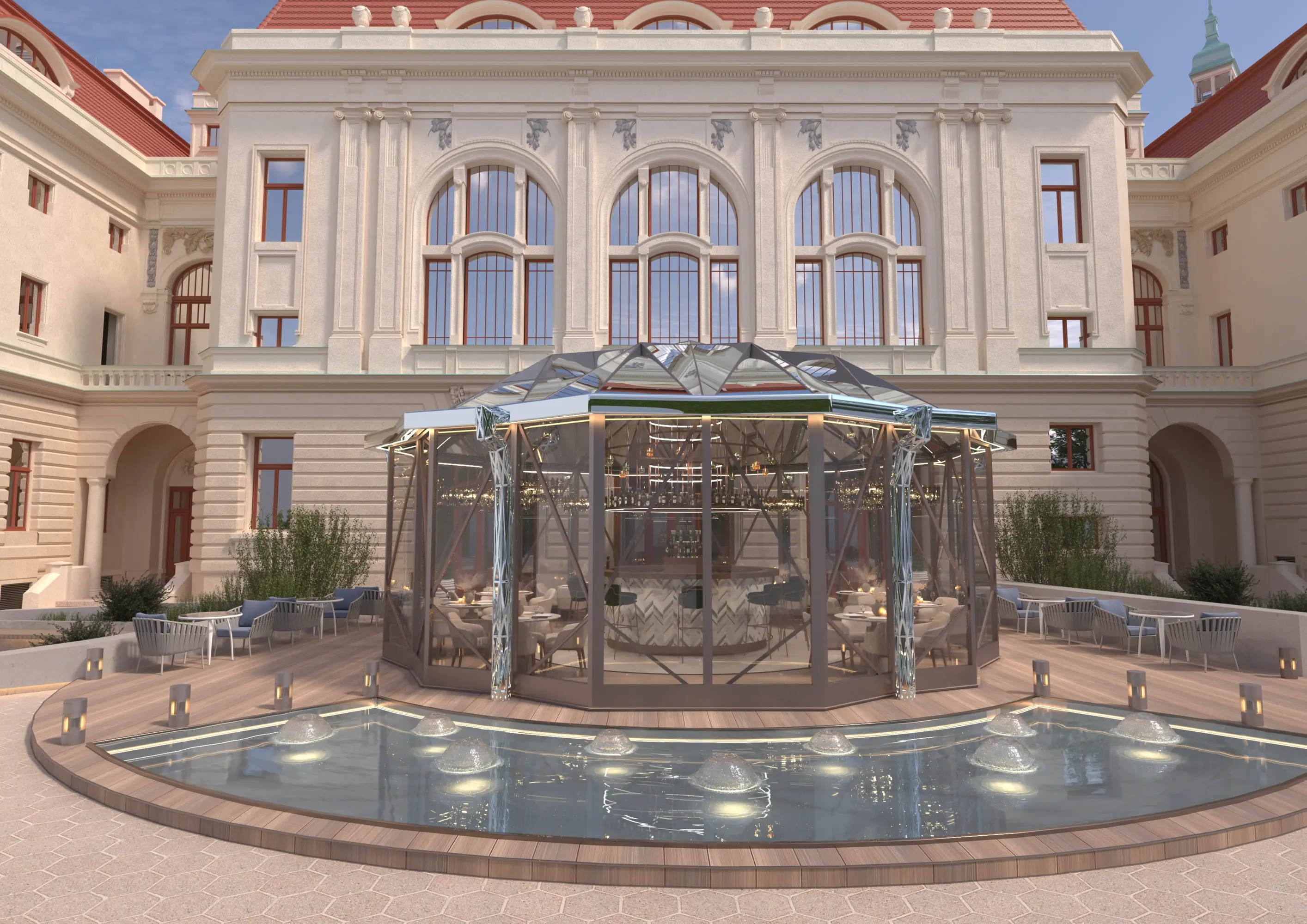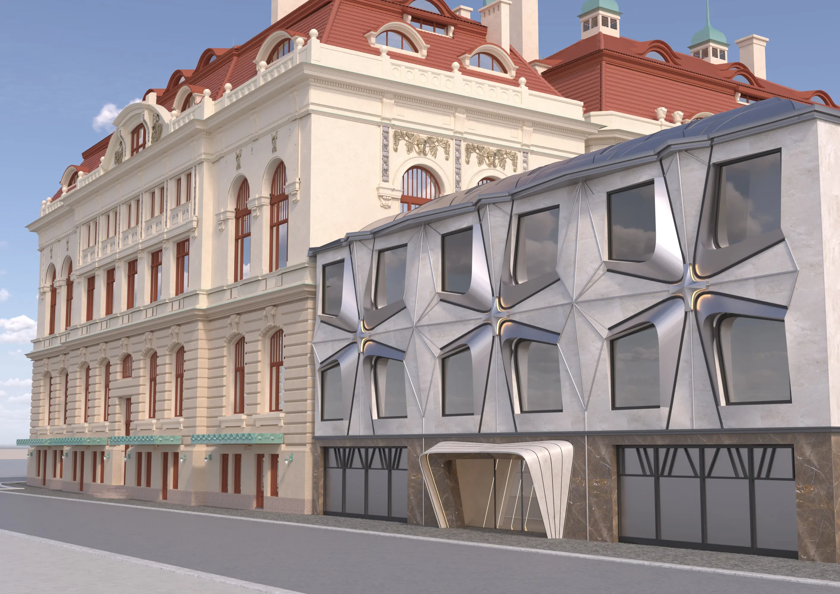 Original building has been build in 1908 as public national house. Our project convert this building in to the upscale hospitality segment and extend the property for a new volume in the garden. The hotel is in category 5* with the capacity 100 rooms. Two restaurants, conference facilities and spa with the pool. The existing building is on the list of UNESCO.