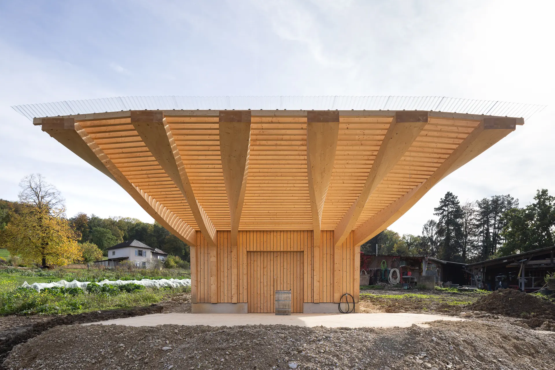 The Pavilion is located on the Goetheanum grounds, which boasts centuries of horticultural expertise. It creates a covered outdoor space where gardeners prepare biodynamic samples and host presentations and workshops. Its most striking feature is its large, organic roof, designed with twisted wooden rafters reminiscent of blossoming flowers. The structure creates a connection to the nearby “Heizhaus” and blends seamlessly into the surroundings.