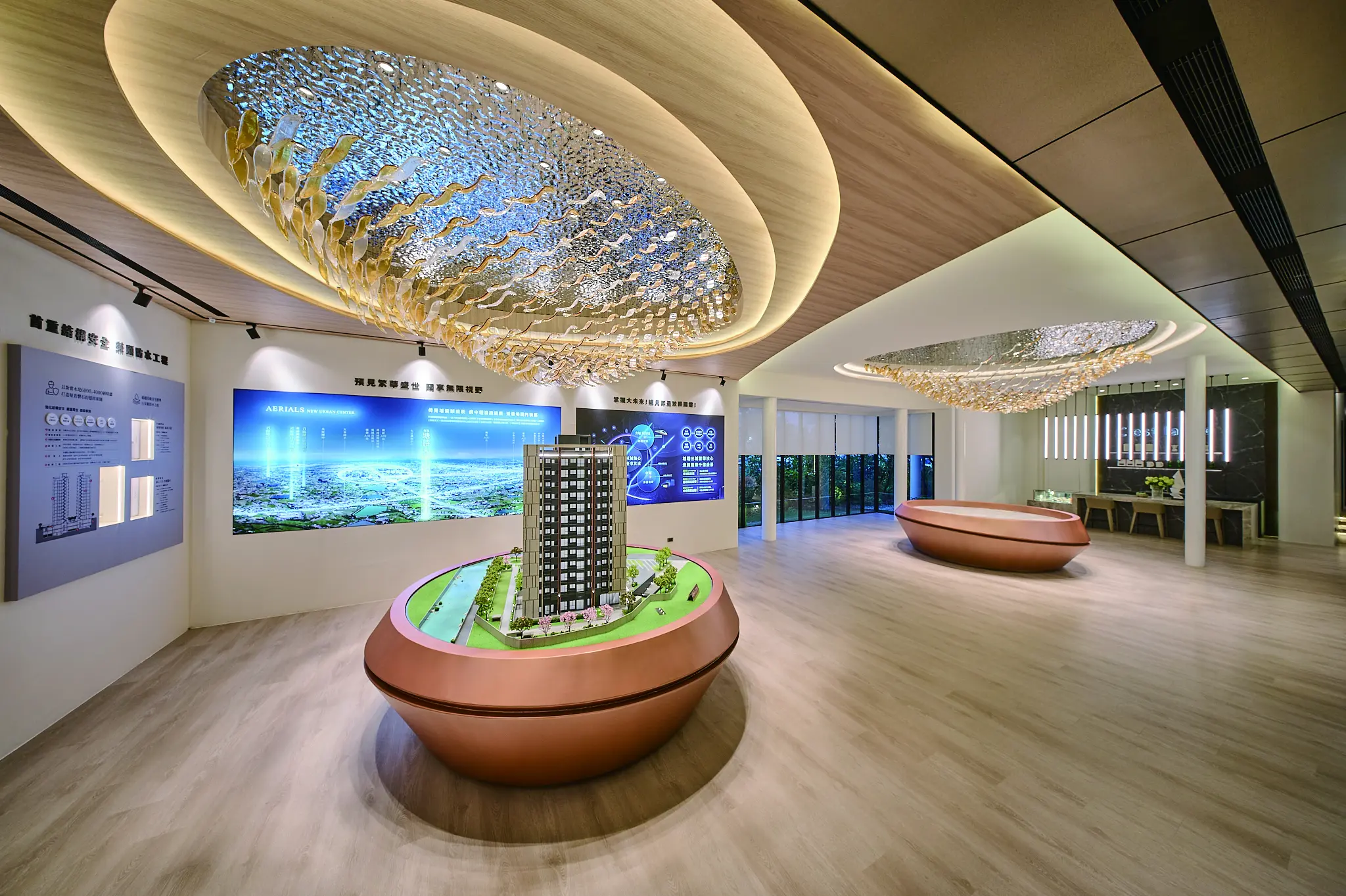 Inspired by Taiwan’s iconic irrigation ponds, reinterpreting rippling water as two overlapping sloped roofs. Like a lightweight hat floating above, the structure channels rainwater downward, while a central cut-out opens to the sky and allows light to pass through. 40 slender columns support interlocked volumes that rise naturally from the ground. Nighttime lighting—curved lines, wall washers, and uplights—adds radiance and transparency. Materials of rammed earth, mineral panels, concrete, glass in beige and grey hues echo the terrain. With natural ventilation and a slatted rear entry, the high-ceilinged space achieves comfort and elegance.