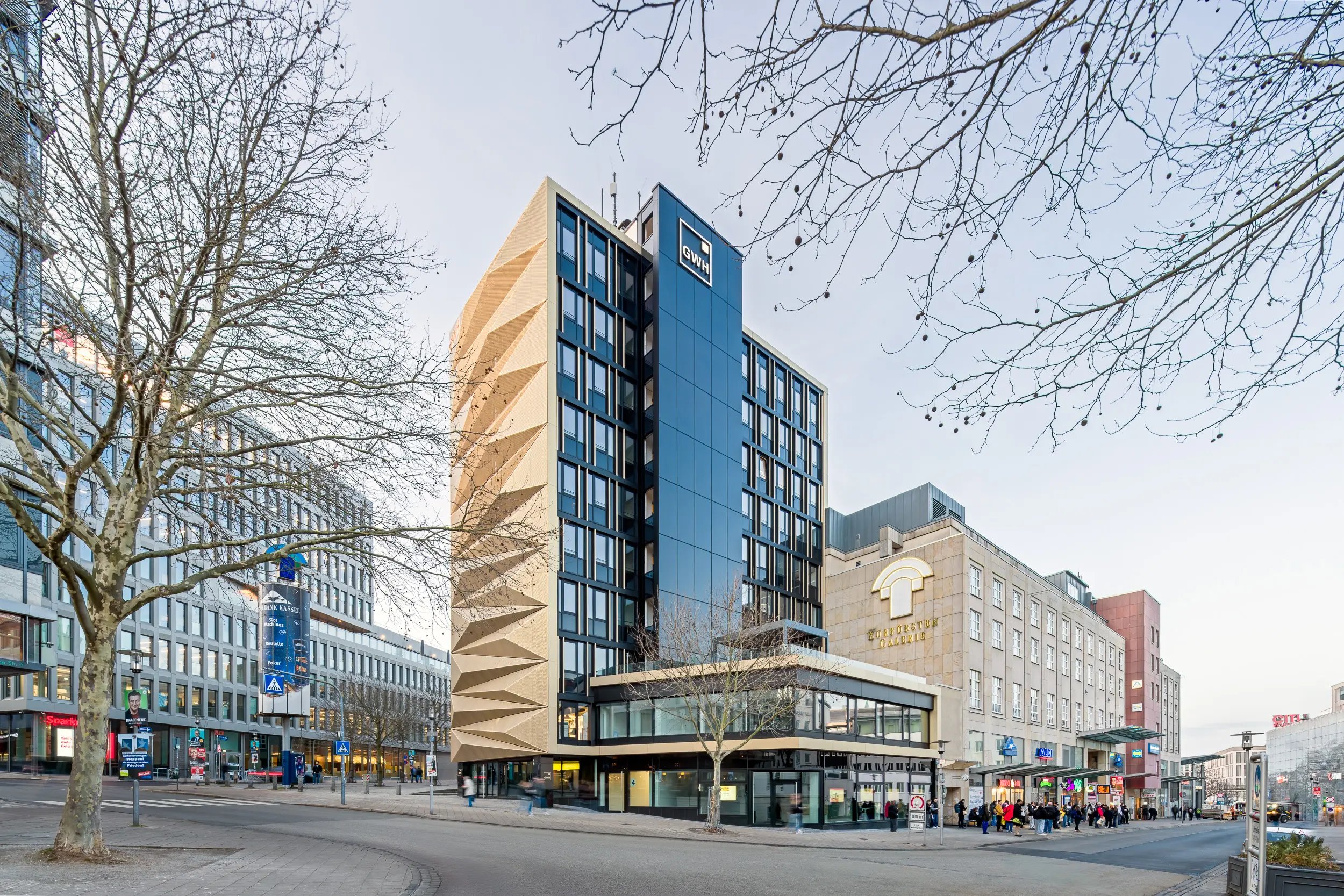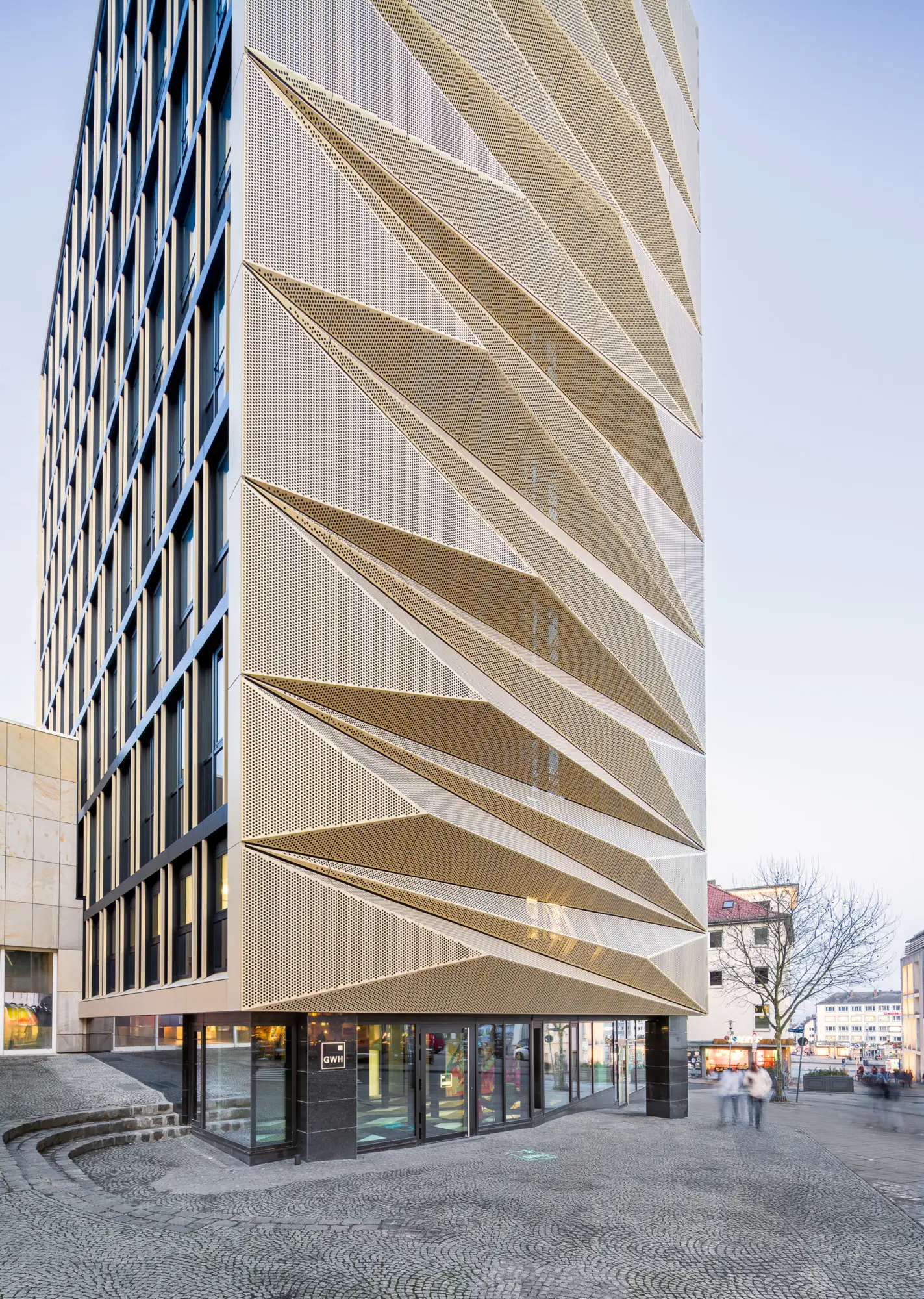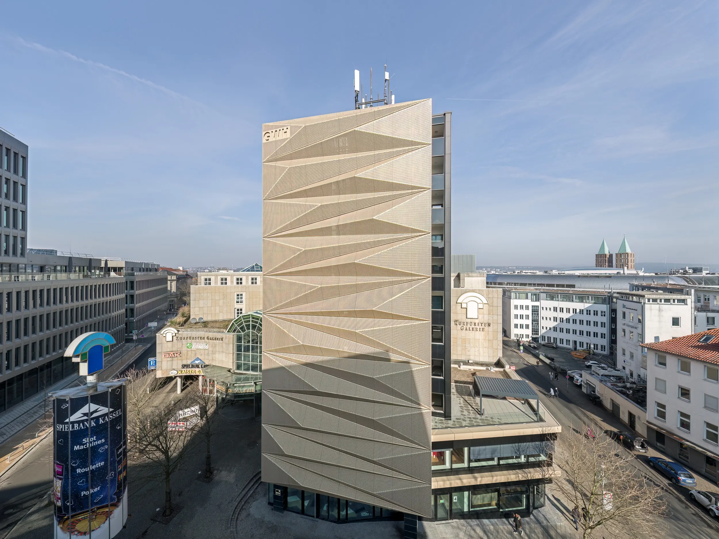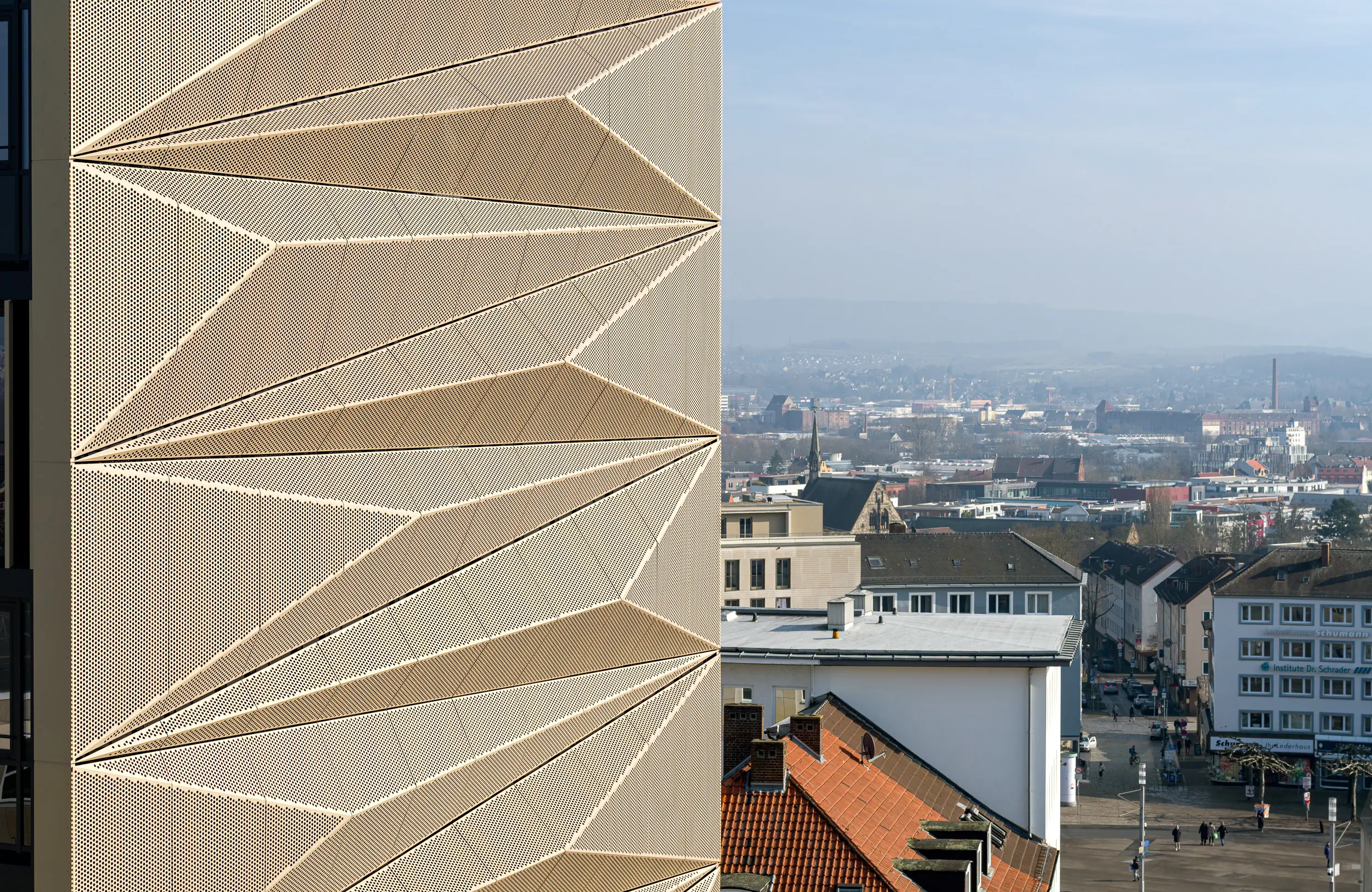 The GWH Headquarters in Kassel has been refurbished, featuring a three-dimensional facade system. The sand-coloured aluminium panels were designed using parametric planning methods. The cut-outs have been placed individually for all the panels to create and control the characteristic interplay of light and shadow. The refurbishment has been carried out in the light of the highest level of sustainability and cradle to cradle principles. A Photovoltaic system is integrated in the overall design and makes optimized use of the orientation of the facade. The subtle and unique design ensures a timeless character for the new GWH Headquarters.
