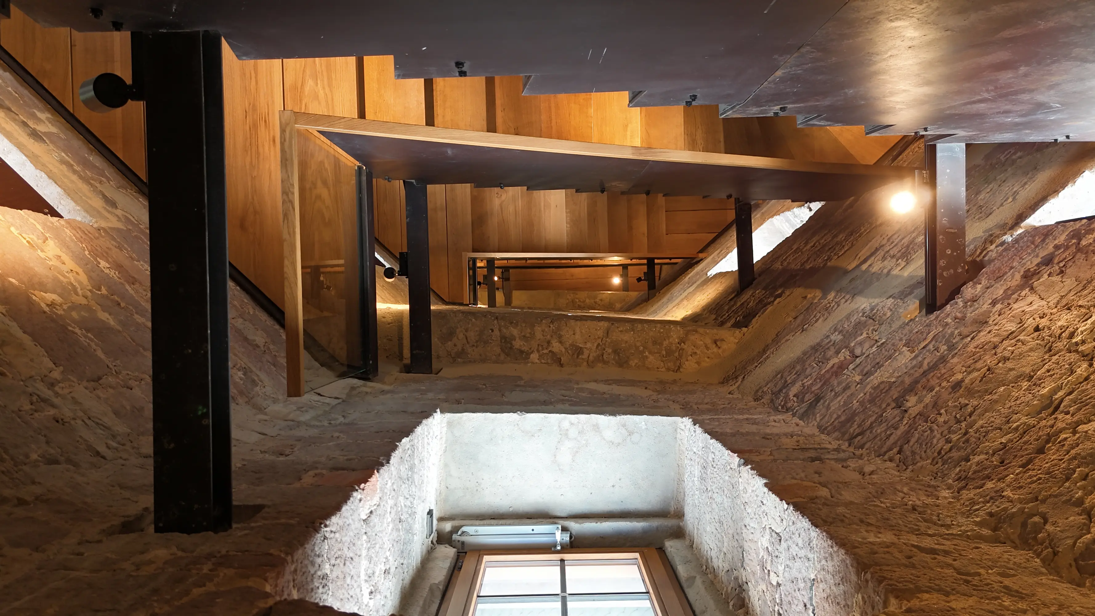 The tower of the Fulda city palace is a landmark building in the baroque city centre. As part of the overall renovation, a lift and a staircase have been incorporated into the cultural monument in such a way that different perspectives create an exciting interior space within the atmospheric historic shell. The architectural style continued at the top of the tower. An abstract steel structure has been designed to reflect the historic shape of tower domes, which are known during the Renaissance and Baroque period but whose exact outline has not been handed down. Finally, the museum-like interior complements the overall concept.