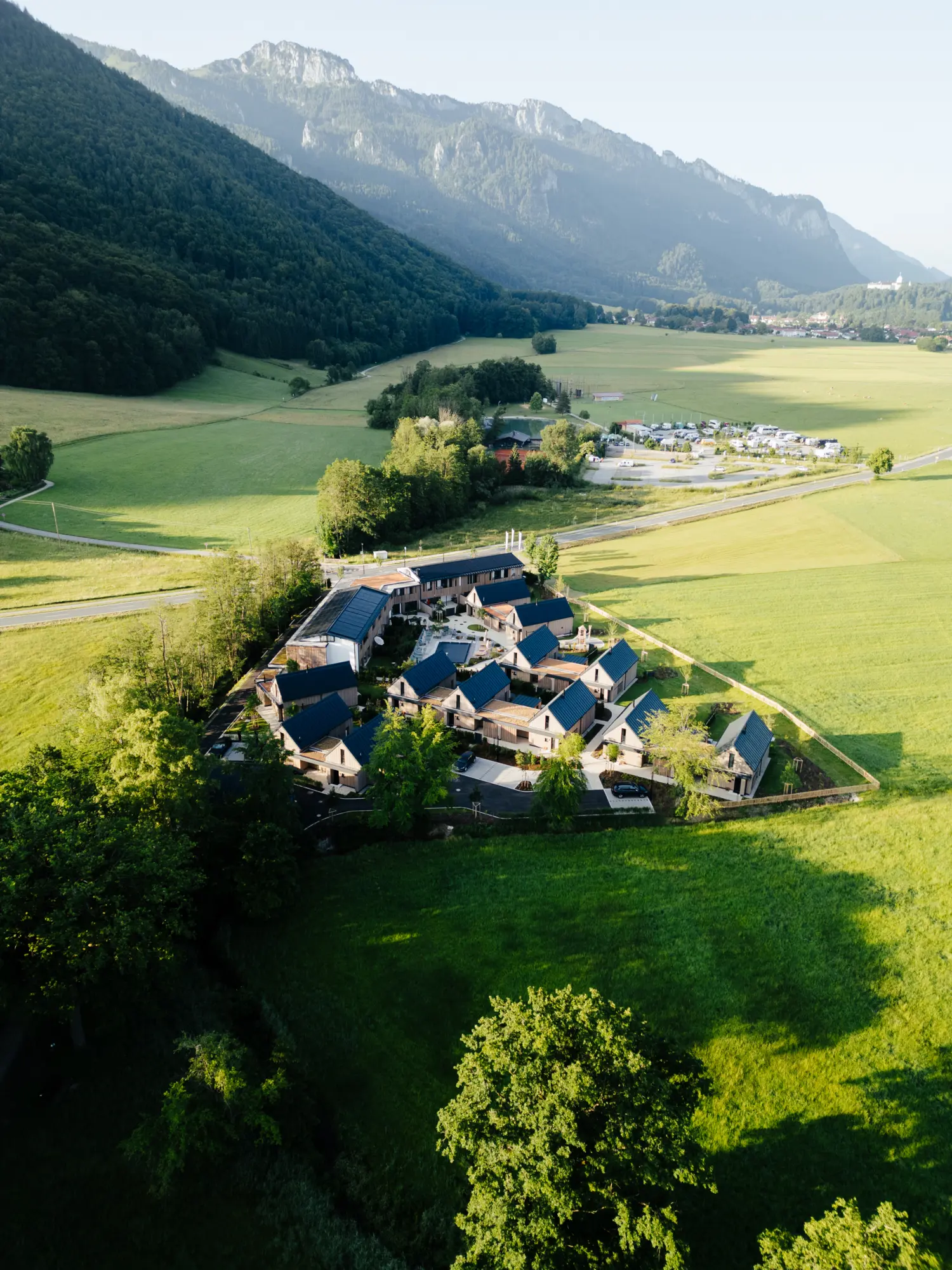 The Agrad Chalets in Aschau, Bavaria, transform the site of a former campsite into a family-run chalet village, sustainably embedded without land expansion. A wing building serves as noise barrier, entrance and houses 15 suites. Behind it, 12 chalets align with views of the mountains and Hohenaschau Castle. Despite the nearby road, guests experience the calm of a village. Regional craftsmanship, natural materials and private wellness areas merge with shared spaces like square and pool. Located at the edge of a moor, the chalets are the ideal starting point for nature and cultural experiences.