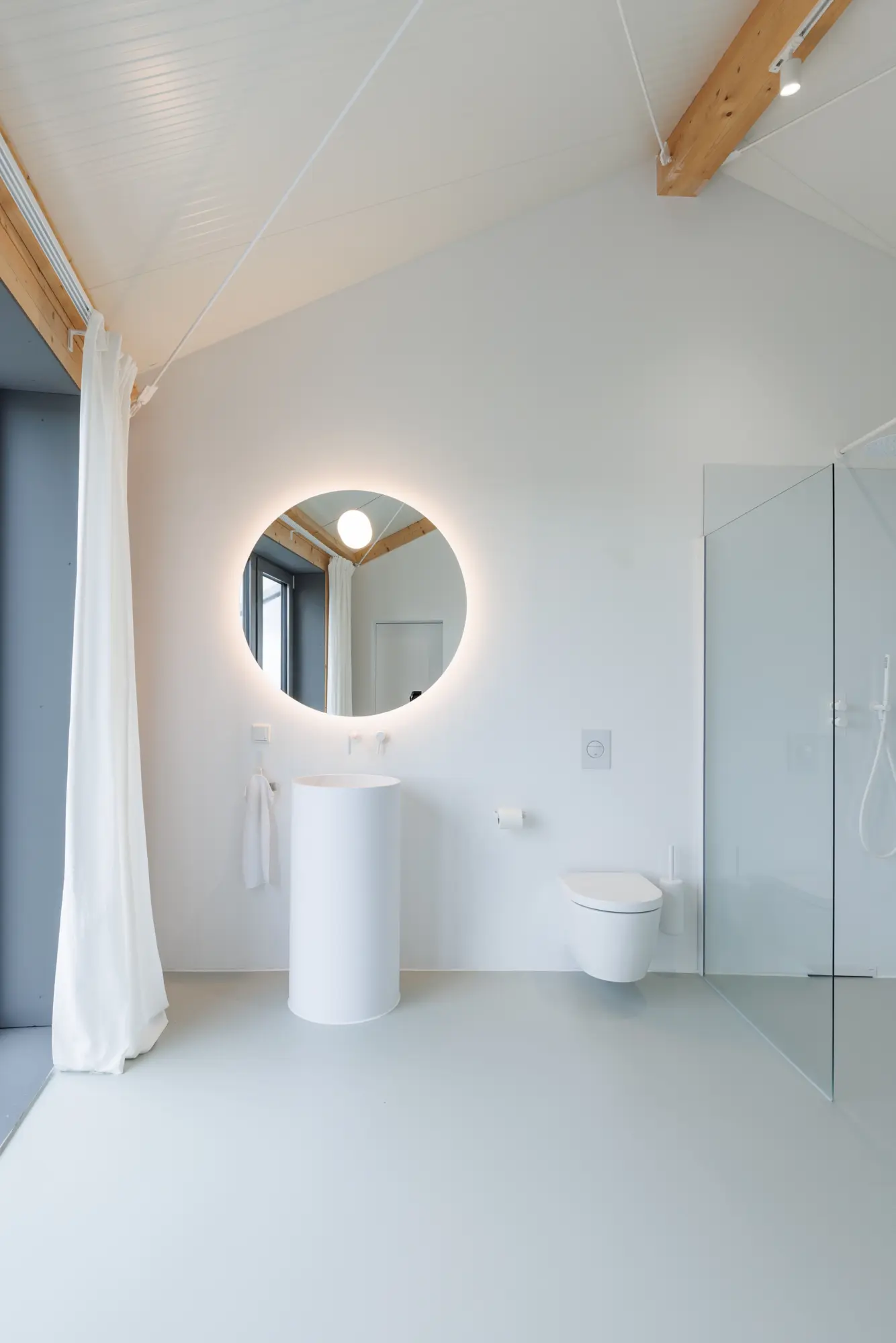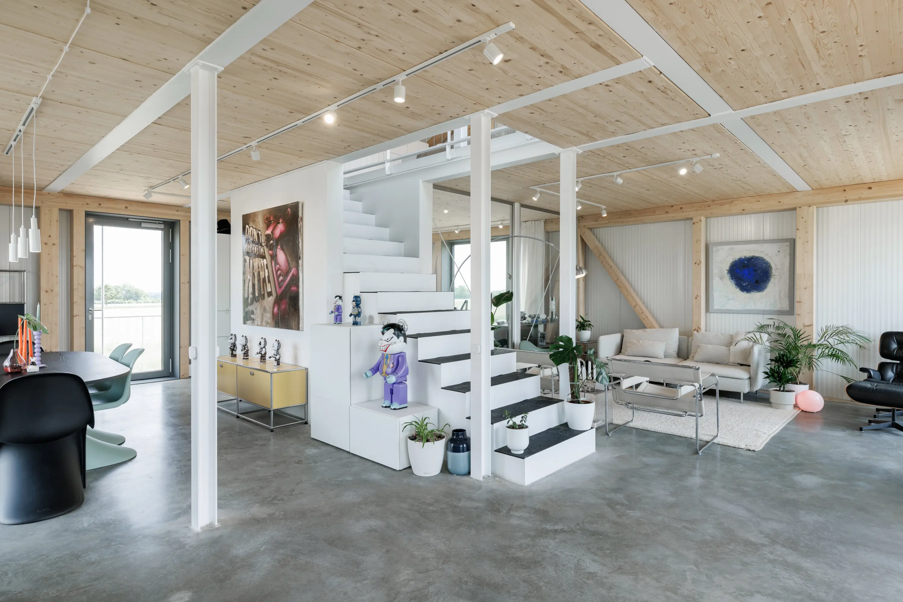 The stilt house is an attempt to conceive a building in harmony with nature. The concept aims to keep interventions to a minimum. The ground is only disturbed for the foundations of the columns; no surfaces are sealed. The ground floor remains open. The building is primarily made of recyclable materials or wood. A timber-framed structure with a sandwich panel shell stands on a steel table. The resulting space is highly flexible and can be freely divided by the users. The staircase in the centre serves as a service unit over two floors.