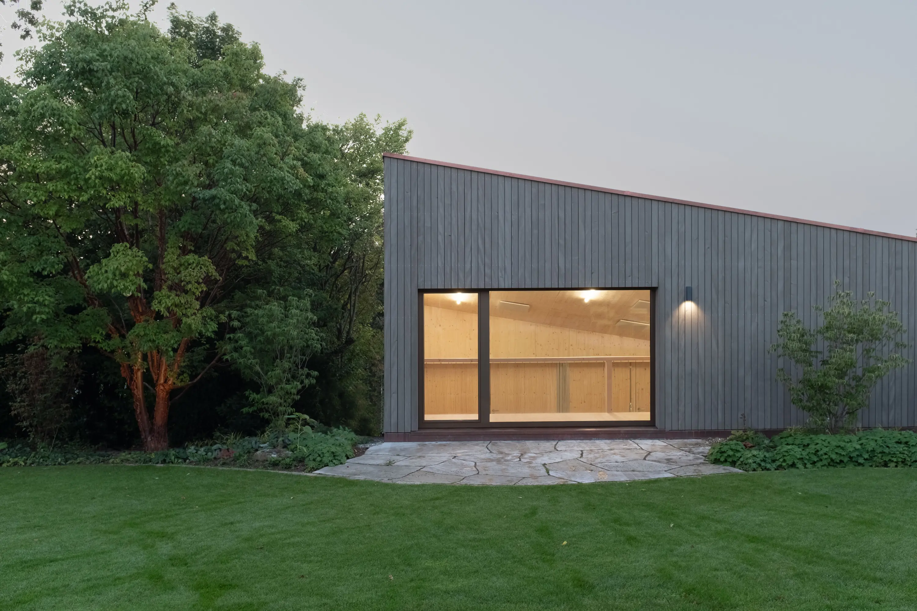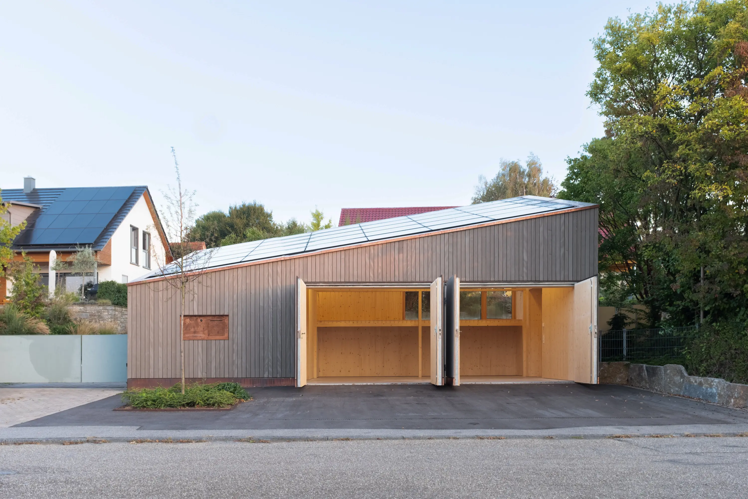 The new garage building blends into the sloped residential area with a modern, refined design. A perfectly south-facing photovoltaic roof, a large rainwater tank, and timber construction form a sustainable concept. Expressive geometry, a panoramic window, and high-quality materials create spatial quality. The architecture clearly connects street and garden, focusing on precision, natural materials, and clean detailing.