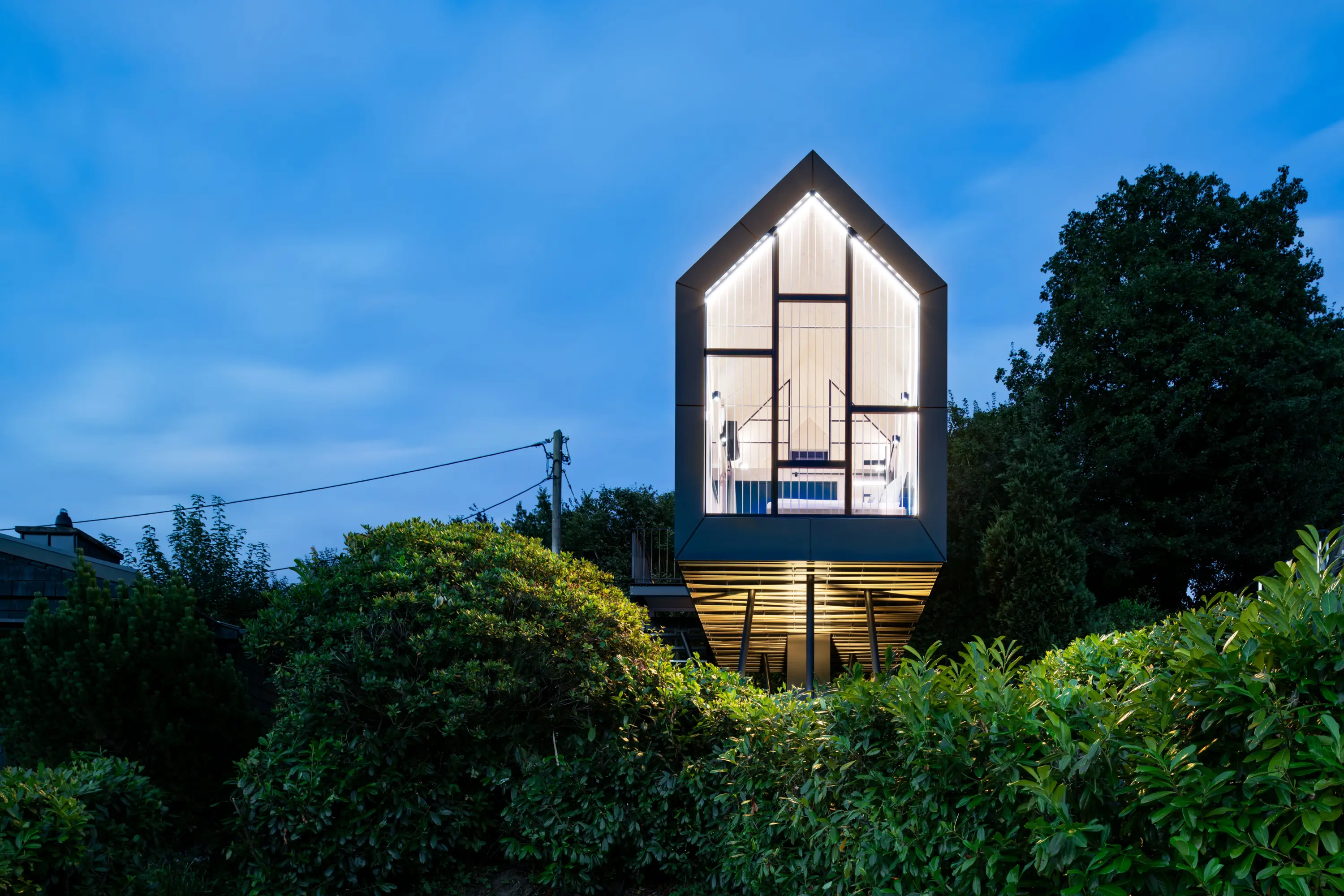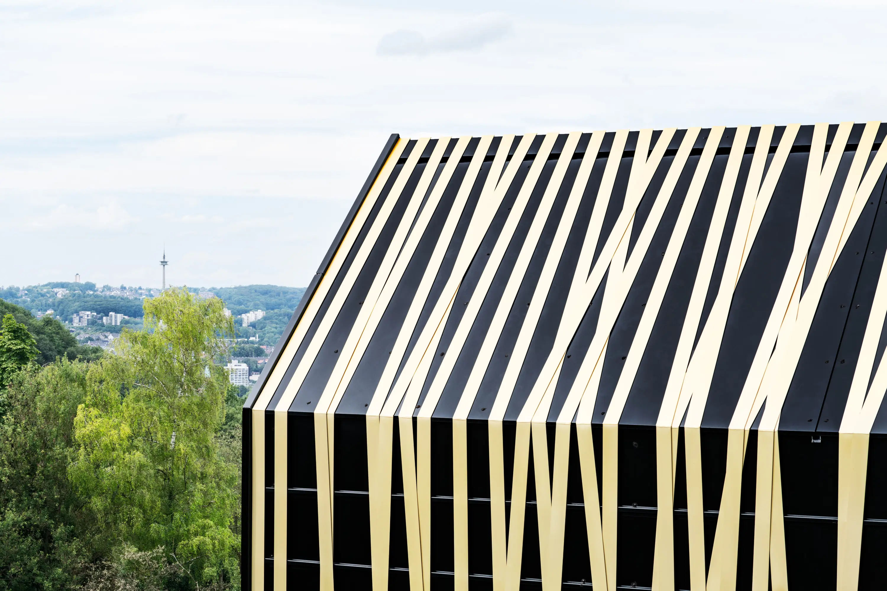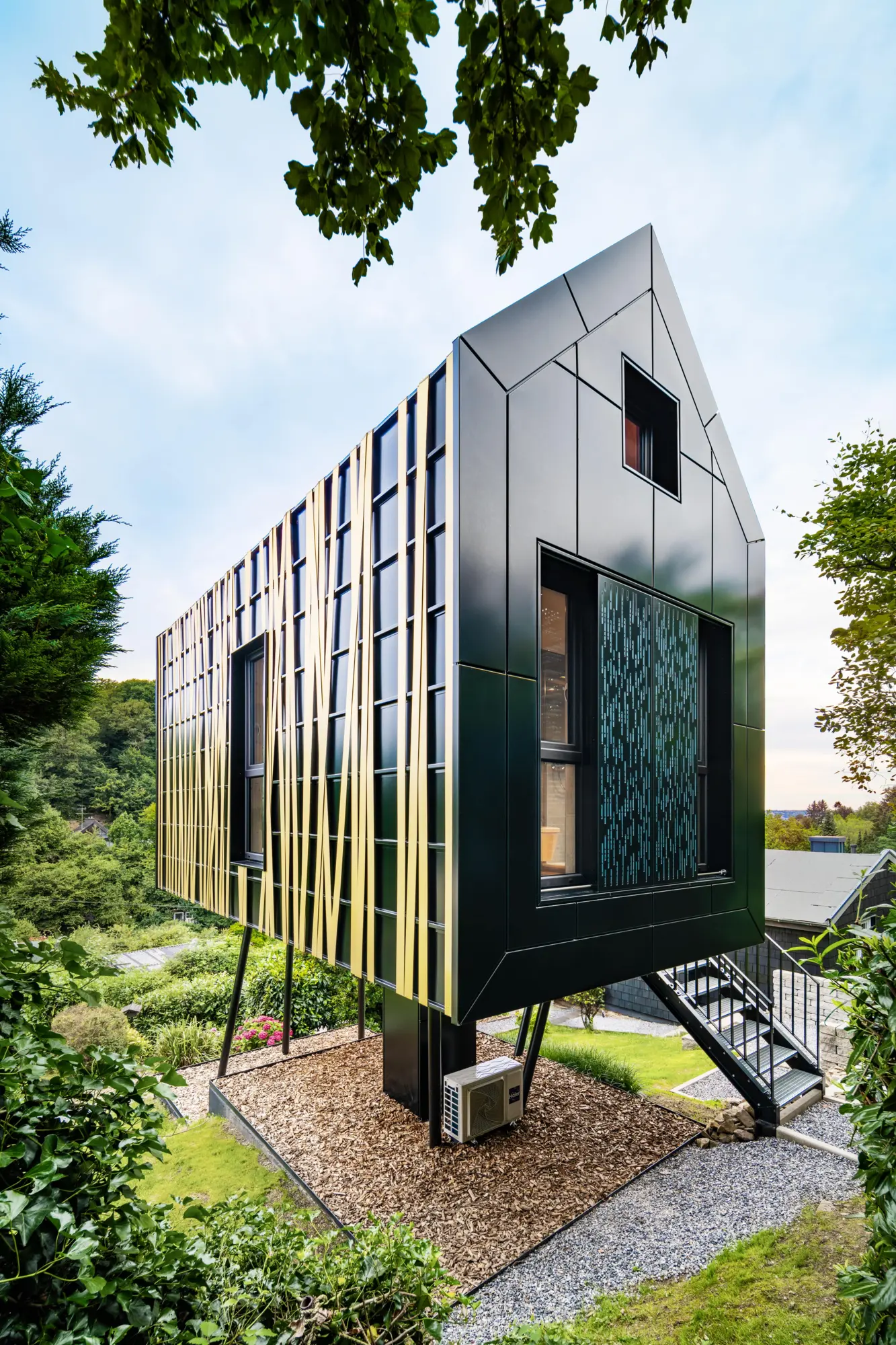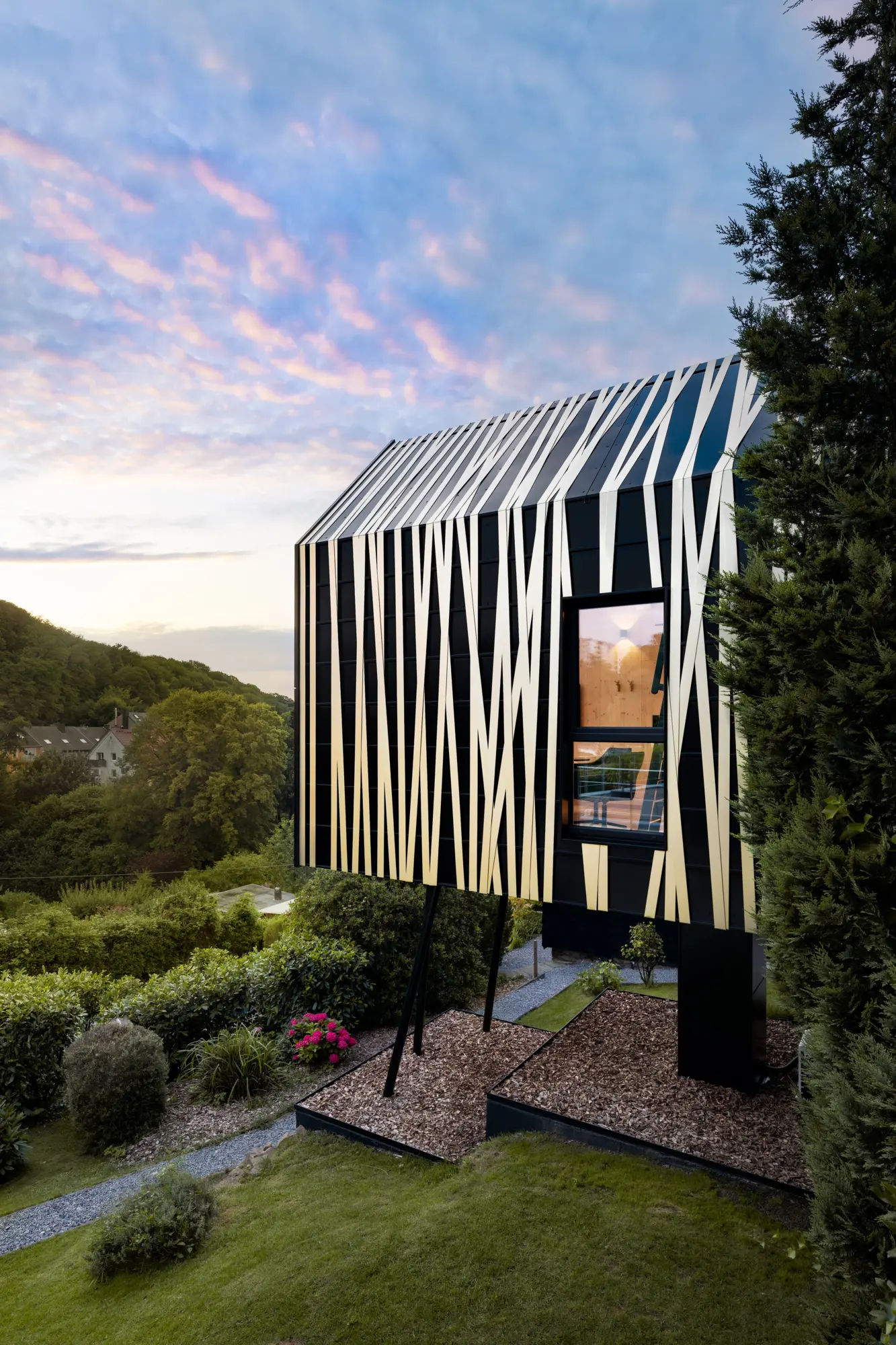An unconventional residential building that interprets the idea of a cocoon: floating, held by golden threads, protective. Instead of the originally intended golden shingles, an archetypal structure emerged, receding behind a deep black, non-reflective aluminium shell that draws focus to the slender supports – perceived as golden threads. The pure timber construction rests on a steel platform, combining emotional impact with structural clarity.