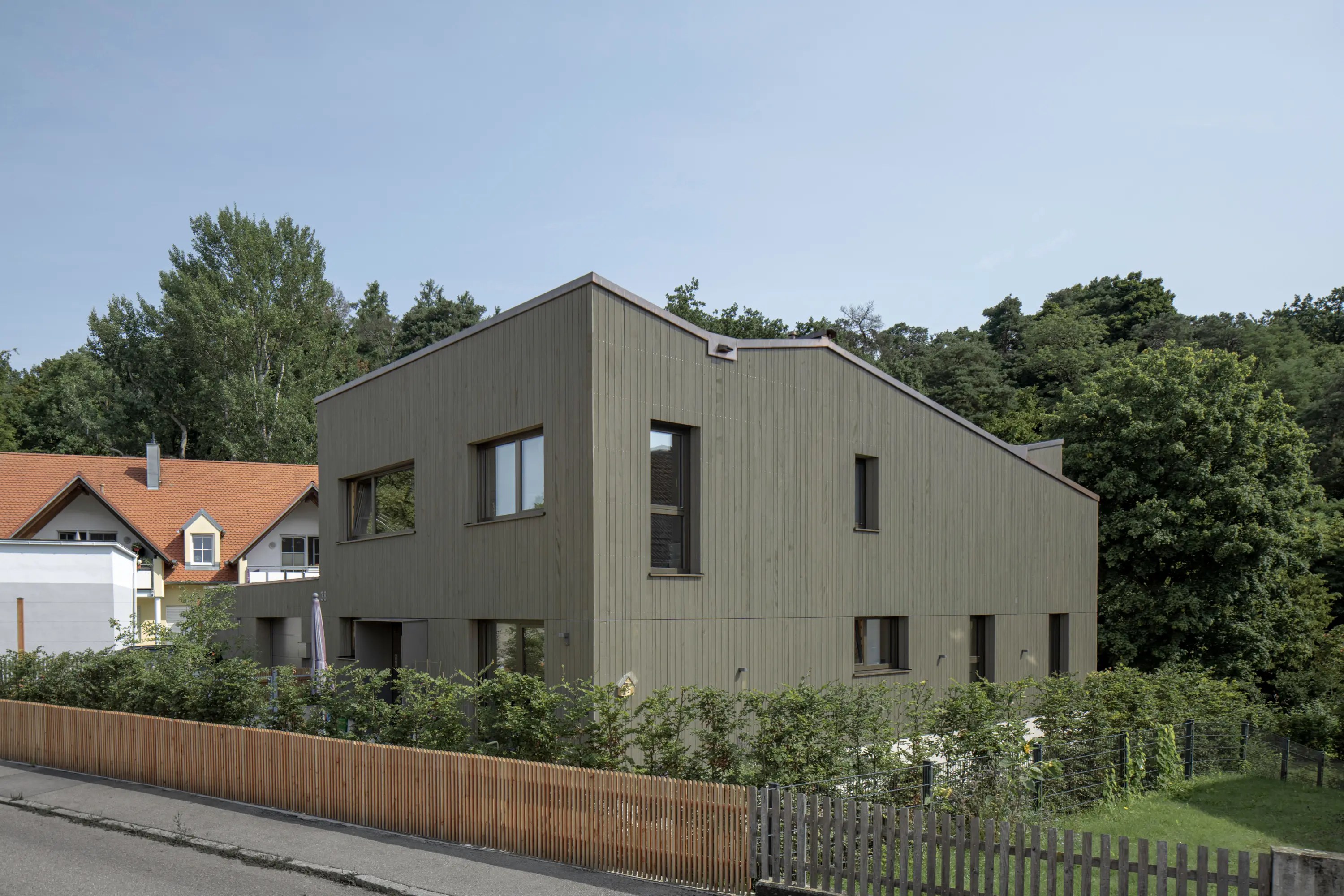 Set on a tapered hillside plot within a mature neighbourhood of pitched-roof houses, this single-family residence translates the site’s constraints into a clear architectural statement. The striking roof form emerges from the desire to maximize the plot while respecting required setbacks. Inside, the sloping terrain unfolds in a dramatic double-height living room with a gallery dining area, creating expansive spatial vistas. A central picture window frames the spectacular view of the surrounding forest. The private quarters are discreetly arranged on the upper floor.