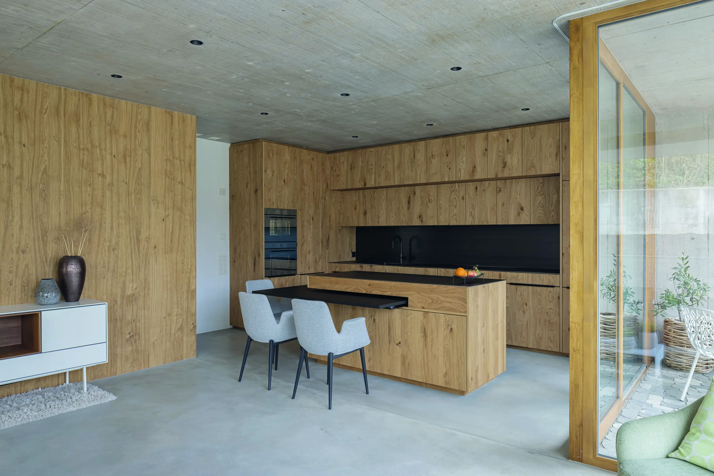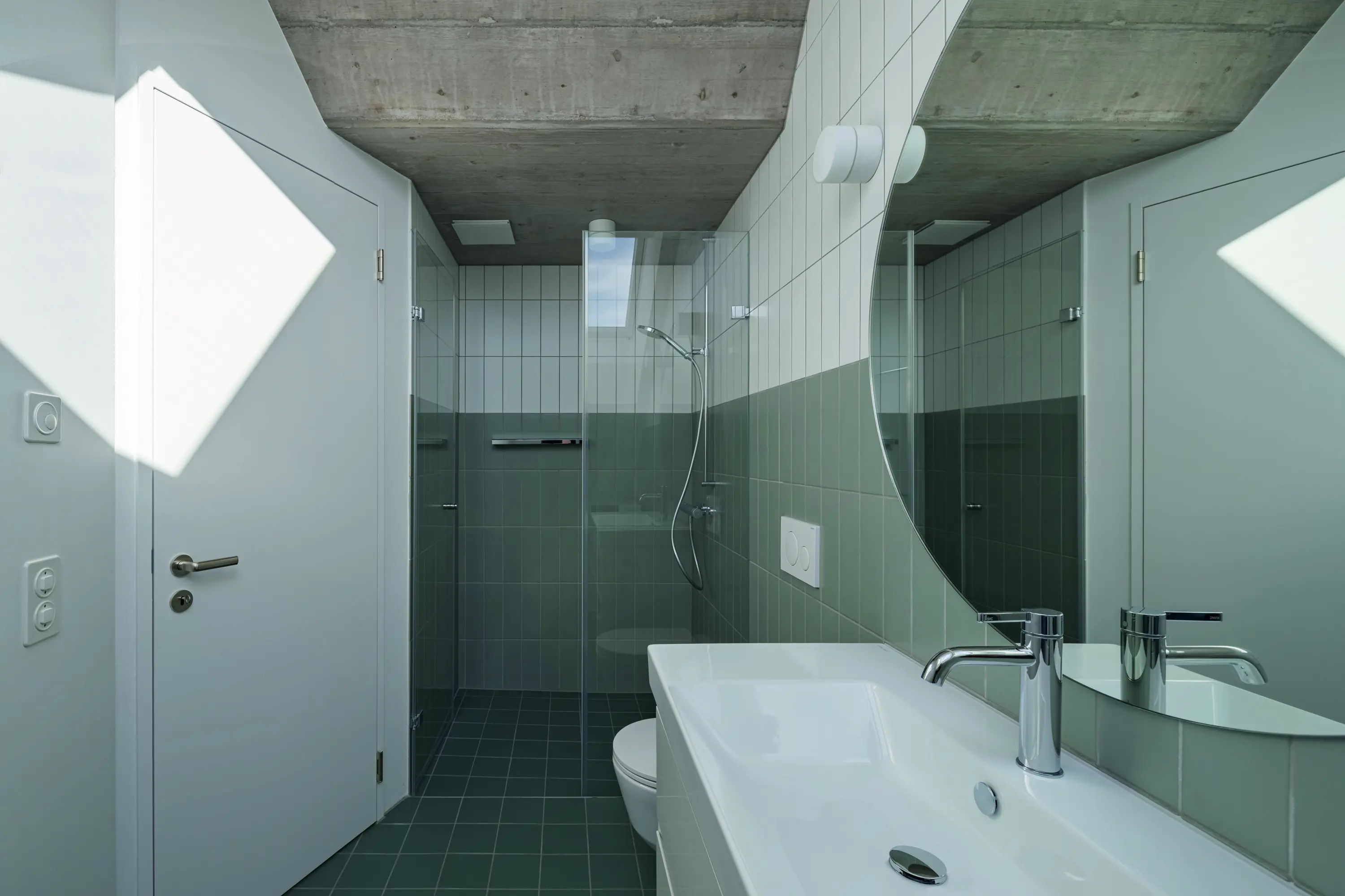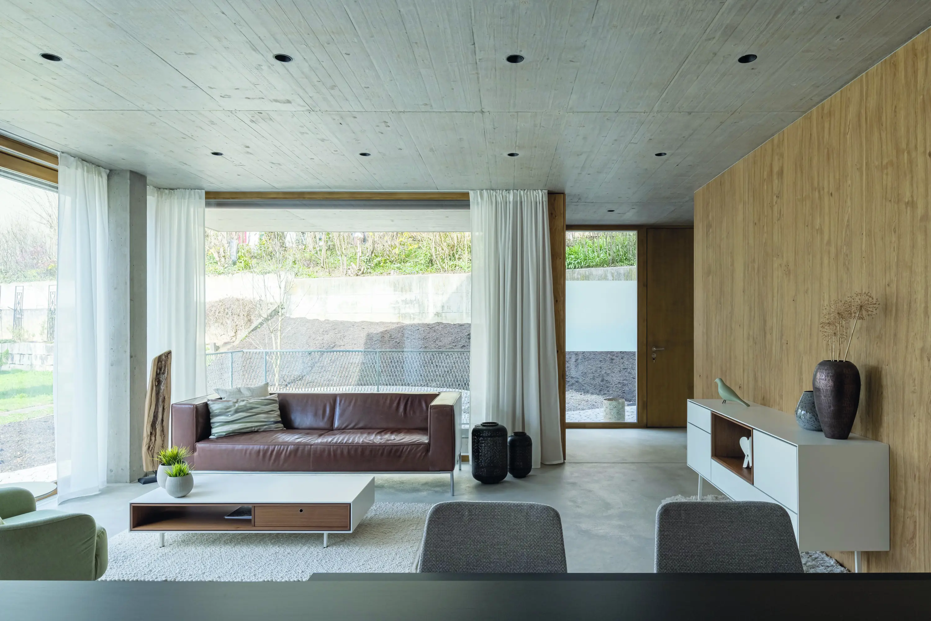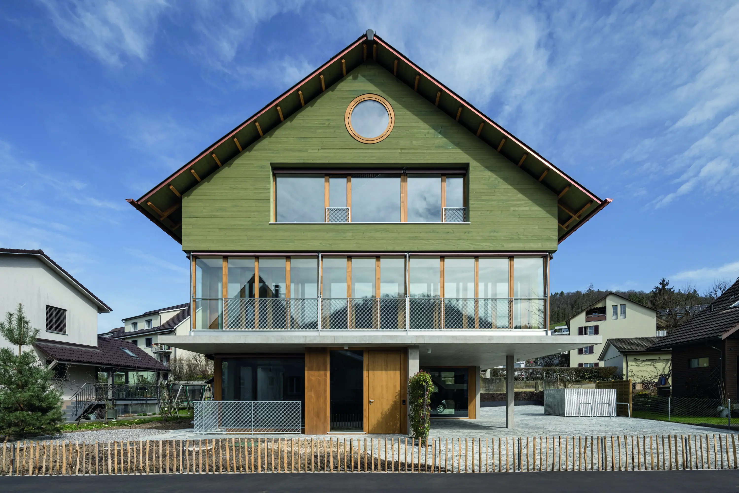 In the midst of a residential neighborhood in Sissach stands the new multi-family house with four apartments. The building comprises three residential floors as well as a gallery and a basement level. All apartments extend over multiple floors, creating exciting spatial experiences. The building is constructed as a solid structure with a ventilated wooden facade. The pronounced exposed concrete base floor forms a deliberate contrast between the garden area and the floors above.