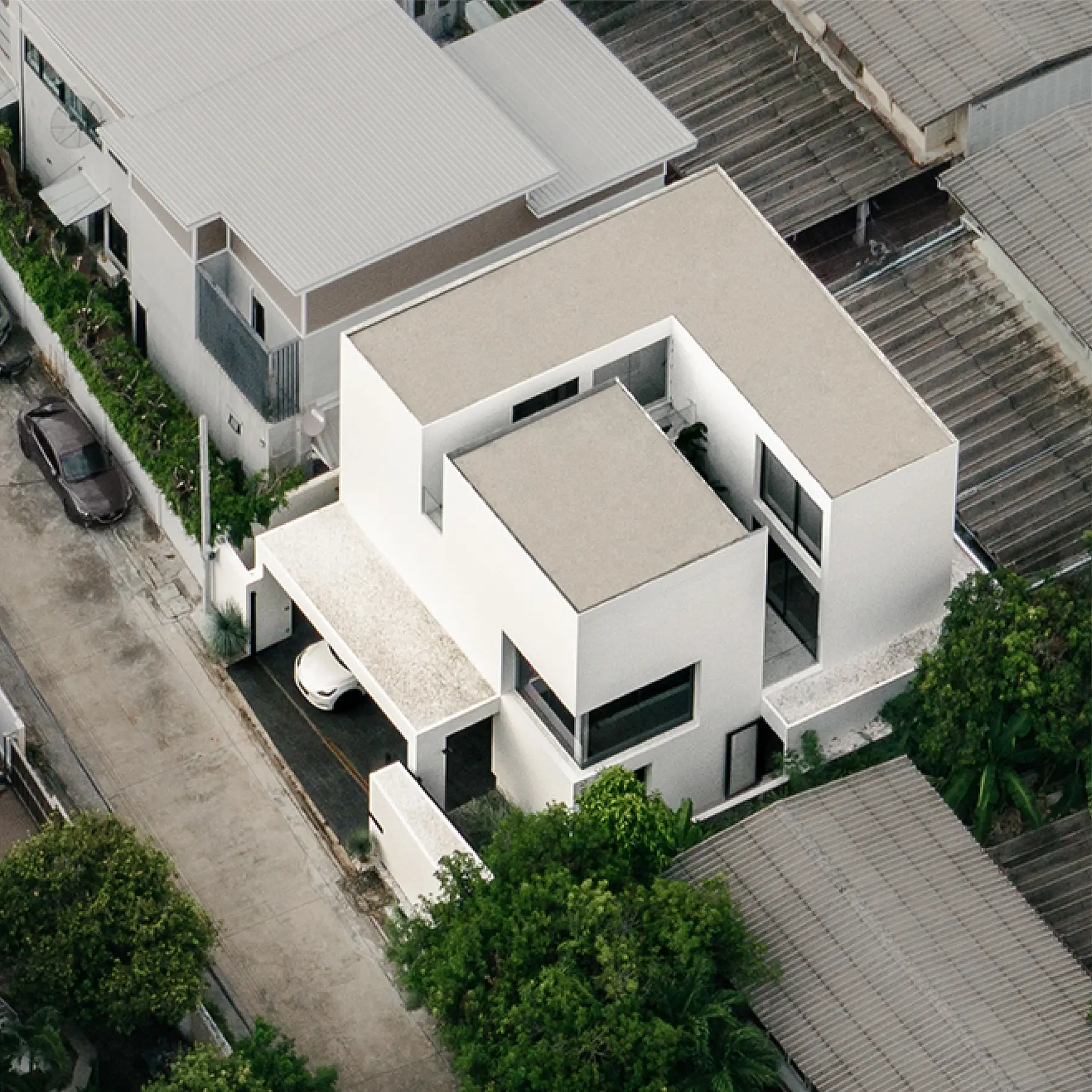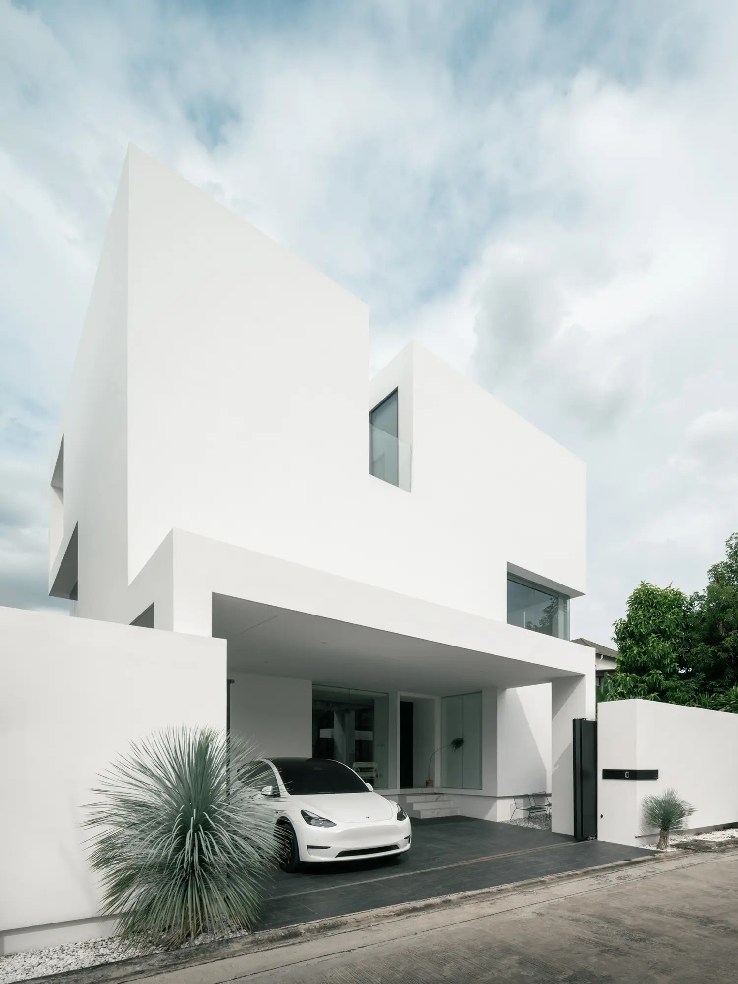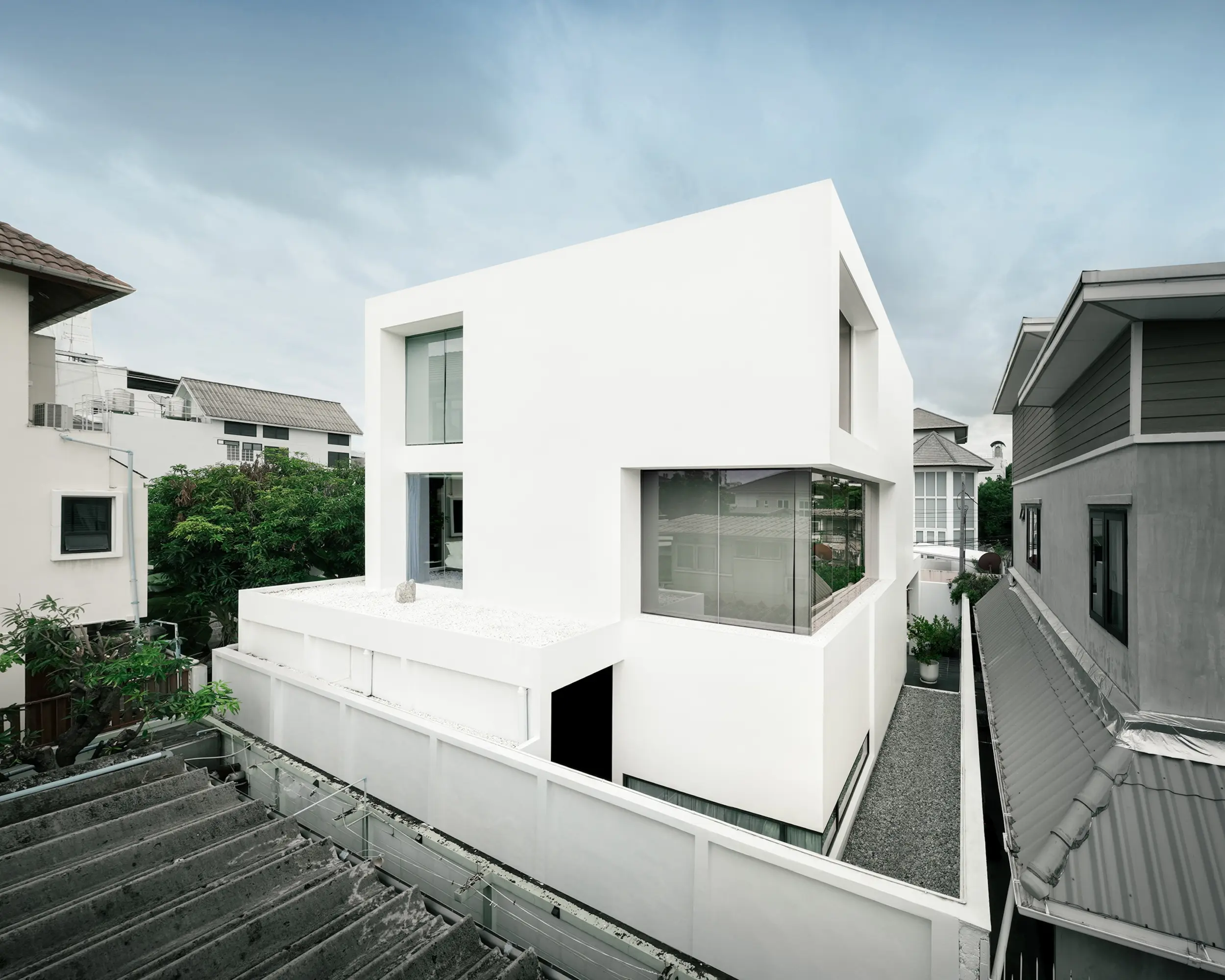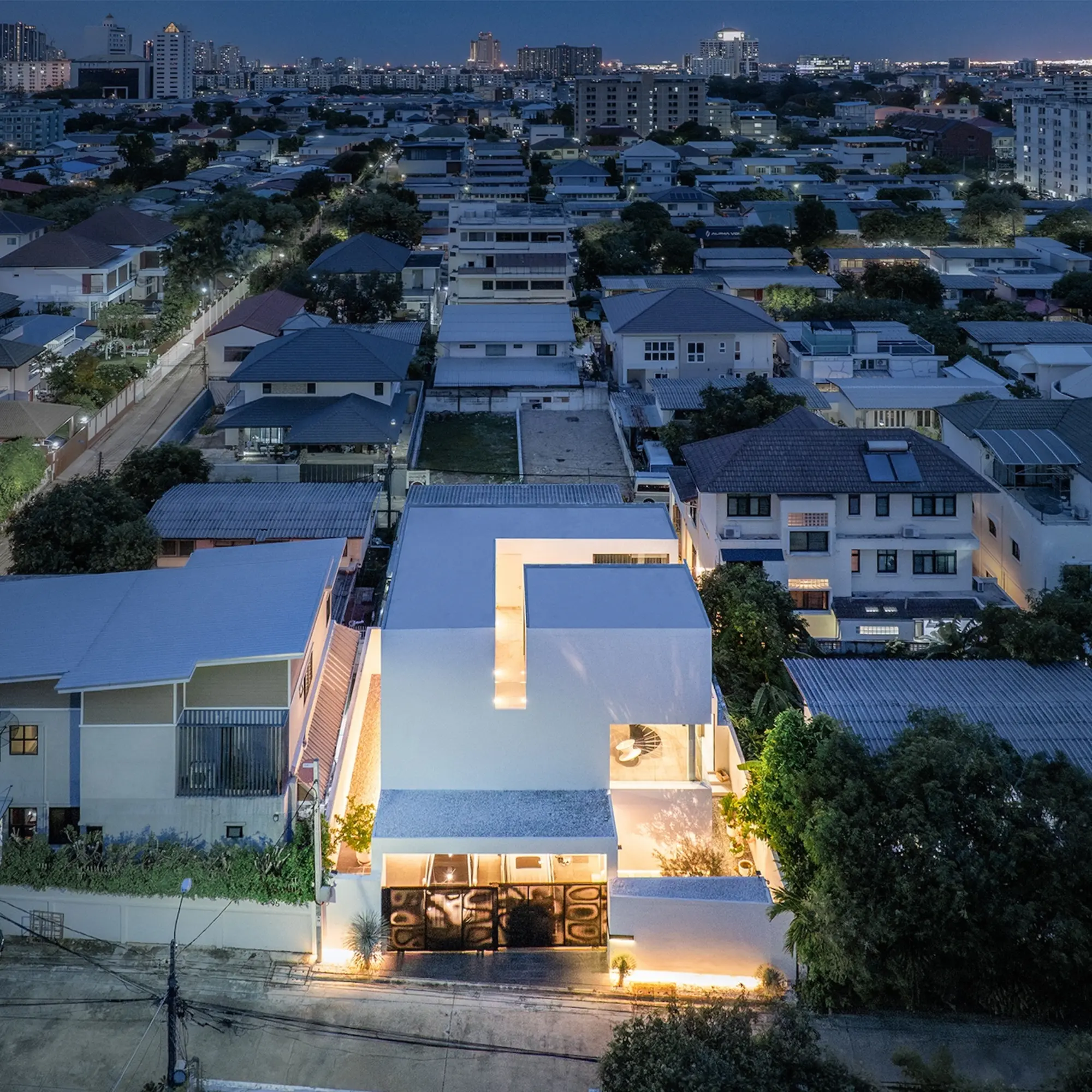 OB House showcases architectural character through the rhythmic interplay of mass and void in a cubic form. Minimalist yet timeless, the design carves voids to invite light, airflow, and continuity while maintaining privacy. From outside, the house appears as a solid box, yet inside, large openings, full-height glazing, and a central courtyard create openness and flow. Each programme is visually connected, with natural light and ventilation integrated into planning. The strategy—reducing mass and carving voids—expresses identity through minimalism, supported by passive design for natural ventilation and reduced energy use.