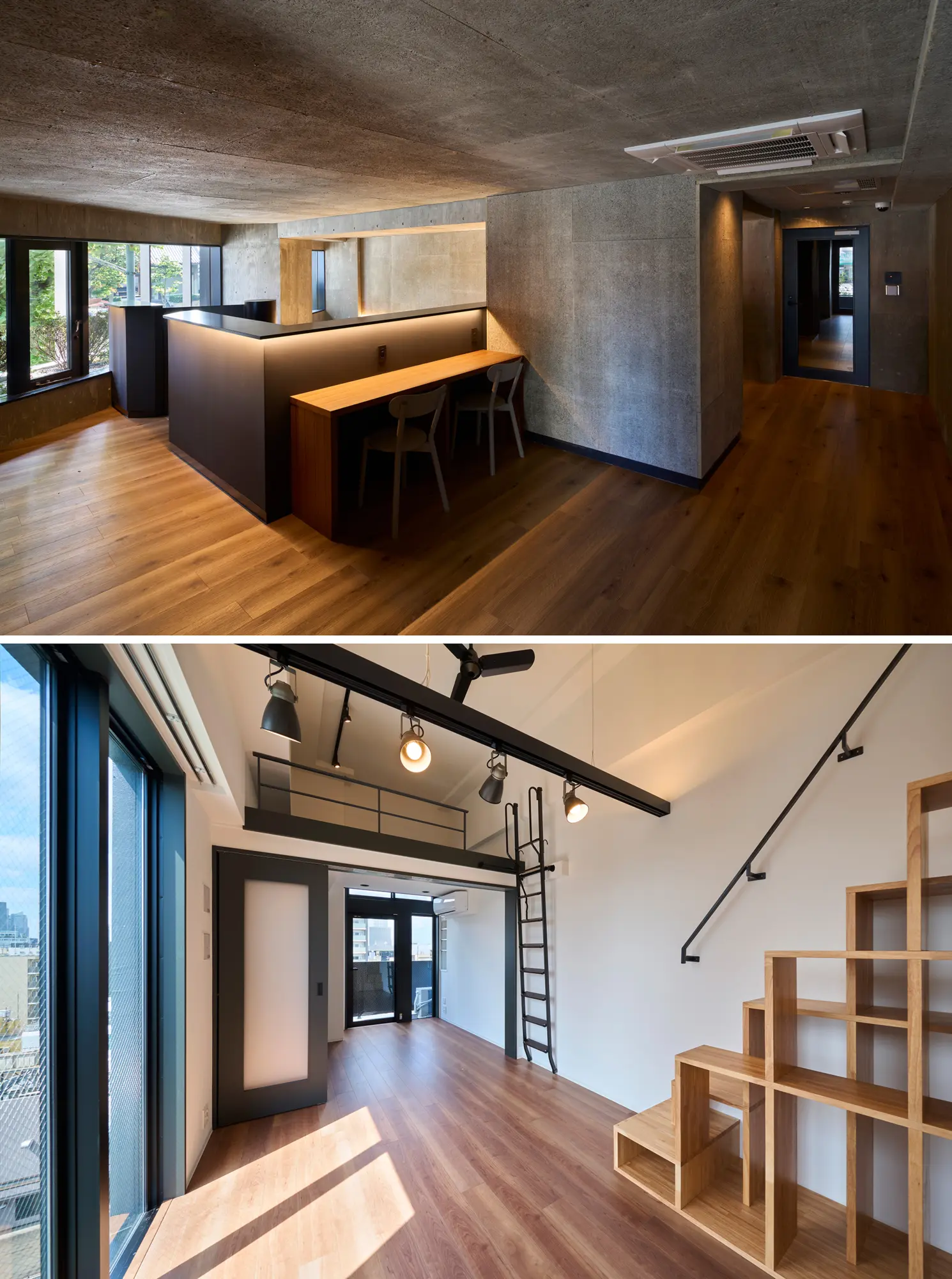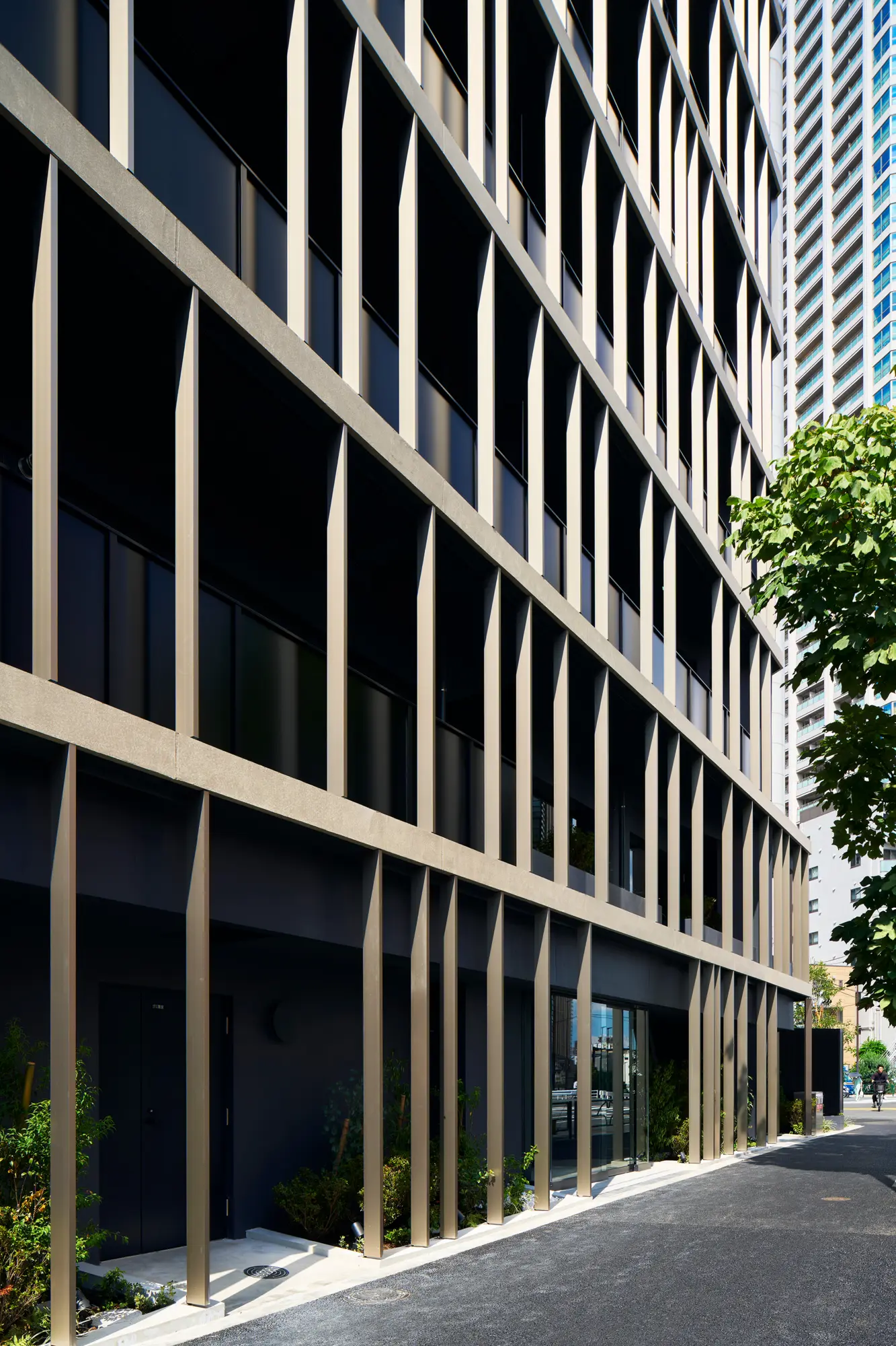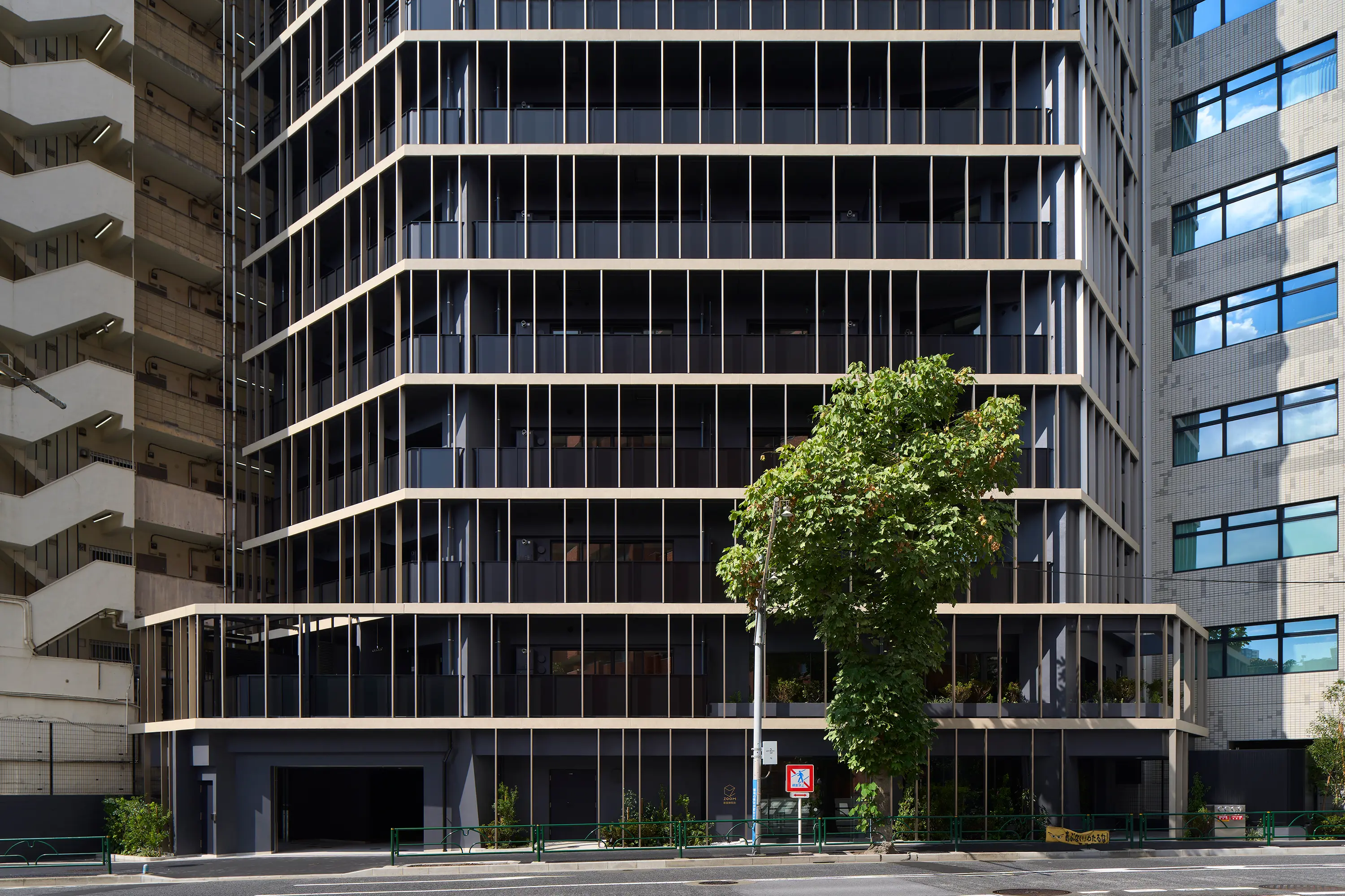 The facade of this 15-storey apartment block is divided into two elements by the combination of colours and materials. The balconies are deliberately covered with solid dark grey aluminium panels to hide the service elements that we do not want to emphasize in this apartment are unified and made to blend in and not stand out. The horizontal slabs and randomly installed vertical louvres form a delicate cage-like structure, creating a new cityscape.