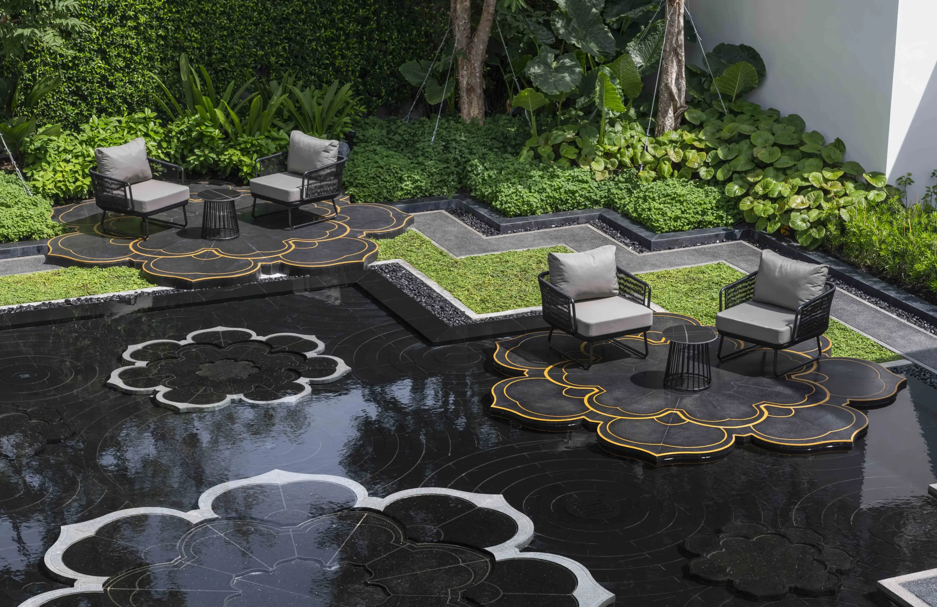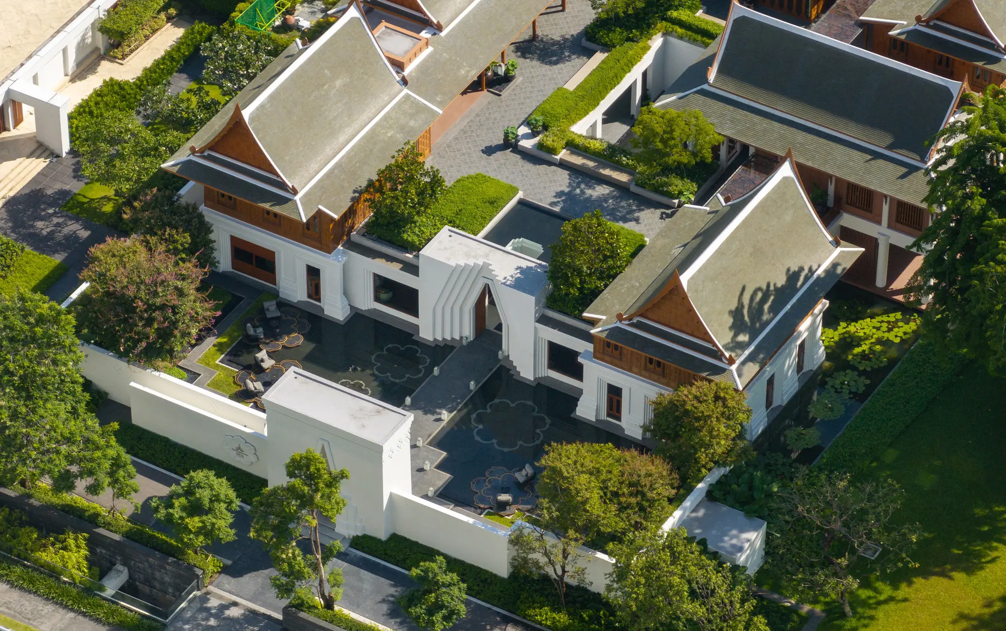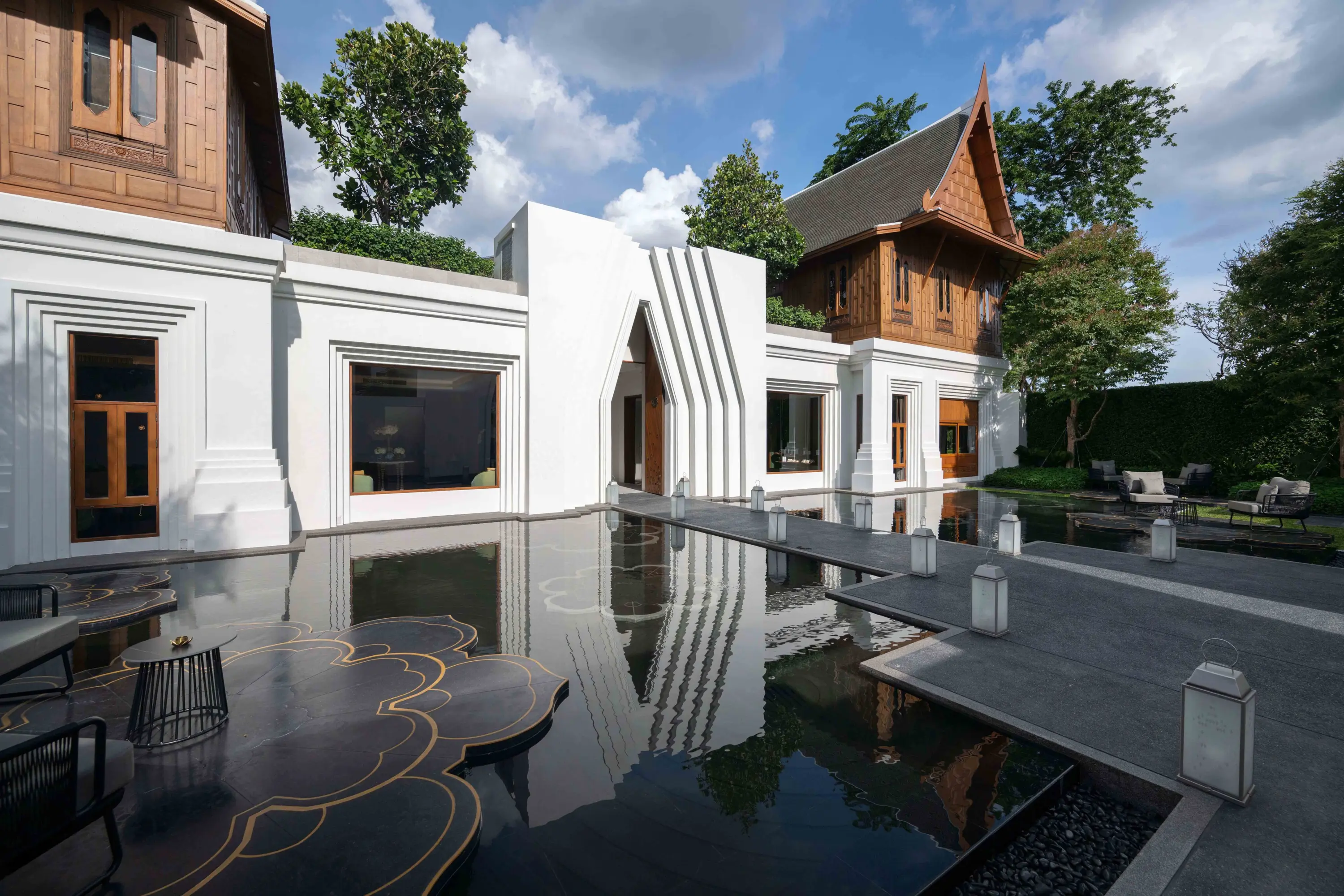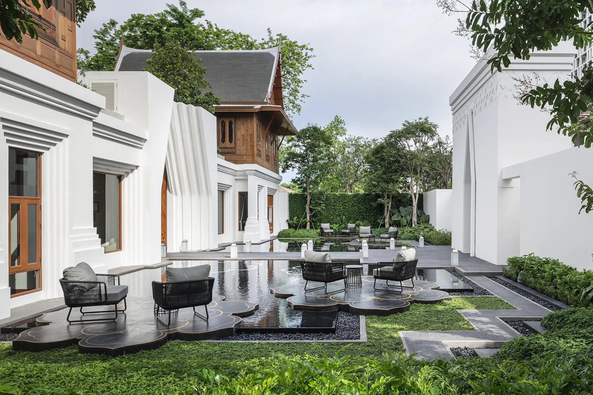 Reimagining a relocated historic structure, the project offers a sanctuary from Bangkok’s urban intensity. Landscape leads the experience: water recalls ancient moats, while pathways and textures recall Sukhothai’s cultural memory. Beneath the pool, abstract lotus motifs reflect a timeless connection, blending past and present through the image of architecture reflected on the water’s surface. Architecture, landscape and interiors converge as an integrated artwork held in timeless calm.