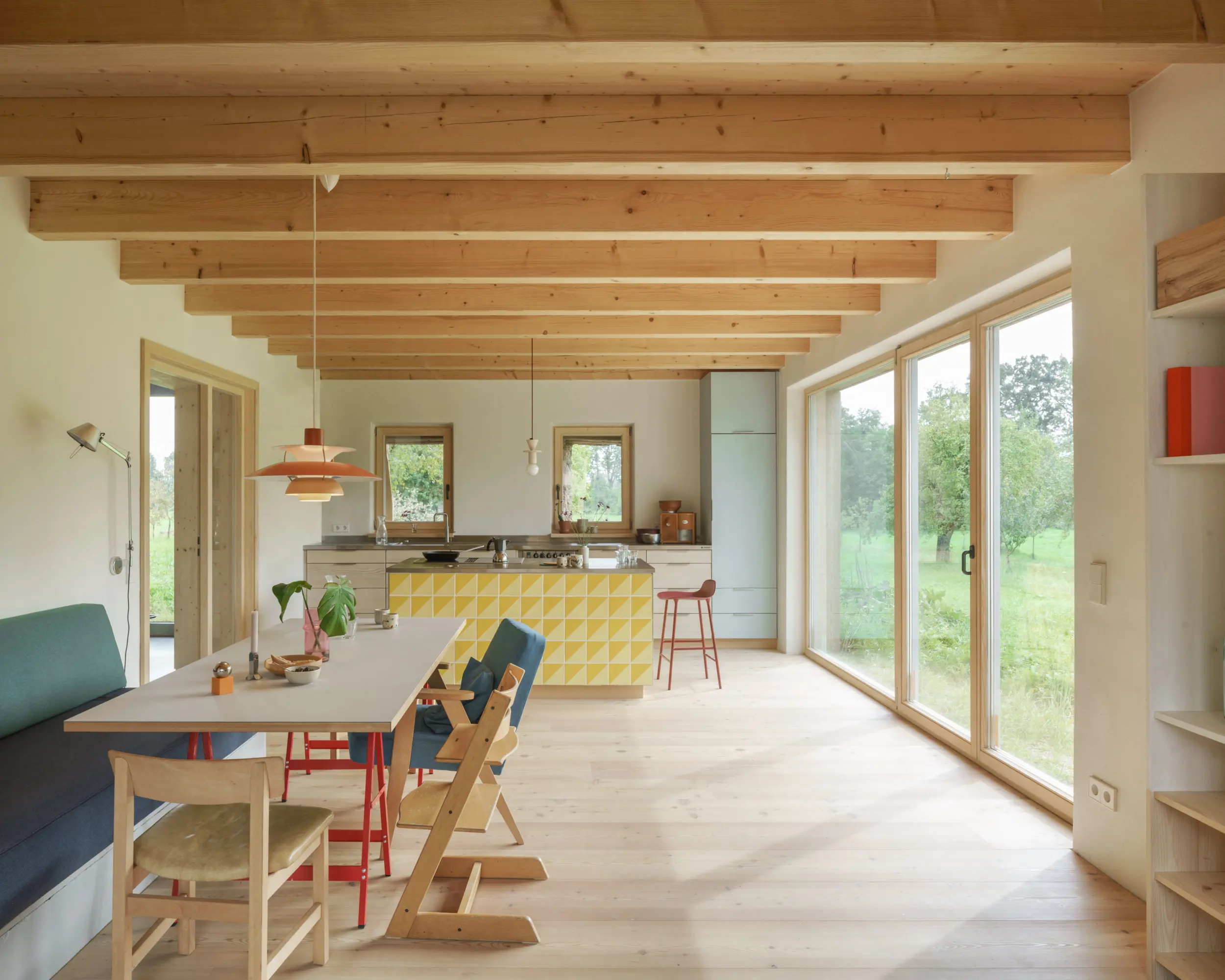 The hay barn from 1873 near Tittmoning has been given new life within the cultural landscape of the Rupertiwinkel. The design called for sensitivity to place and tradition: the barn was to remain rustic, robust, and true to its agricultural roots. Using timber from the family’s own forest, much self-help, and the skills of local craftsmen, the project became a collective effort of family and friends. The result is a home rich in personal details – from the self-laid roof and clay plaster walls to handmade tiles. A building whose creation is as unique as its outcome.