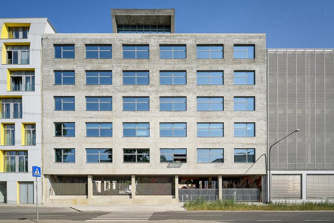 DAS BETON (THE CONCRETE) is a new construction project by Frankfurt real estate investor Ardi Goldman, located in the courtyard of his existing property at Hanauer Landstraße 136, in the harbour area of eastern Frankfurt, Germany. The 2,500 m² of loft and office space are spread across six upper floors. The elevated building features an open ground floor used as a parking level and an underground garage and is constructed in a monolithic exposed concrete design (lightweight concrete). The top floor, was built with a 6-meter-high green gabled roof, primarily using wooden construction.