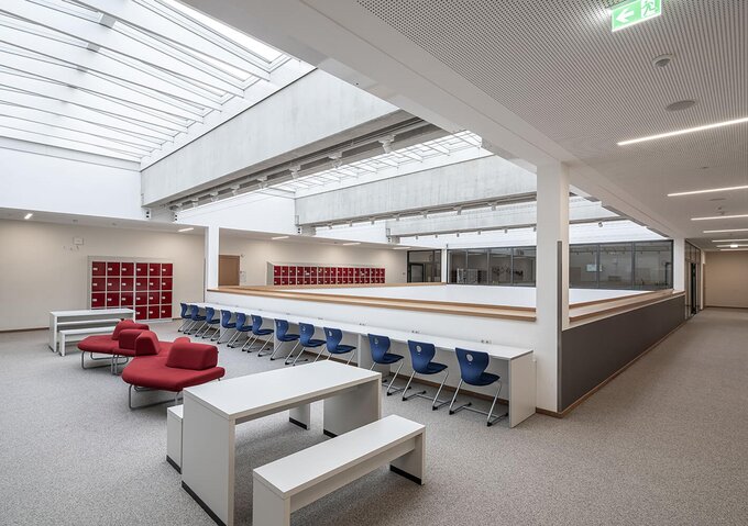 The new construction of the grammar school demonstrates how contemporary educational architecture addresses both operational and environmental needs. The clear, compact form creates functional spaces harmoniously connected by a light-flooded atrium. »Friedrich-Rückert-Gymnasium Ebern« impresses with its balanced blend of practicality and aesthetic sophistication.