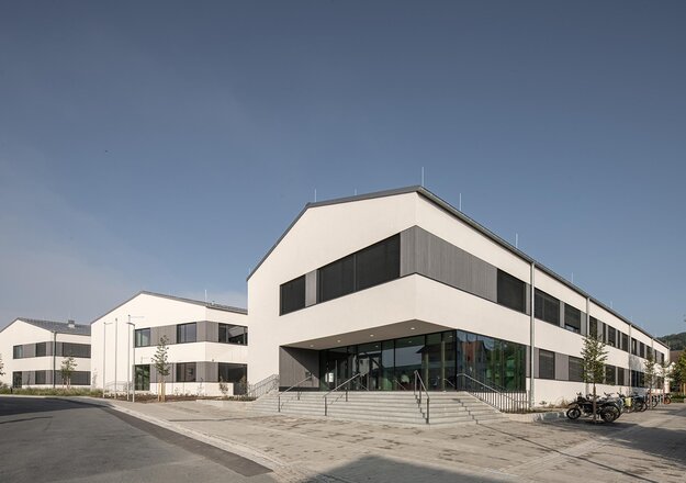 The Gymnasium Scheinfeld blends harmoniously into its surroundings, with two-story buildings featuring low-pitched gable roofs and a plaster facade. The campus includes four buildings: main entrance in the east, auditorium and cafeteria in the north, classrooms in the west, and a specialized wing with science and art rooms. Administration, library, and teacher's lounge are in the upper floor. Modern technology, central ventilation, and photovoltaics ensure contemporary learning conditions.