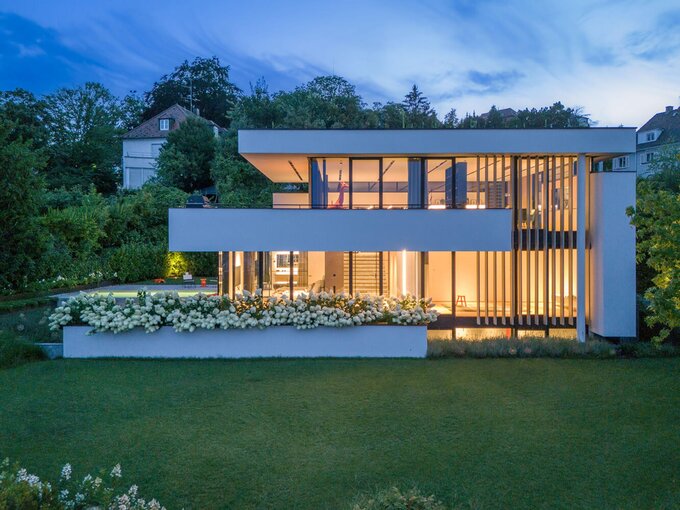 The exclusive family house»Haus Hauptmann II« impresses with a special split-level layout, which creates a seamless connection between interior and exterior space. The clear lines and generous glass fronts allow an impressive view of the city, while the iconic garage concept puts the vehicles parked there in scene as art objects.