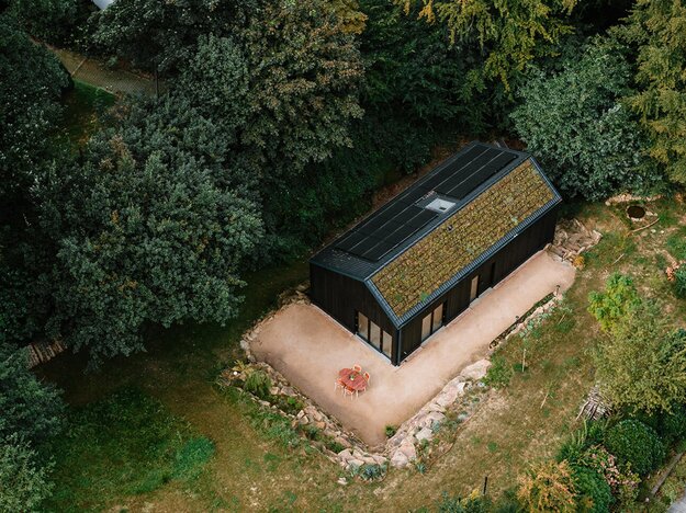 The basic idea of this project results from the natural conditions and the intention to react sensitively to the environment and nature. The single-storey wooden frame house was erected on a solid base and is placed in the existing slope structure, which remains almost unchanged. The facade is made with pre-fired wooden slats, which have been given a long-lasting carbon layer through a previous process. Thanks to a strict grid in advance, no waste was necessary in the facade. The floor plan takes into account different views of nature in all directions.
