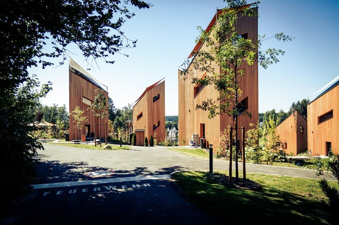 A total of 10 Midnightsky-Chalets (8 + 2 barrier-free) are situated in a forest clearing next to the IKUNA Nature Resort, accommodating up to 5 people each. The unique design was inspired by wood logs chaotically stacked at the forest edge. Using a double-shell concept (inner structure of cross-laminated timber and outer insulation of wooden studs), the very short construction time of 5 months was achieved, with the shell erected in just 2.5 days. The goal was to make the material wood tangible and experiential for guests, creating an ideal design experience for slow tourism.