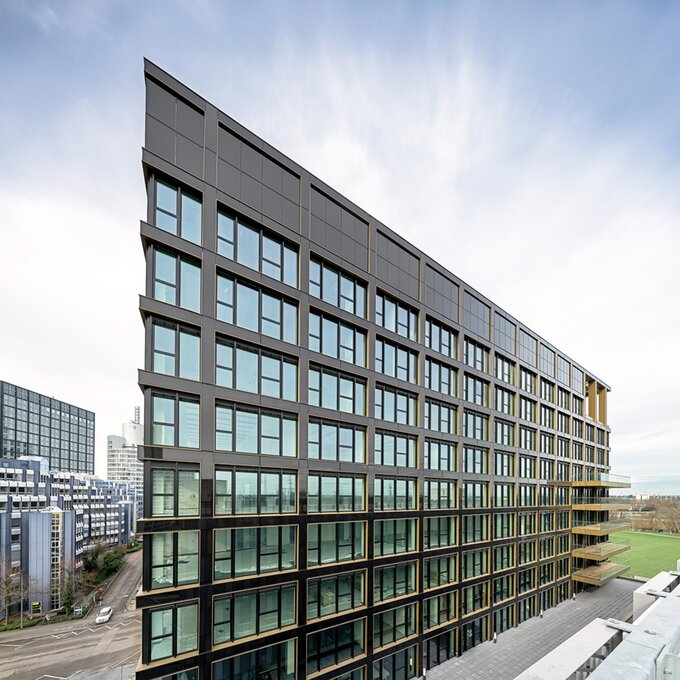 The Matchbox photovoltaic facade on all sides creates a high-quality combination of sustainability and elegance. The technology is seamlessly integrated into the architectural concept. Frame elements in a warm metallic colour frame the classic proportions of the facade grid. This gives the otherwise glass shell a pleasant and high-quality rhythmisation. The premise of the interior design is the material limitation to the essentials and the emphasis on the shell elements. Matchbox offers flexible New Work spaces. Photo credit: Stefan Schilling.