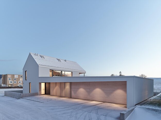 The family house takes up the regional building tradition and creates a contemporary living space that blends harmoniously into the landscape. As a bright white accent, it sets a conscious counterpoint to the surrounding architecture and shows how modern design can be brought into harmony with regional context.» One Shade of White is a clear design that combines tradition and modernity.