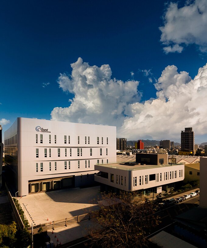 This new facility is dedicated to the research and production of high-end road bicycles for brands like Trek and Canyon. This LEED Gold certified facility is enclosed by laminated aluminium panels: precise detailing of the continuous facade communicates a sense of assurance and an underlying aerodynamic quality. The volume is lifted off the ground, adding a sense of lightness. Rounded corners and gentle concave curves on the elevations define a distinctive corporate identity. Shading blades on the facades interact with sunlight to accentuate the curvilinear volume. Interiors bring a sense of cleanliness befitting of a high-tech manufacturer.