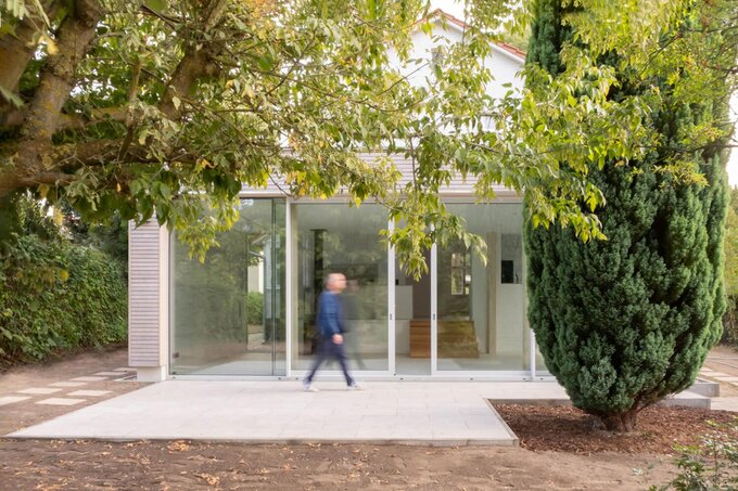 The design concept for the conversion and extension of this 1920s Berlin house is the intersection of interior and exterior spaces. A new sequence of rooms connects the elevated kitchen with the living and dining room at garden level. Exposed concrete surfaces, polished screed flooring, and a solid oak staircase define the materiality inside. The new roof construction and cladding are made of wood. There is a green roof. Original elements, such as the staircase, windows, doors, and fittings, have been preserved and refurbished. The deep plot retains several space-defining trees, including an Irish yew tree integrated into the terrace area.