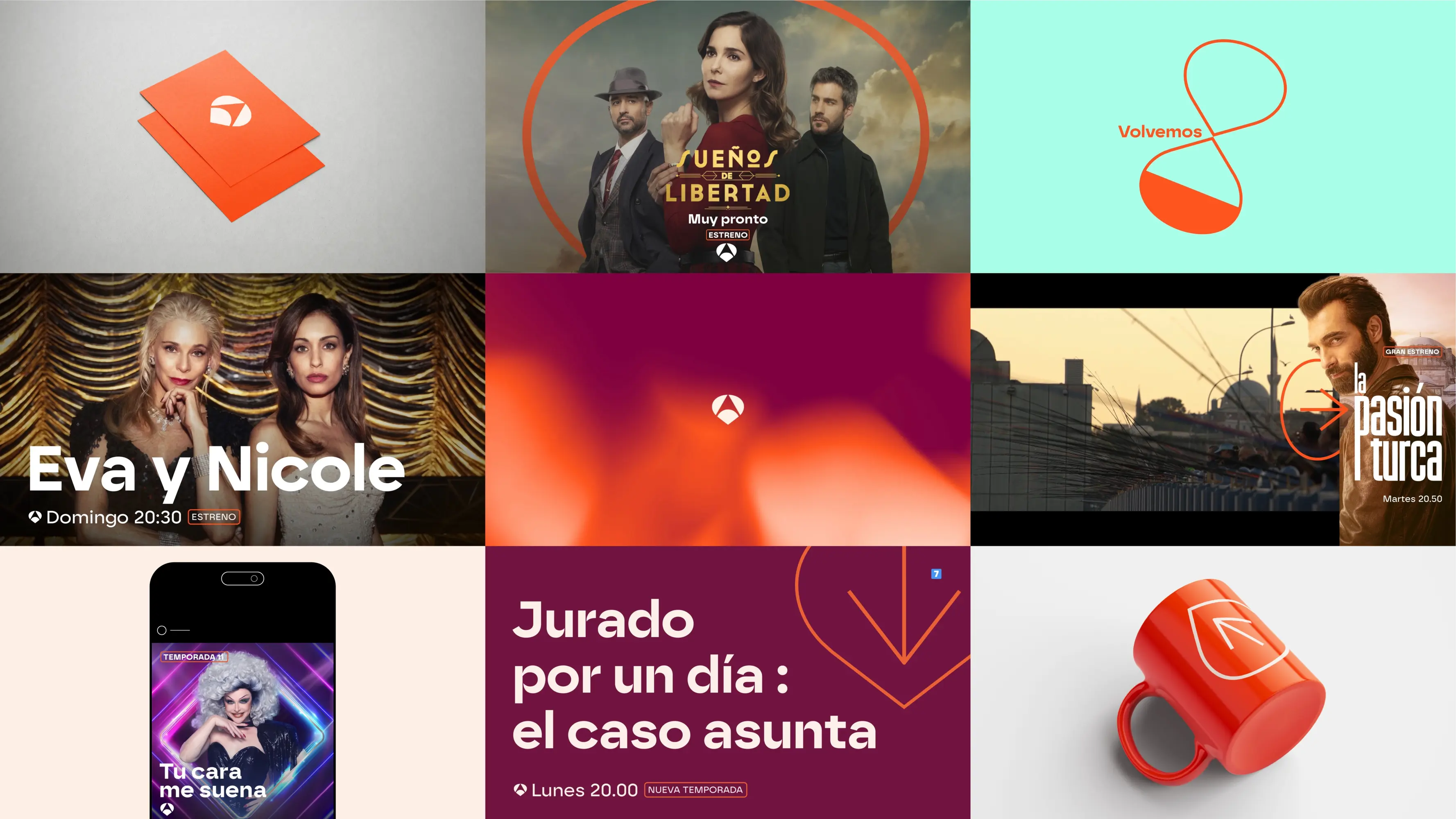 After years of leading Spain’s TV market, Antena3 was ready to embrace a more streamlined yet dynamic identity. Drawing inspiration from elements within their logo, we’ve crafted a visual grammar that reflects the diversity and richness of their content. The shape of la púa (the pick) arose as a key new element. La púa is now the multifunctional and recognizable symbol of the channel, acting as both a guide through commercial breaks and a brand identifier used next to the channel name or as a standalone logo. With a refreshed logo, updated typography, and a vibrant new colour palette, the channel marks a bold new chapter in its iconic journey.