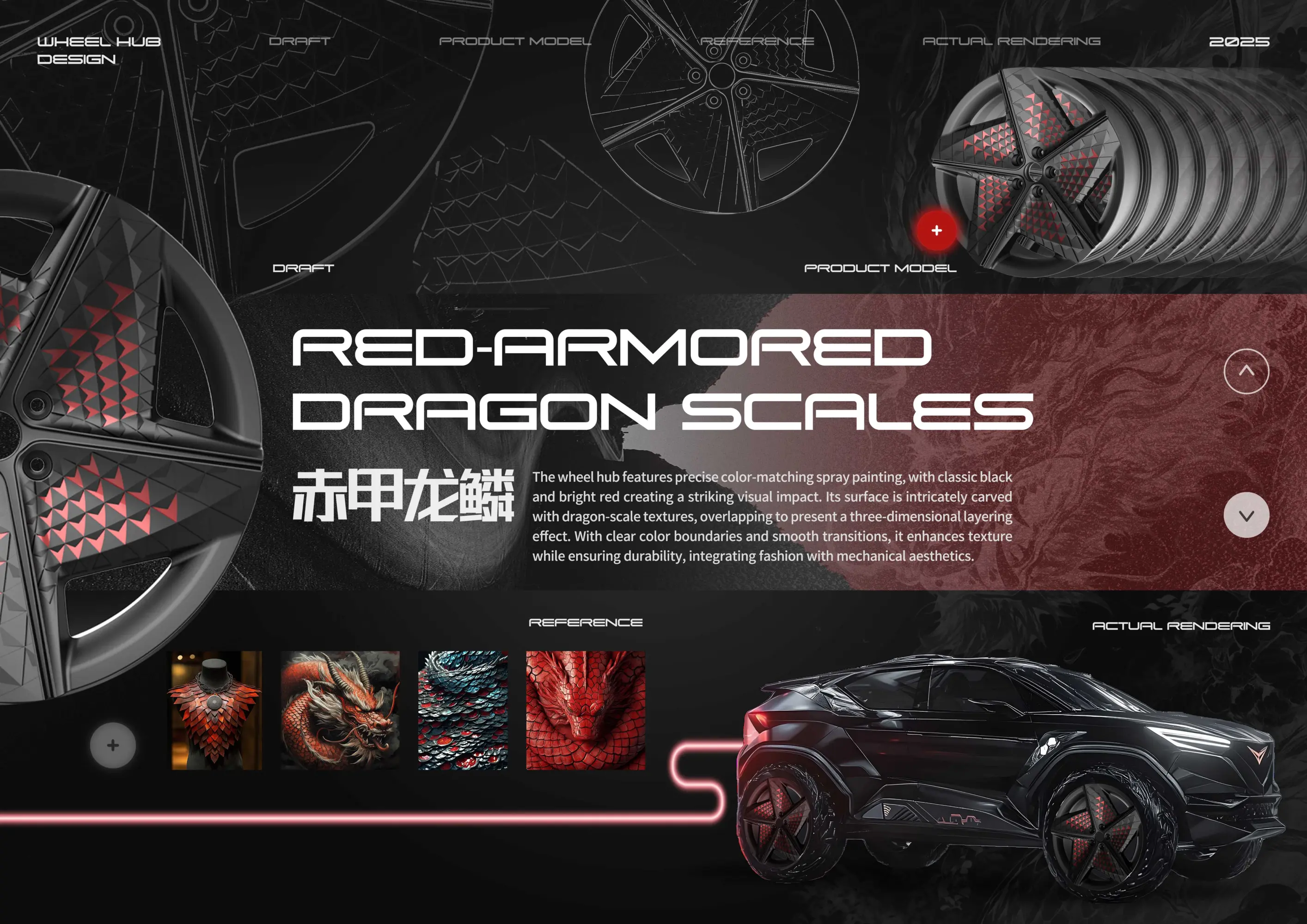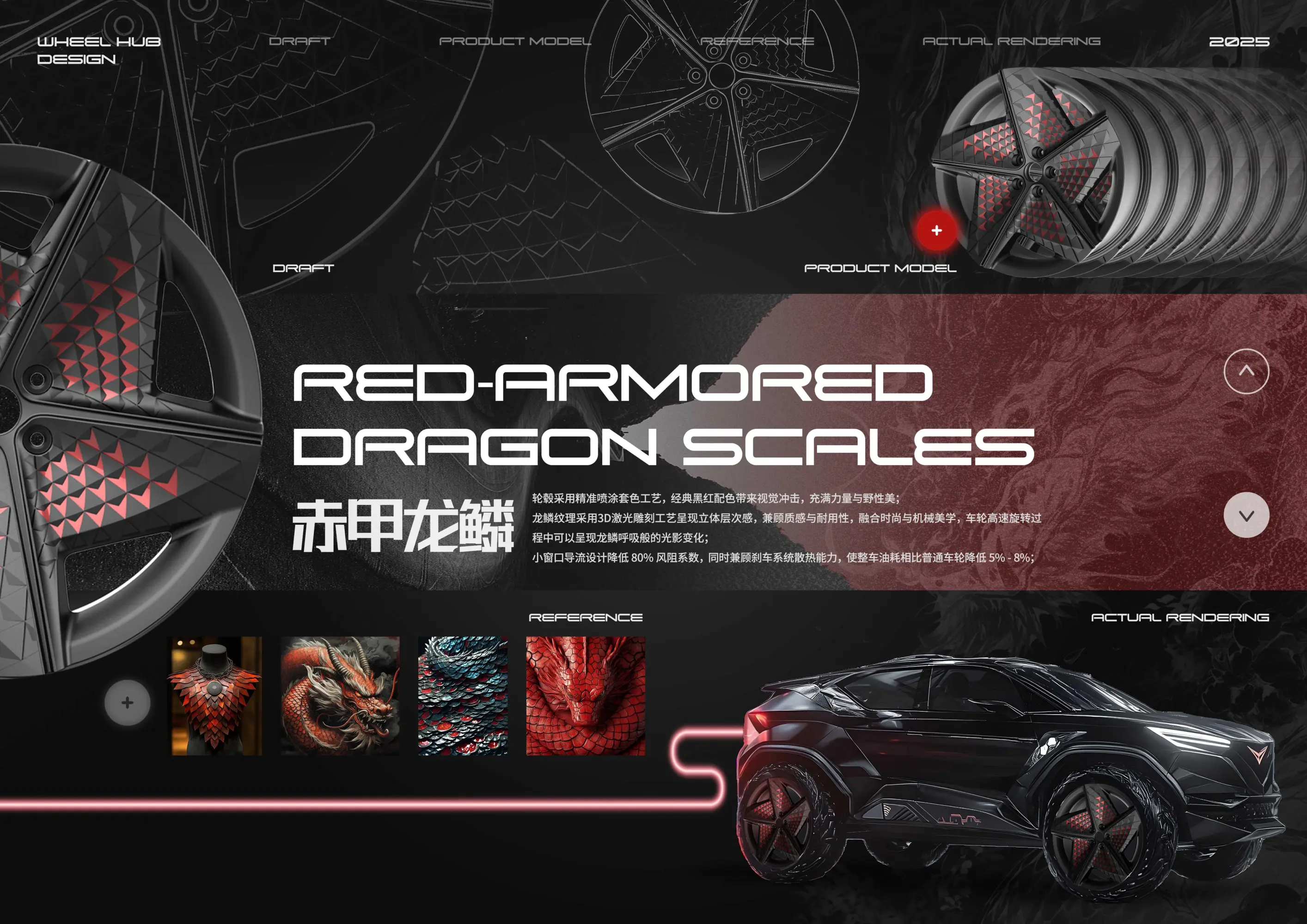 CITIC Dicastal, a leading aluminum wheel manufacturer, designed the Red Armor Dragon Scale wheel, using precise spray-painting. The classic black and red color creates a visual impact, imbued with power and wild beauty. The dragon scale texture is 3D laser-engraved, balancing quality with durability, blending fashion with mechanical aesthetics. During high-speed rotation, the wheel creates a play of light and shadow, reminiscent of the breathing of dragon scales. A small window air deflector reduces drag by 80%, while maximizing brake system heat dissipation, resulting in a 5%-8% reduction in fuel consumption compared to conventional wheels.