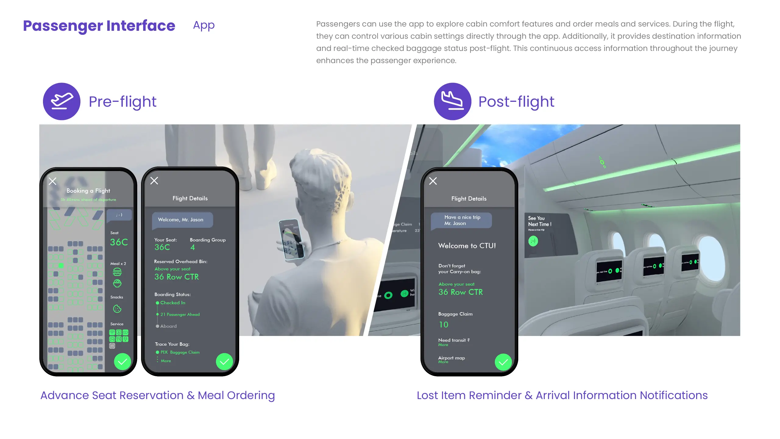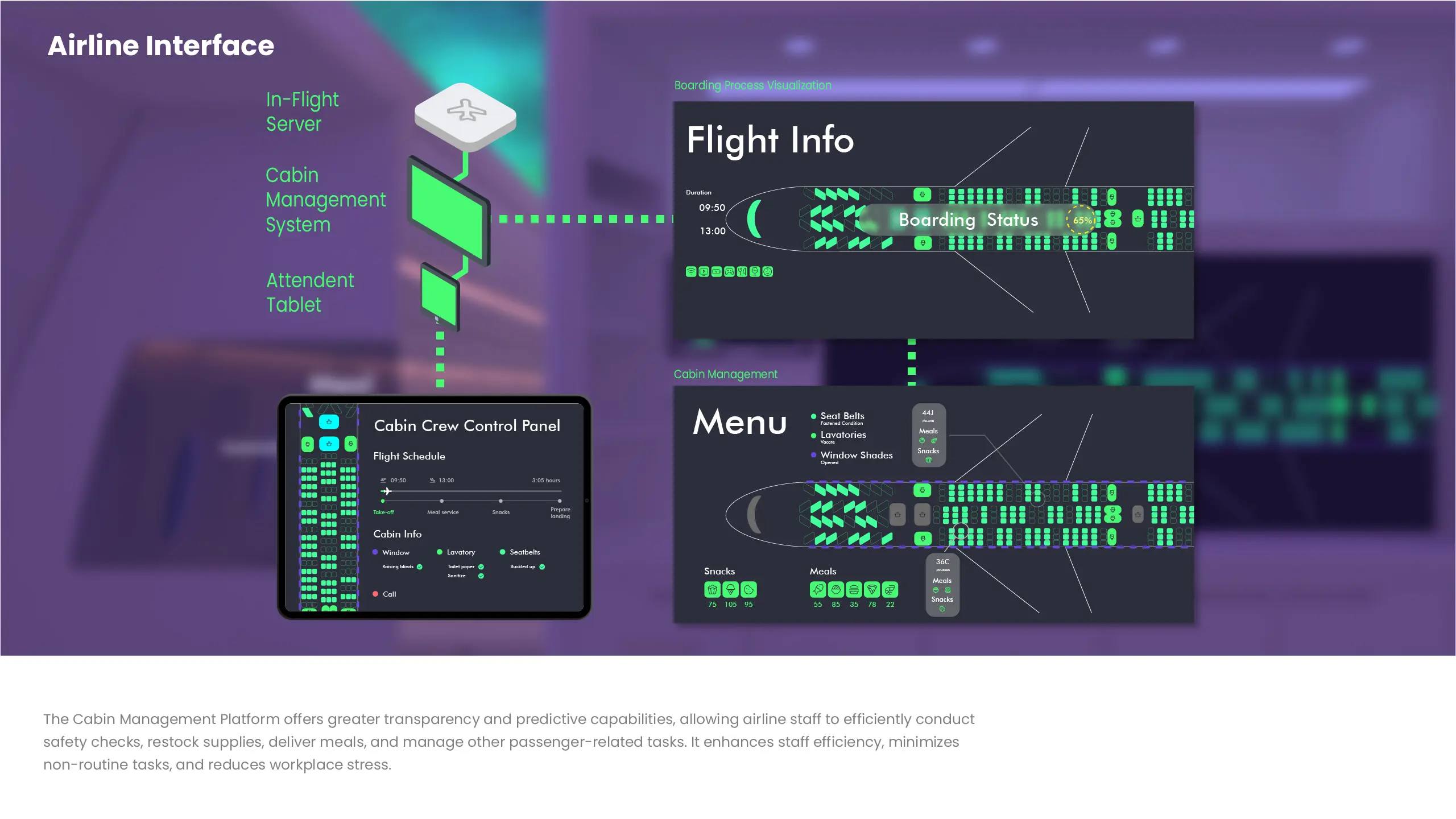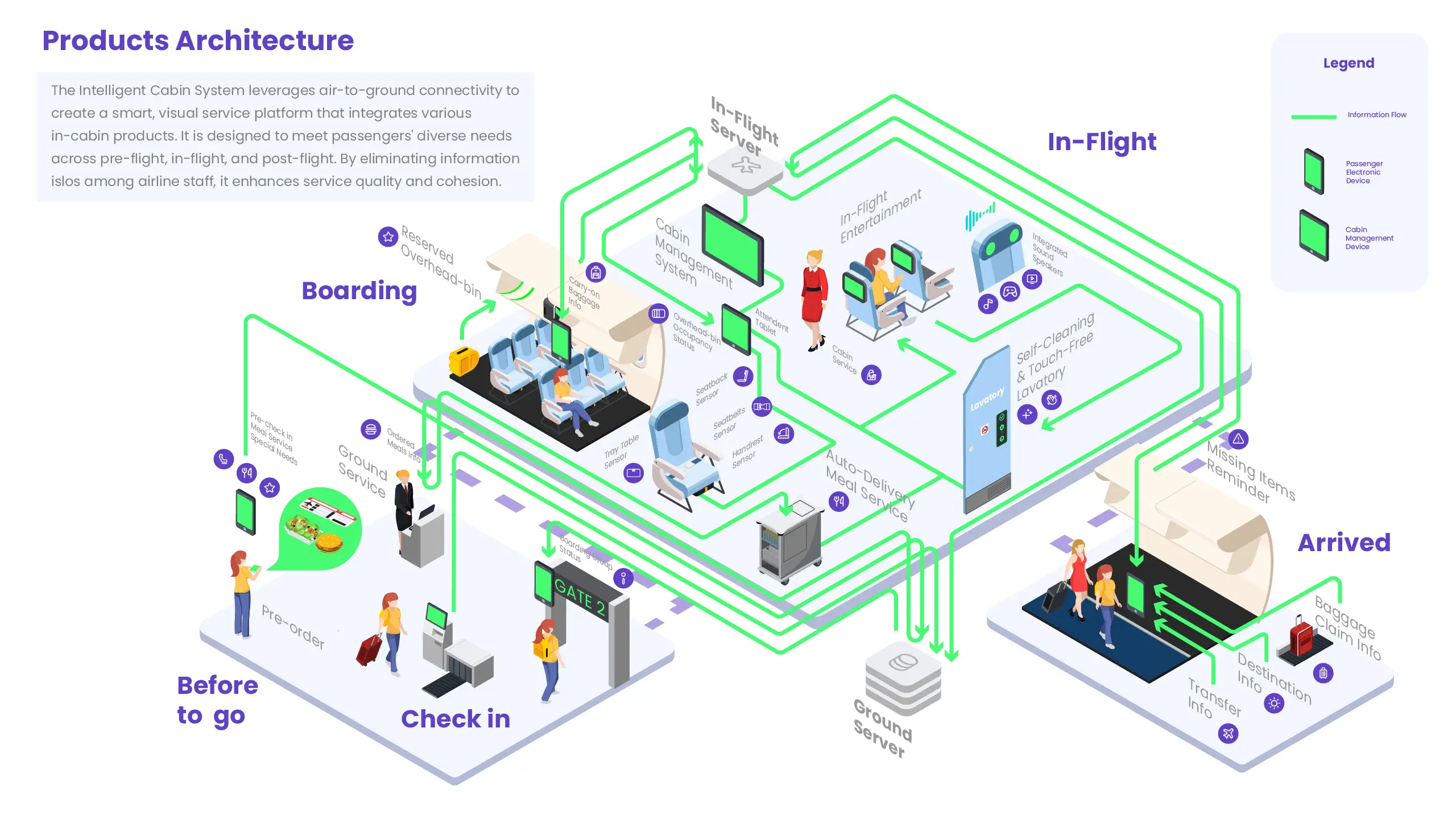 The Intelligent Cabin System is a platform crafted to elevate the in-flight experience for both passengers and airline staff. Leveraging air-to-ground connectivity, it delivers detailed, interactive information within a smart cabin environment. By analysing user experience maps to identify pain points in the in-flight journey, we propose intelligent features that enhance interactions between cabin products and passengers. The system includes a Cabin Management System, smart cabin products, and a mobile app that visualizes each stage of the journey.