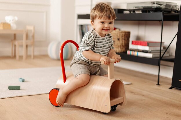 Practise their first attempts at walking and when their little legs get tired, simply sit on it and whizz off. The mix of ride-on and baby walker is great fun and will accompany your child for a long time throughout their childhood. The push bar provides a secure hold for your child's first attempts at walking. The infinitely adjustable brake system and locking of the front wheels prevent unintentional slipping. The seat of ‘Enzo’ is not only made of solid beech wood and ergonomically shaped, but is also FSC-Mix®-certified (FSC-C120795). There is a storage compartment under the seat for transporting important toys.