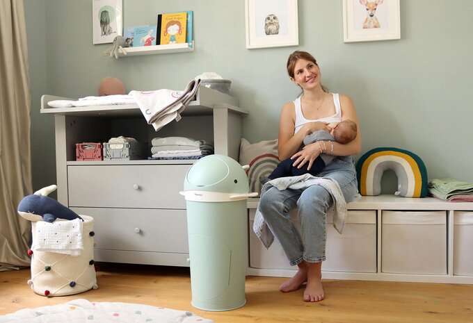 Our diaper bin completes the Kindsgut "Whale Family" and supports families from the very first diaper on their journey to potty training. It is easy to assemble and available in 8 unisex colours, making it a perfect fit for any changing area and later as a trash bin in kids rooms. The one-handed, double-flap design ensures a secure odour lock. The diaper bin can be used with eco-friendly tubing film or regular trash bags. Thanks to the optional breathable cloth diaper insert, a version is also suitable for cloth diapers, catering to different diapering styles for the first time.