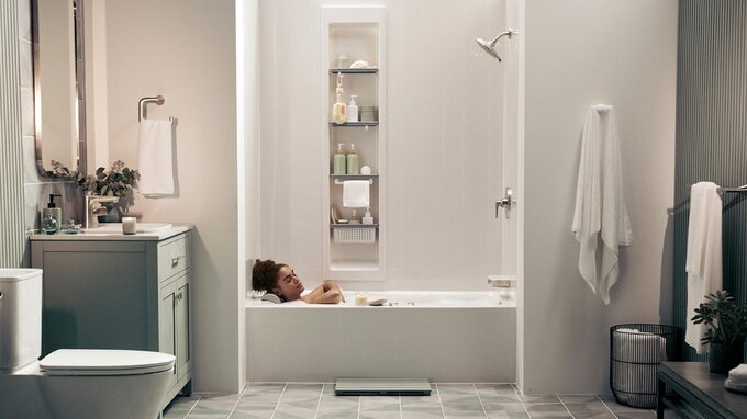 The Aspirations Bathing Environment is a complete alcove bathtub environment designed for both practicality and relaxation. From the little ones to our greatest elders, this bathing environment was designed to last a lifetime. The quiet waterfall tub spout has no sharp corners, so kids can play safely in the tub. It also creates a waterfall-like flow, releasing your daily fatigue and making you feel calm with the soothing sound of water. The push-button diverter makes switching from shower to tub easy for all to use. A wall-inserted alcove provides storage for both products and essentials within easy reach.
