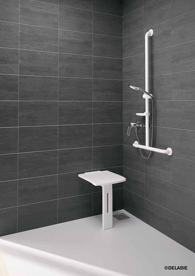 The functional lift-up shower seat with foot provides an elegant solution for barrier-free showering, combining comfort with safety. Its intergenerational design caters to a wide range of users and impresses with easy cleaning and a space-saving folding feature. The »DELABIE Lift-up Shower Seat« sets standards in durability and stability.