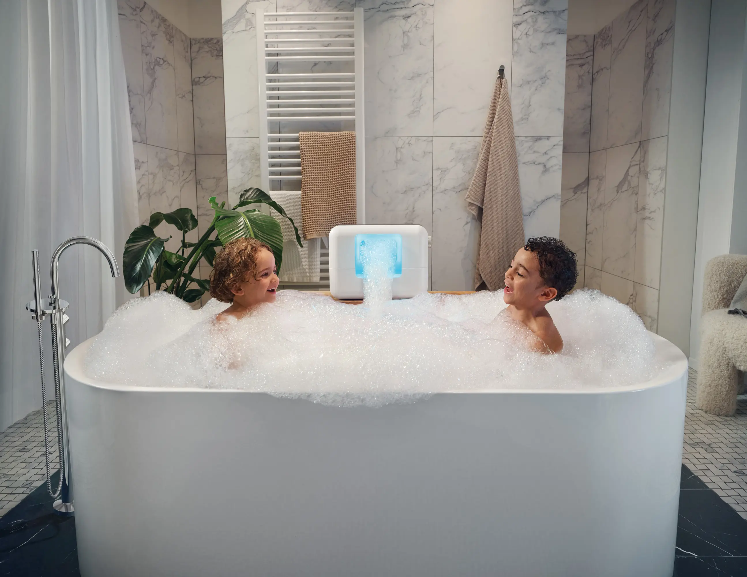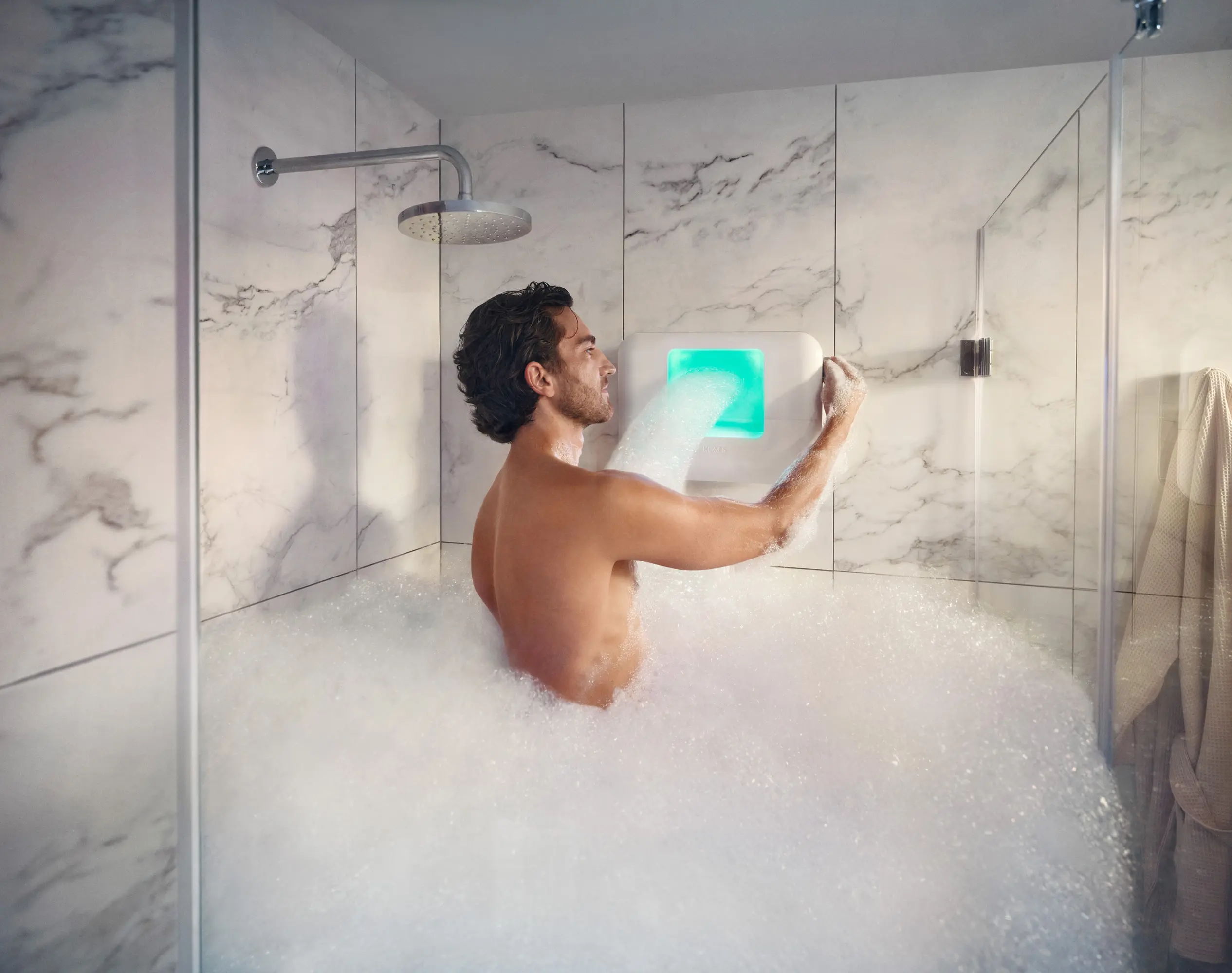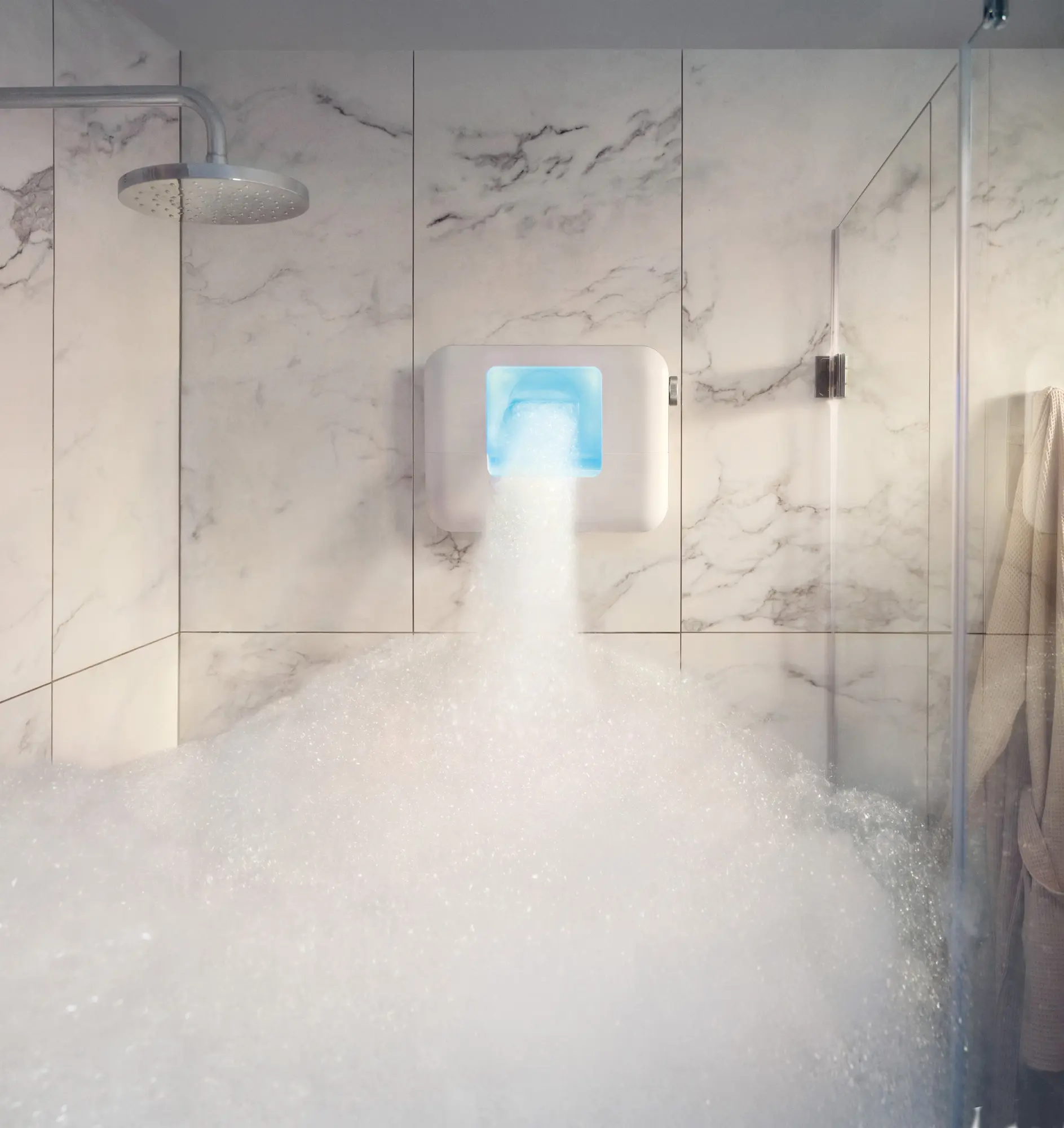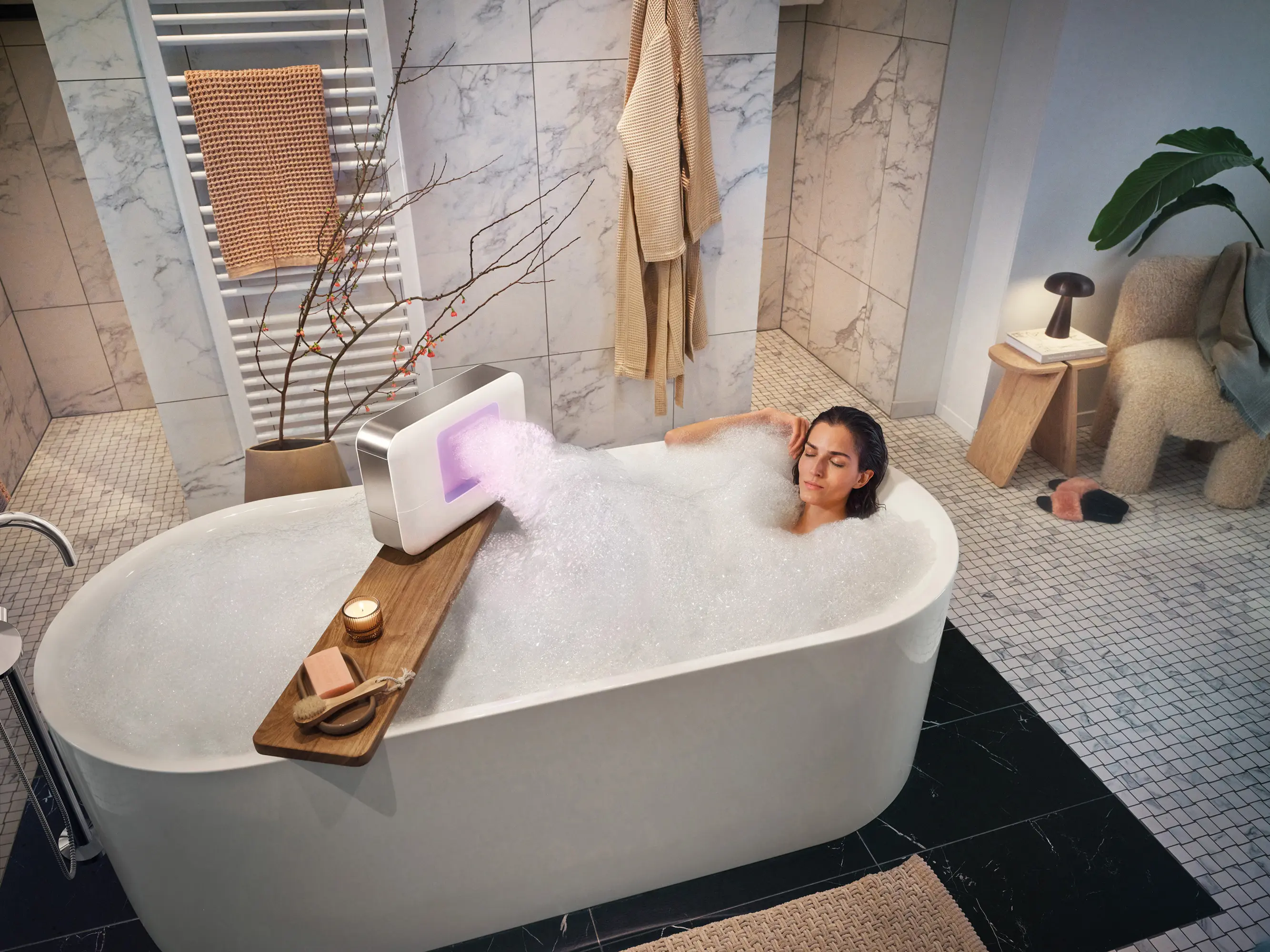 The ESPURO® CloudSPA introduces an entirely new wellness ritual: the heavenly cloud bath for your home. Thanks to its patented technology, it generates airy-soft foam (400 L/min) within seconds via a rotary dial, enveloping body and senses in a cocoon of indulgence, enhanced by atmospheric LED lighting. The specially formulated vegan foam bath essence nourishes the skin, leaving it feeling silky smooth. Compact and cordless, it transforms your bathtub, shower, or any other space into a personal spa. Pure relaxation, playful joy, and a daily self-care routine are guaranteed. ESPURO® CloudSPA – Foam reinvented.
