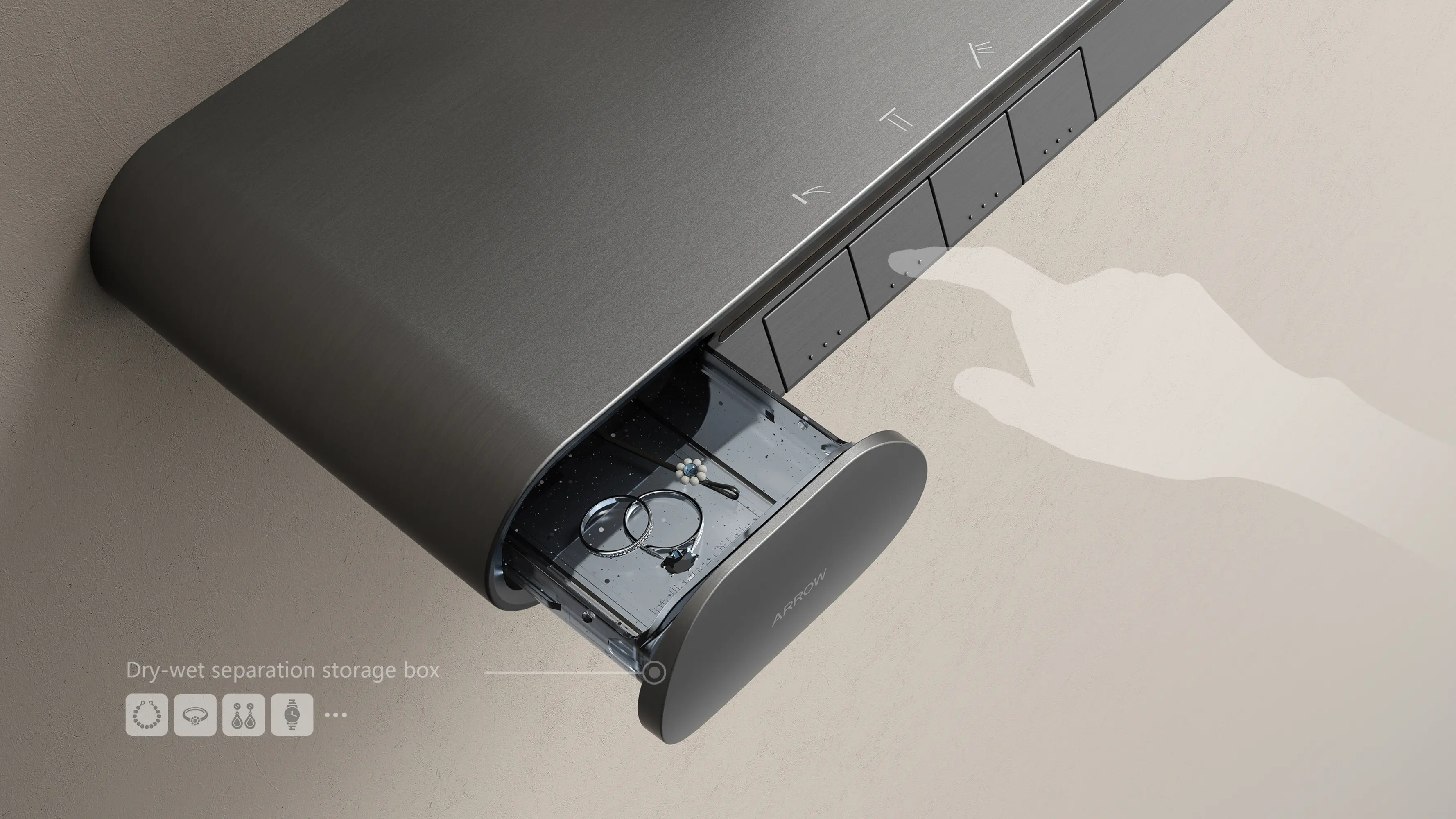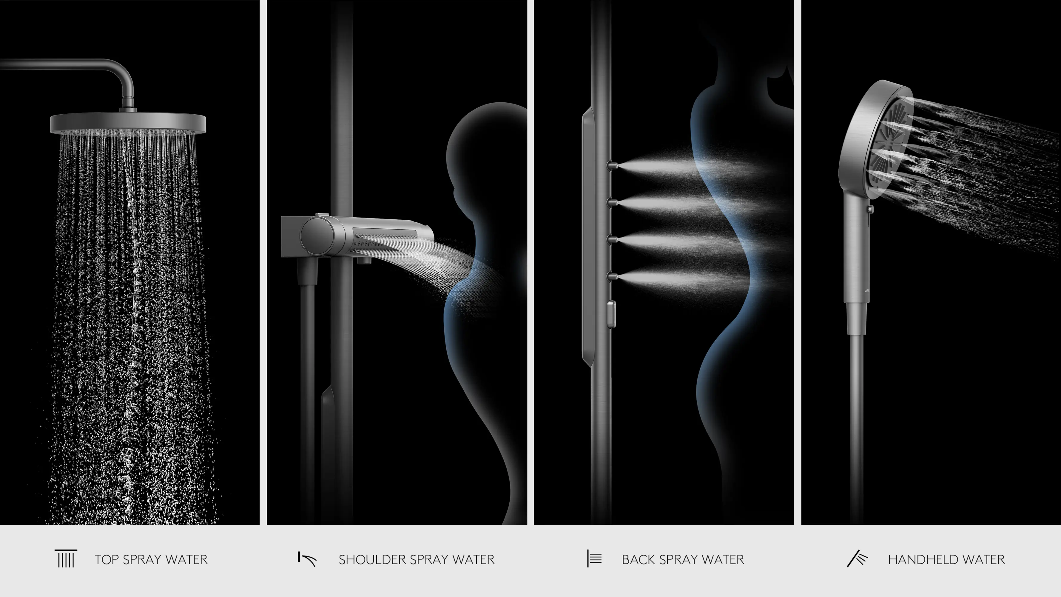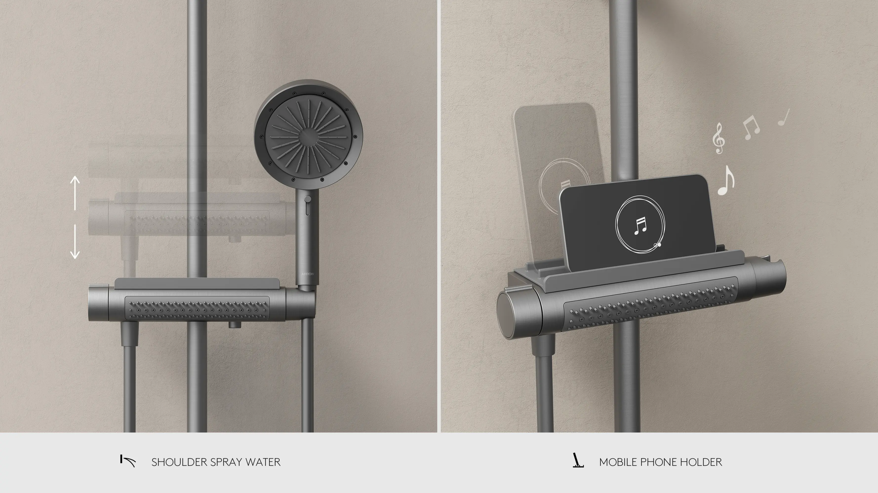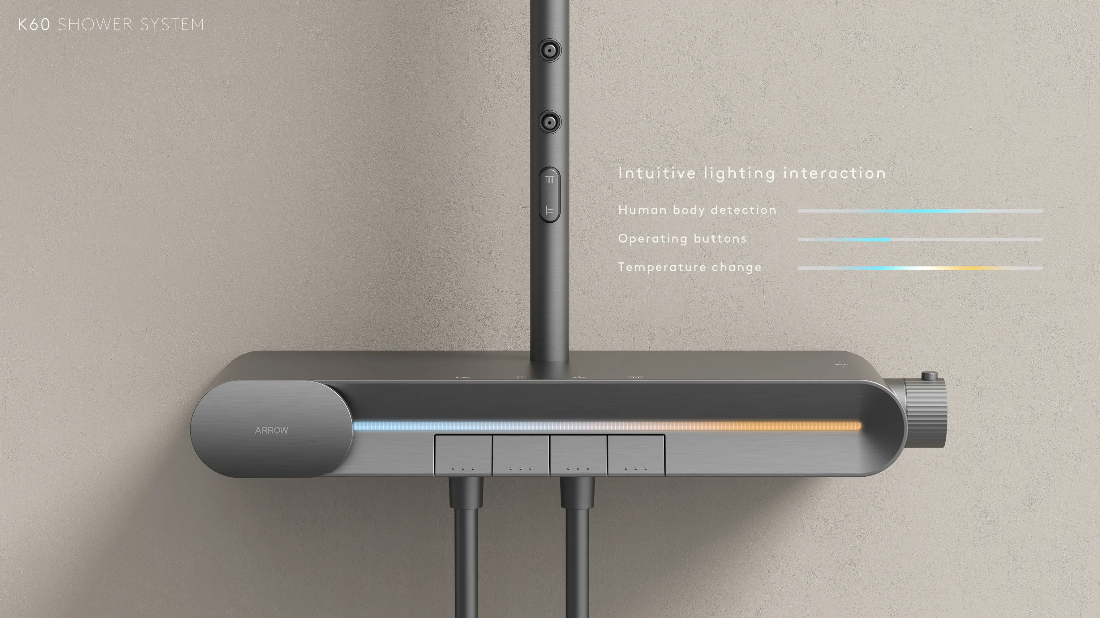 The K60 shower stands out with its multifunctional design and professional user experience. It offers various bathing water patterns, and the 3D-SPA multi-dimensional shower provides a full healing experience. Its innovative nozzle merges aerodynamics with water-saving tech, easing muscle tension and saving 30% water. Additionally, the K60 innovatively adopts a dry-wet separation storage box design to ensure items within the shower area remain neat and orderly. Shoulder sprays combined with a phone holder meet entertainment needs during showers. Lights powered by a hydro-generator show real-time water temperature in different colors.