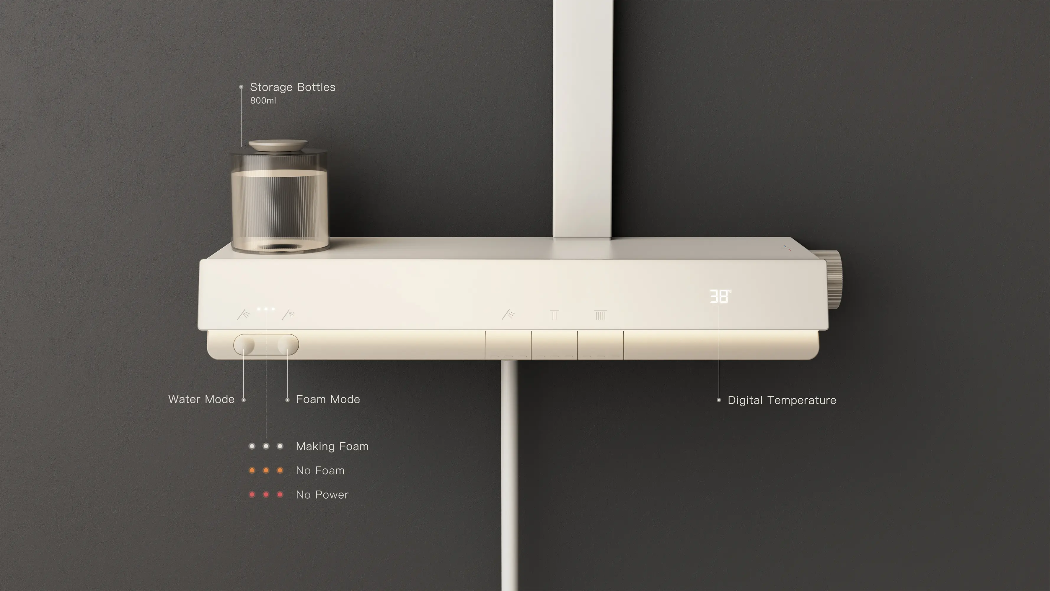 The K880-Bubble Shower System pioneers a new bathing experience. It eliminates the need to interrupt water flow for lathering. This innovative system instantly envelops your body in dense, cloud-like foam. With one button press, users seamlessly switch between luxurious foam and clean water, creating an immersive sensory journey of bubbles, water, and fragrance. Inspired by architectural design, it features sleek LED indicators providing visual feedback across three operating states. The rechargeable battery and bubble filter are easily removable for simple daily charging and cleaning.